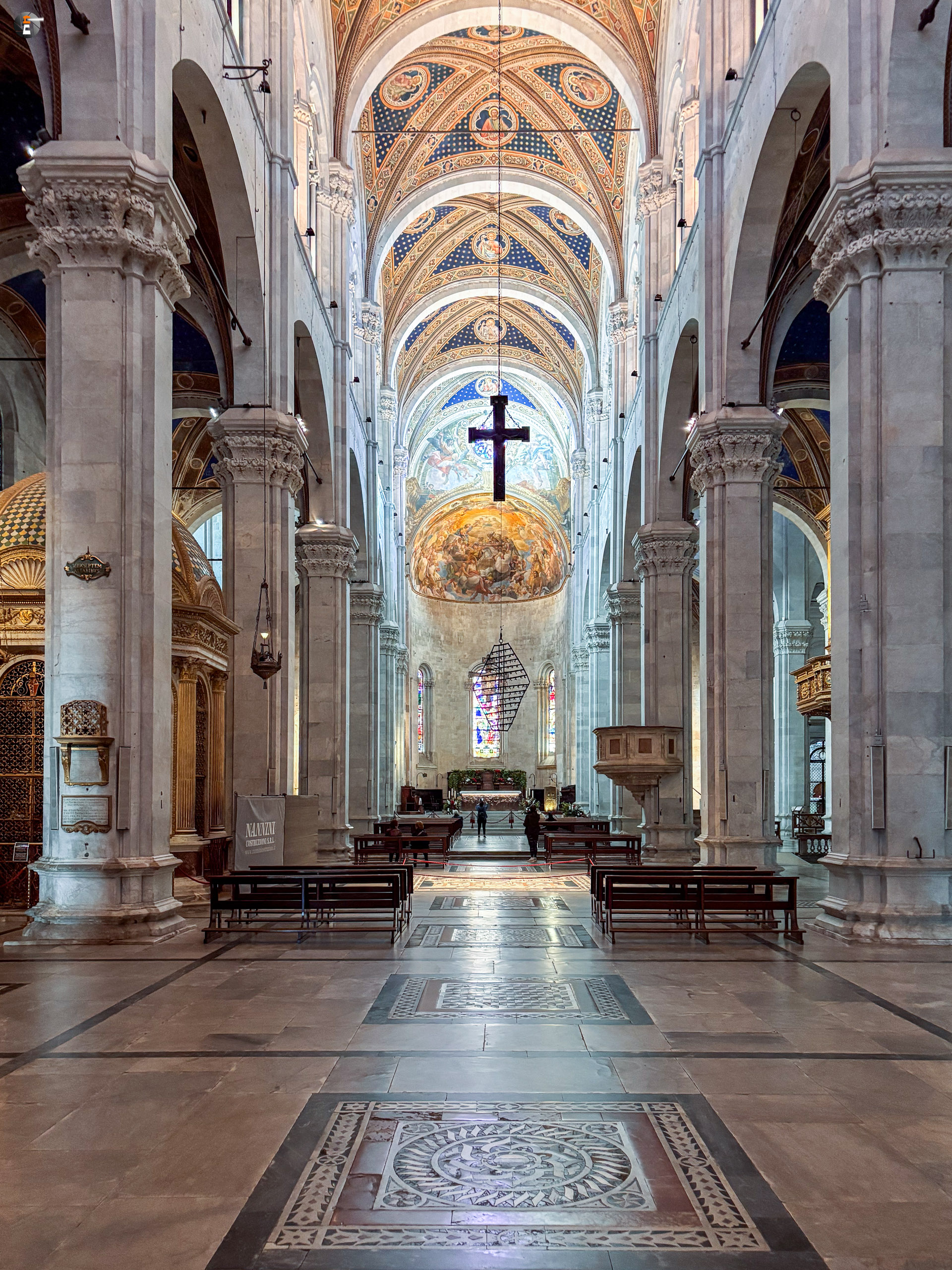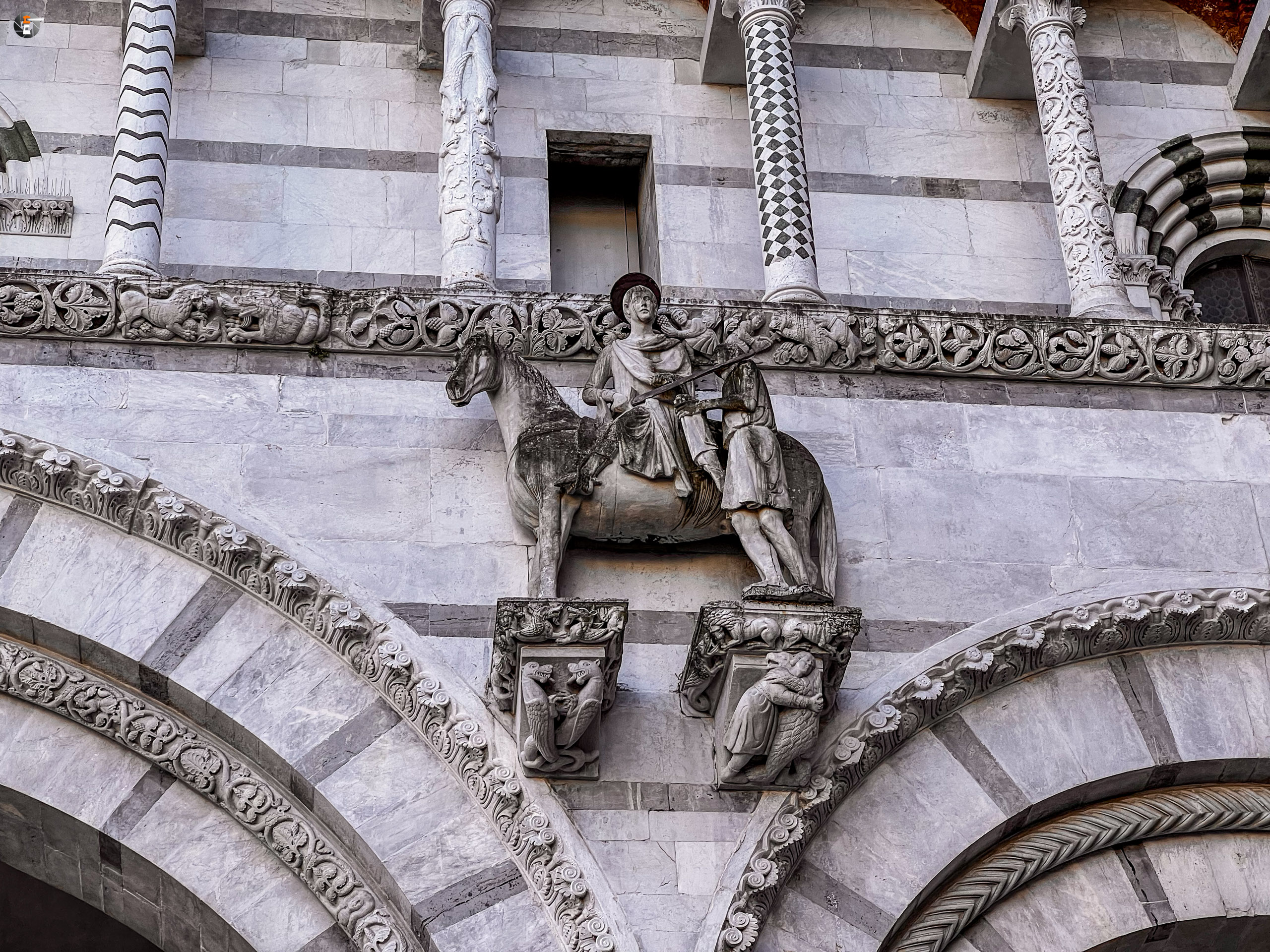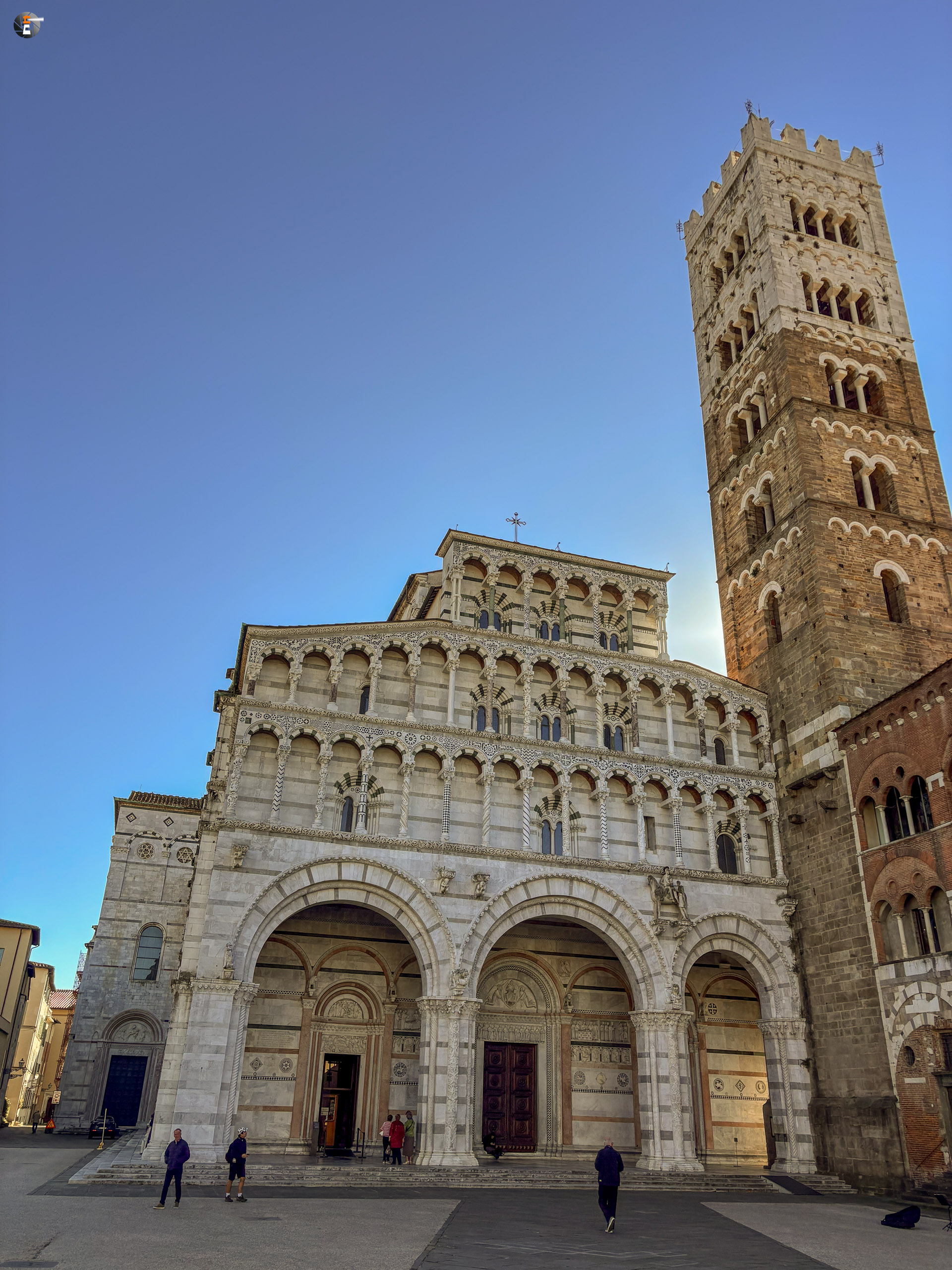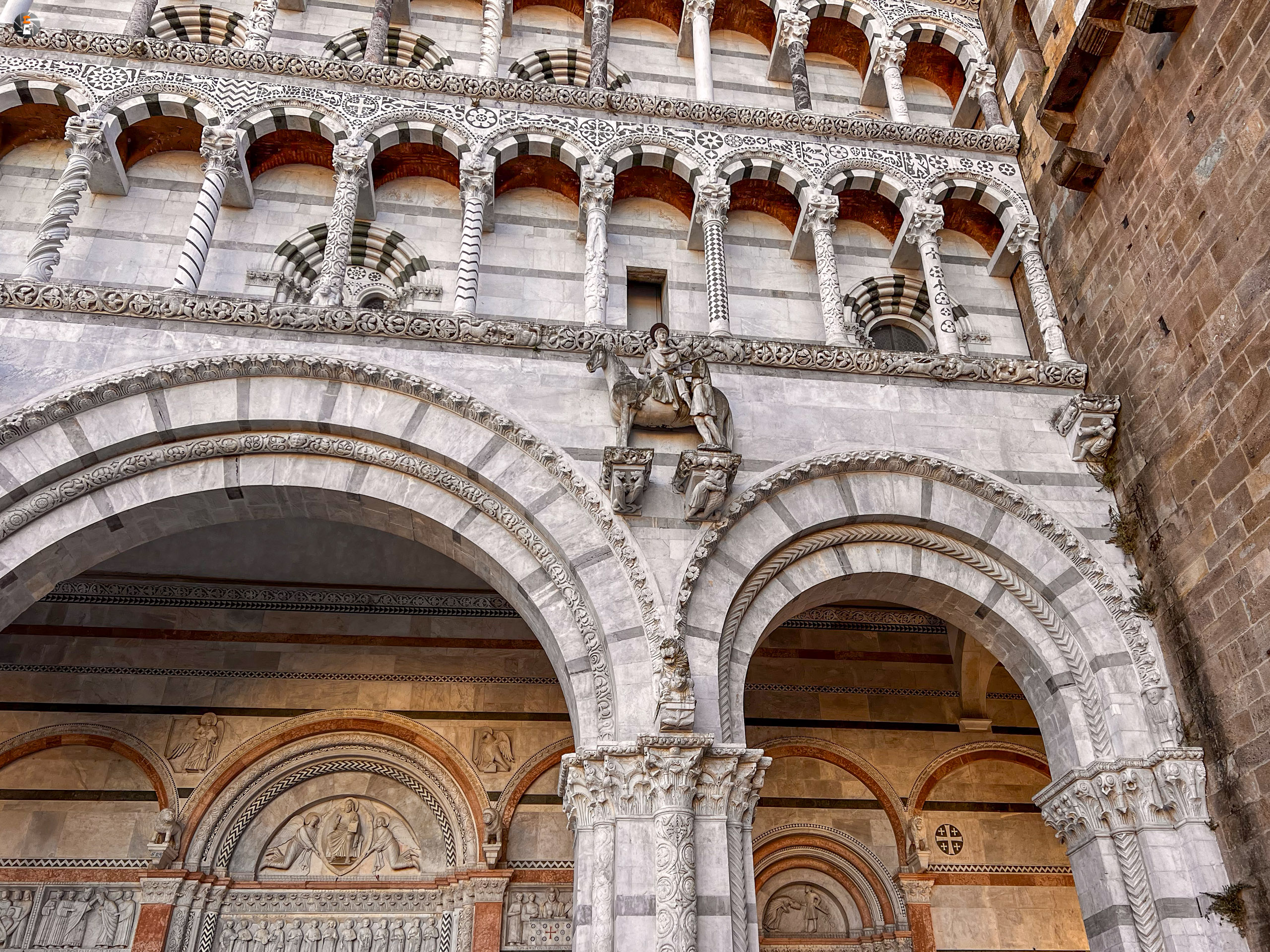 Im Anschluss packten wir die wenigen Sachen, die wir mit- und getreu unserem Motto – überall im Raum verteilt hatten, wieder in die Fahrradtaschen und drehten noch eine Runde durch Lucca. Heute wollten wir dem Hl. Martin in seinem Dom noch einen Besuch abstatten. An einem Vormittag im Oktober ist zumindest in Lucca noch nicht so viel los und so waren wir in der Kirche auch nahezu allein. Außer Sankt Martin hat die Kirche auch noch ein Fingerlabyrinth, welches sogar älter sein könnte, als jenes zum Verwechseln ähnliche in Chartres. In einem der Seitenaltäre sehen wir Tintorettos Abendmahl, anderenorts hängt so etwas in Galerien, hier findet man die Alten Meister eigentlich in jeder größeren Kirche. Außerdem ist die Luccheser Kathedrale eine der Kirchen, bei der man mit dem Portal parallel zum Kirchbau angefangen hat. Dieses steht nun also mit einem gewissen Abstand zur Kirche und hat von außen auch noch apotropäische Säulen, ein Wort, das Jens heute neu gelernt hat und deshalb unbedingt hier untergebracht werden muss 😉
