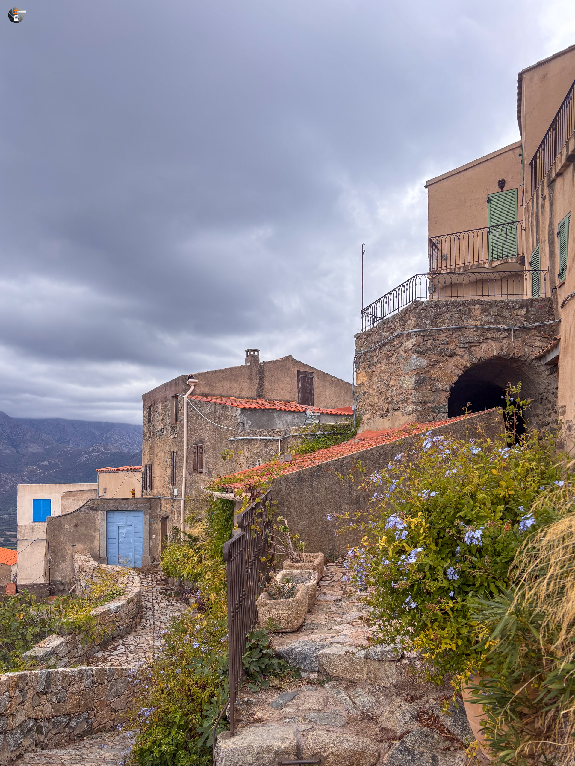 Damit der Strom mal nicht nur von unserem Auto verbraucht wird, sondern zur Abwechslung mal von unseren Fahrrädern, stand heute eine Rundfahrt durch die Bergdörfer der Balagne auf dem Programm. Unser Wirt und Hausherr briefte uns zum Frühstück noch mit einigen Tourvorschlägen. Die eine Alternative war uns eigentlich zu lang, eine andere ging uns zu viel bergauf und wieder runter. Also planten wir uns eine Mischung daraus. Unser Fehler war, dass wir uns dabei auf Google Maps verließen. Das Kartenmaterial ist abseits der Straßen ziemlich vage, sodass wir die Benutzung der Google-Maps-Wege das ein oder andere Mal verweigerten. Daraufhin wurden wir mindestens mit einem längeren Weg um den Berg herum oder höher hinaus „bestraft“. Ich habe es weder nachgemessen noch dokumentiert, am Ende war es aber wahrscheinlich weiter und hatte mehr Bergetappen als die Vorschläge heute morgen. Die Bergdörfer selbst sind schon schön anzuschauen, da das Wetter heute zwar warm aber ziemlich bewölkt war, fehlte es ein bisschen an Farben. Dafür war es auf dem Fahrrad gut auszuhalten.
