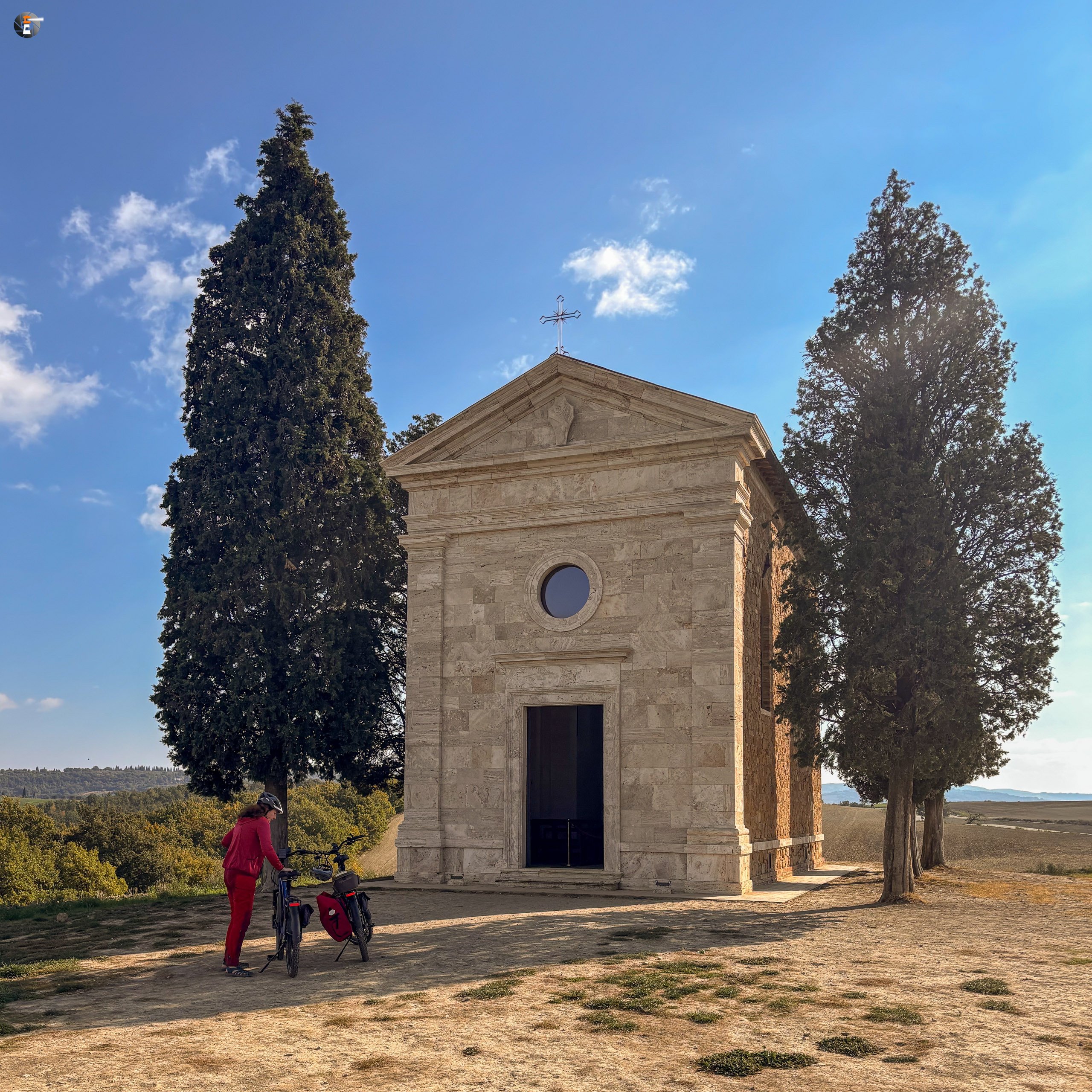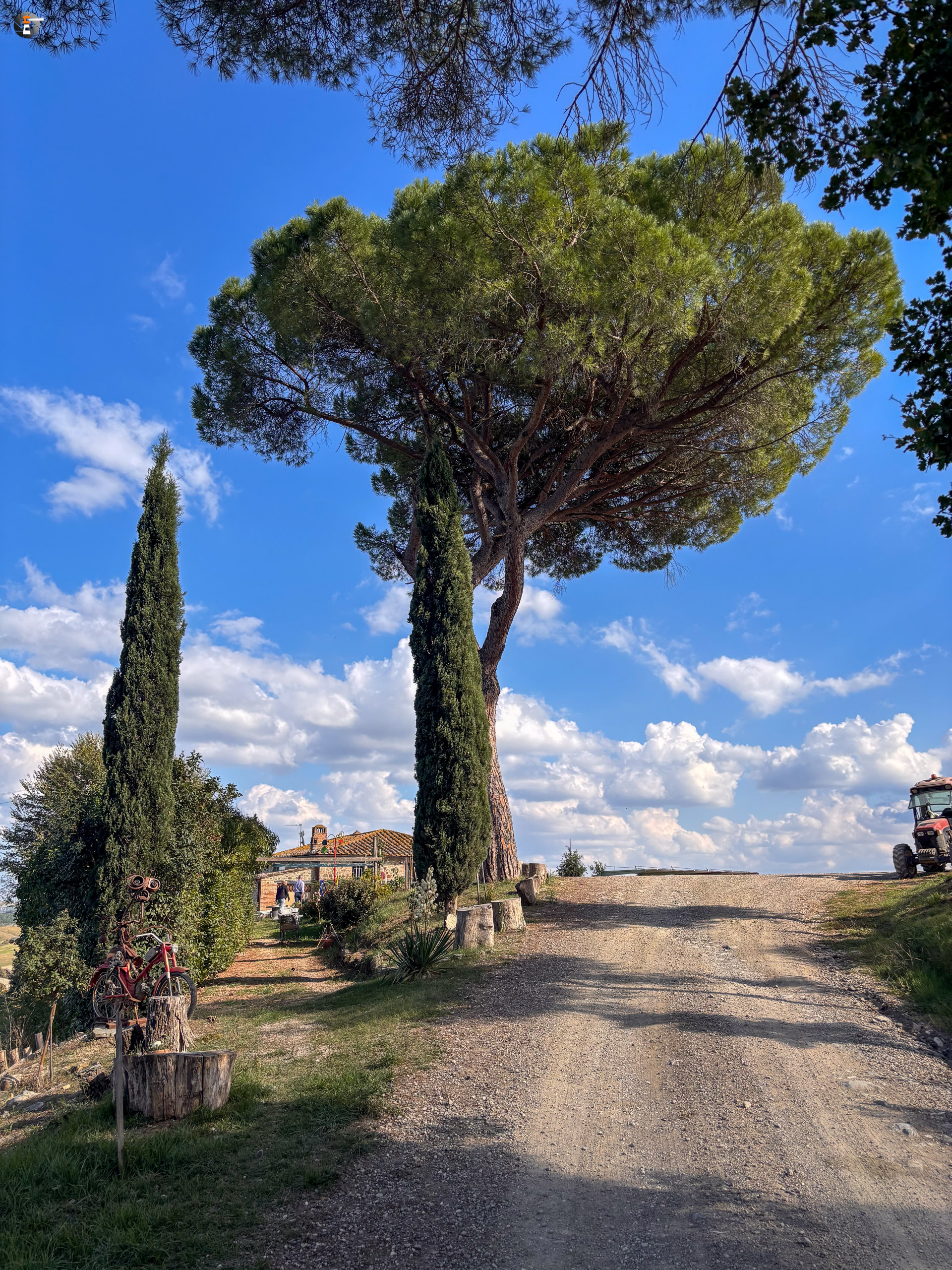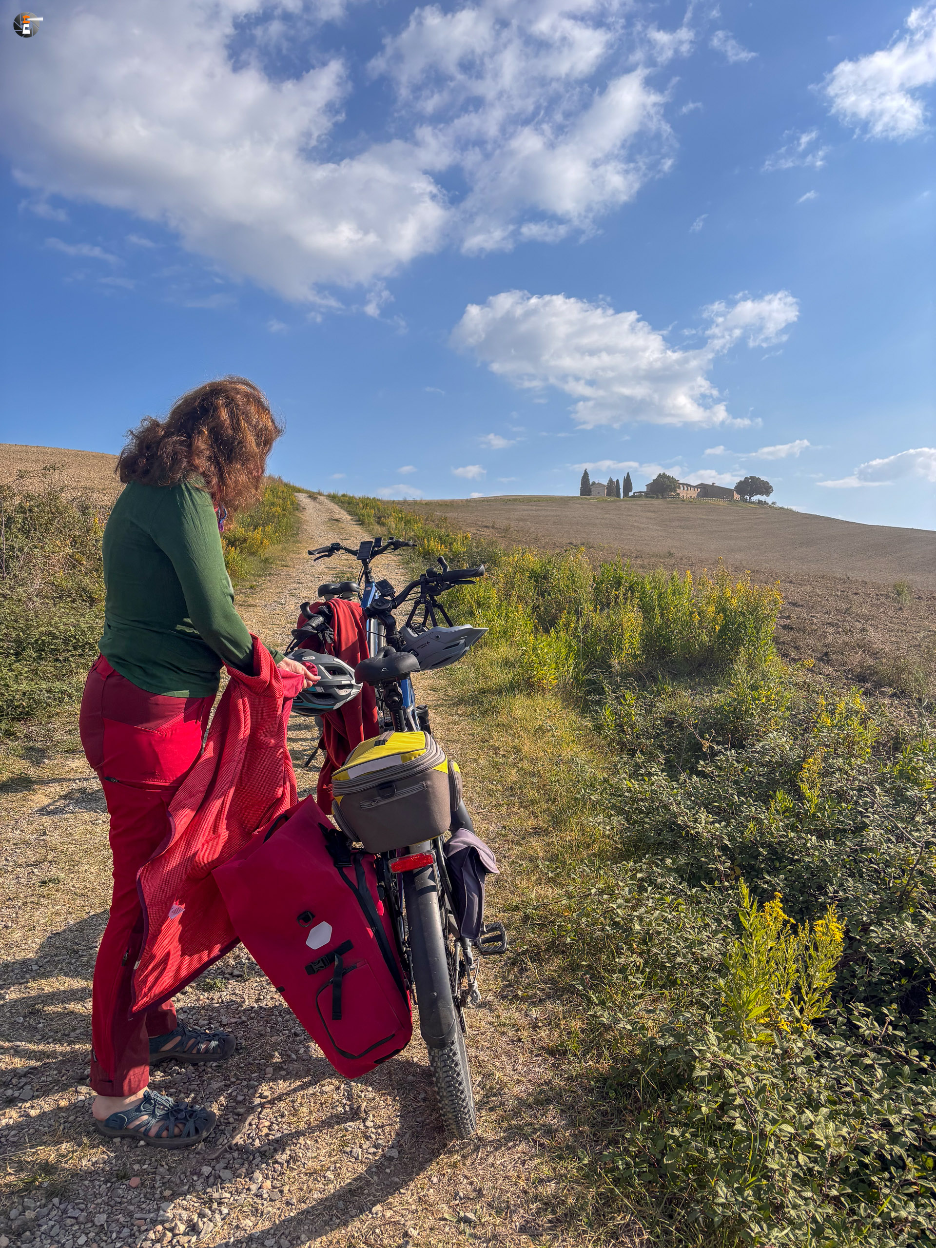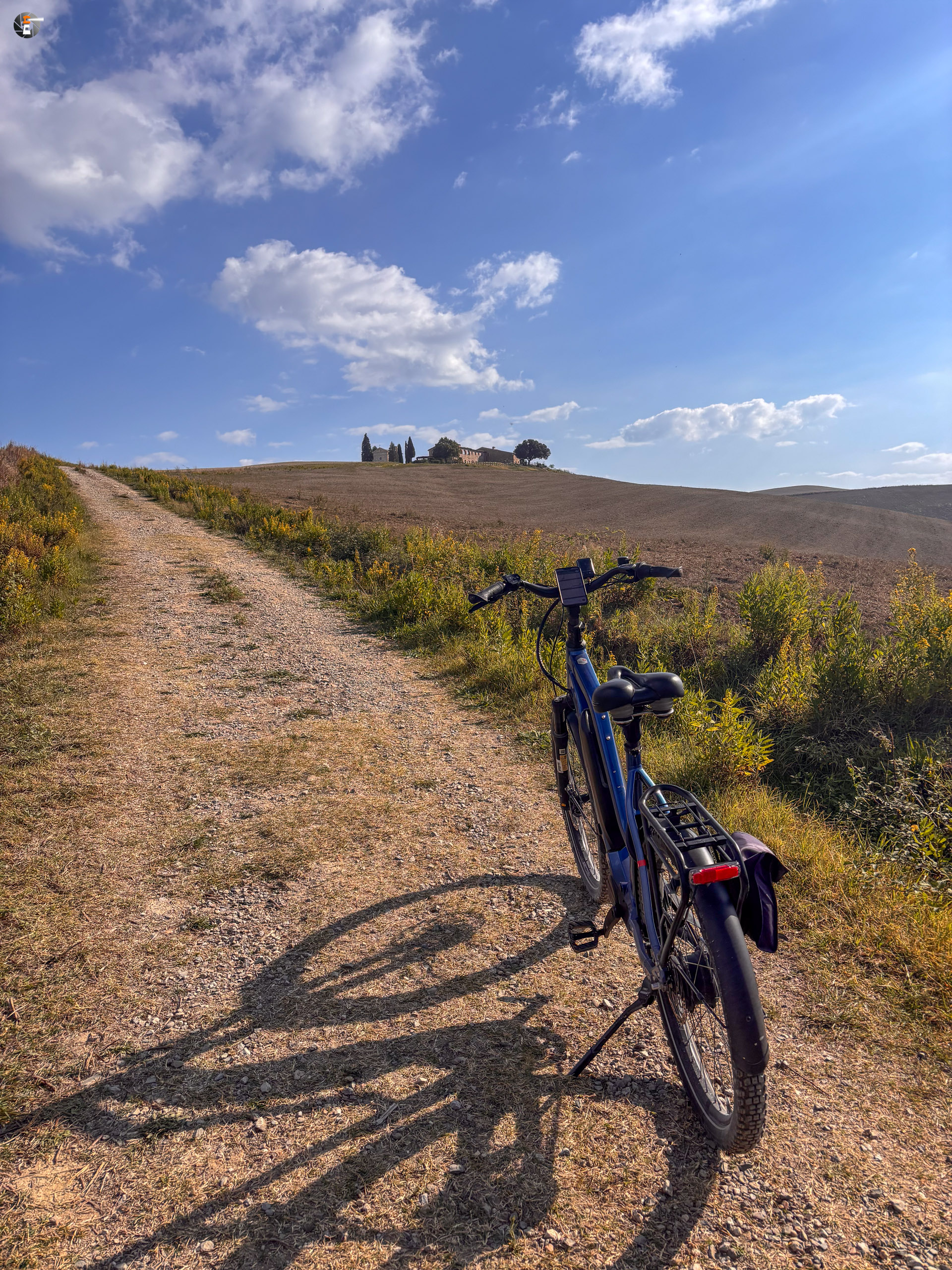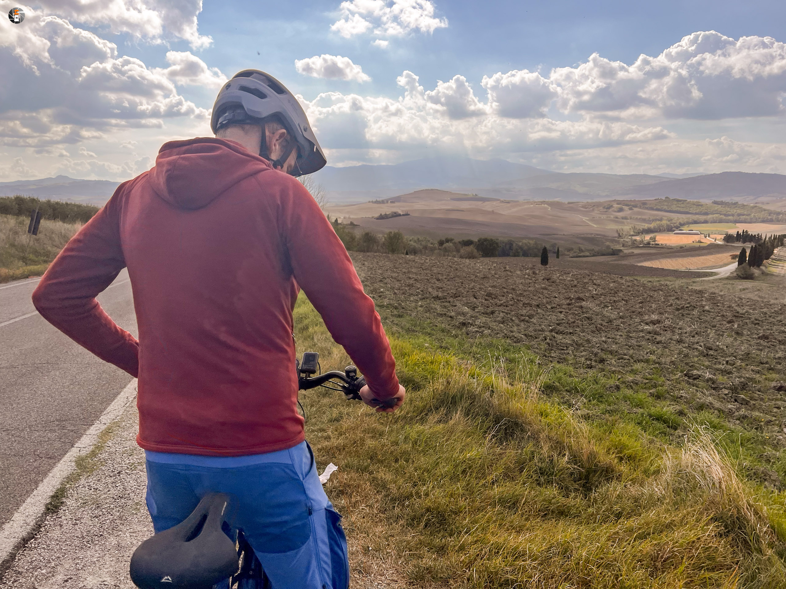 Für den heutigen Tag hatte Jens sich eine Radtour durchs Val d‘Orcia gewünscht. Also haben wir nach dem Frühstück unsere Siebensachen zusammengepackt und sind mit dem Auto nach San Quirico d’Orcia aufgebrochen. Von dort sollte uns eine Runde über die Kapelle der Madonna di Vitaleta nach Pienza, weiter nach Bagno Vignoni und wieder zurück zum Auto führen. Am Morgen lag die Toskana noch unter dichtem Nebel und so packte ich mich den 11 Grad entsprechend warm ein. Die Planung überließen wir Google und es war wie fast immer, darauf sollte man sich nicht so unbedingt verlassen 🙄 wenn man mit dem Fahrrad unterwegs ist.