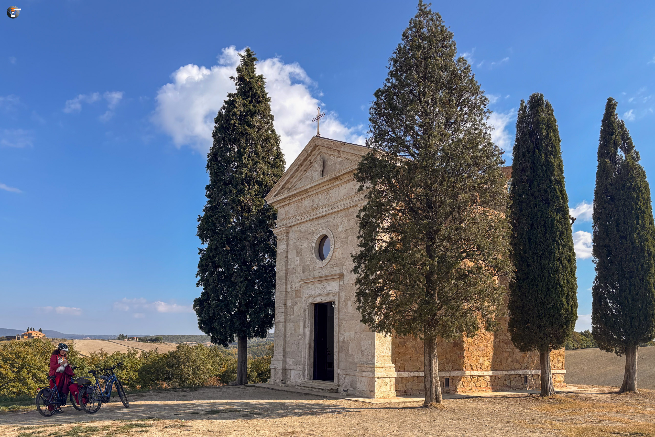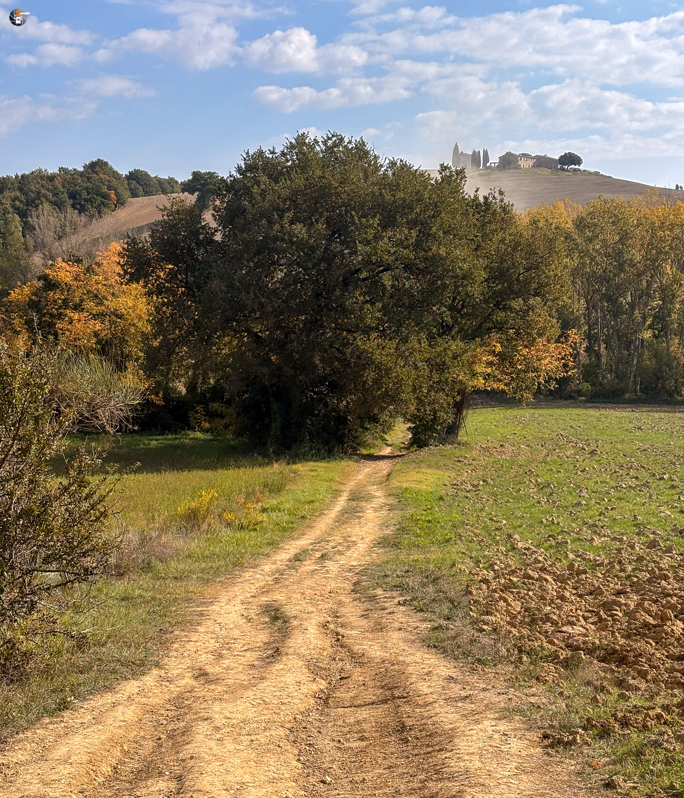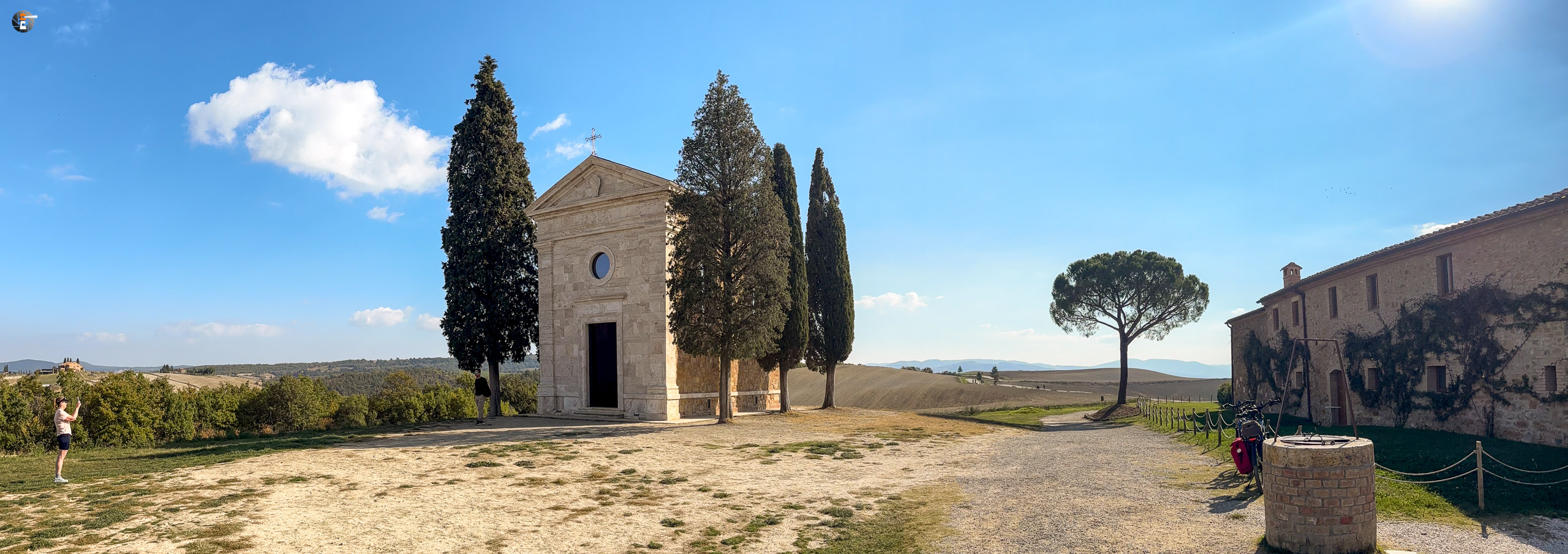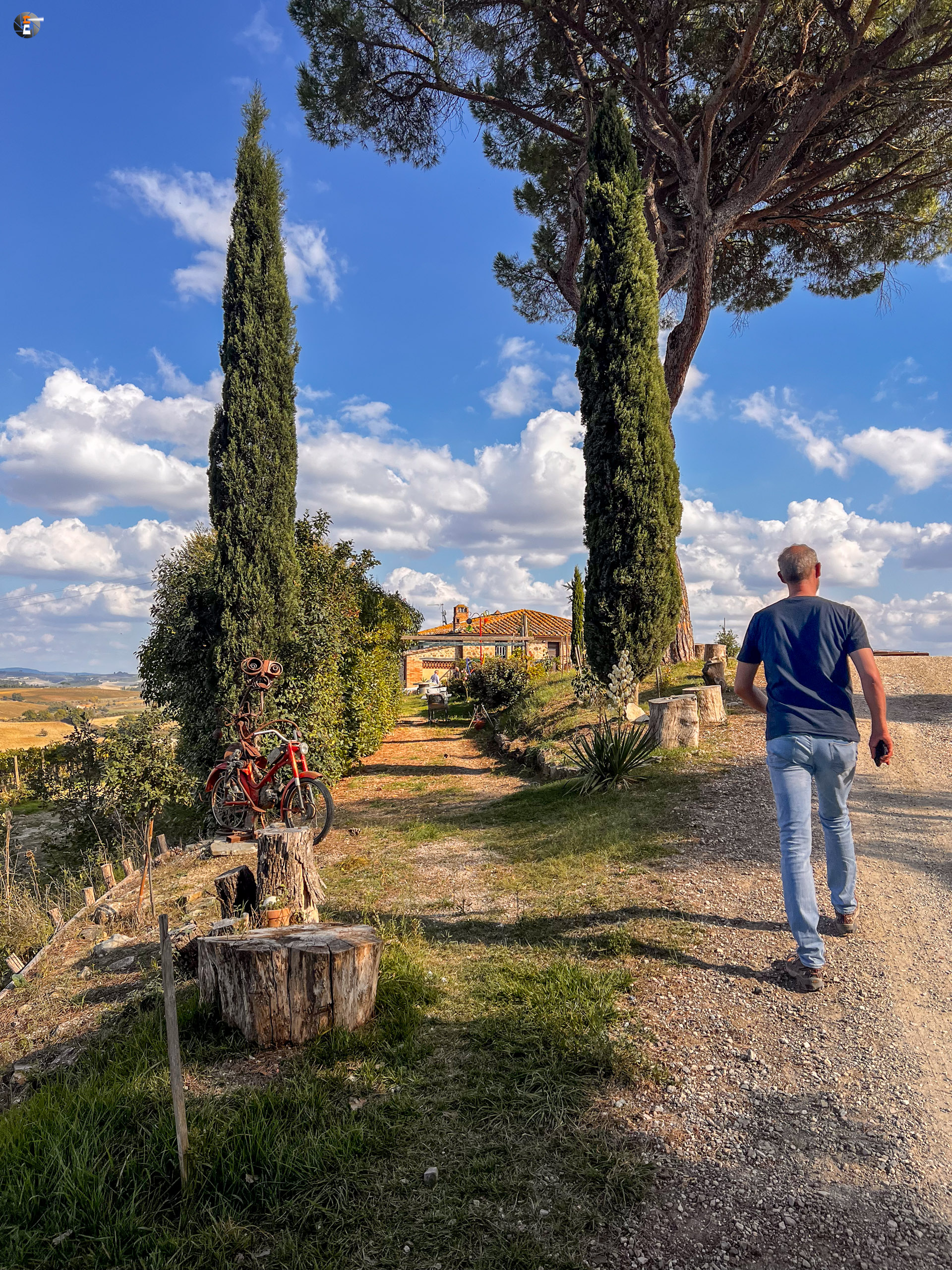 Für den heutigen Tag hatte Jens sich eine Radtour durchs Val d‘Orcia gewünscht. Also haben wir nach dem Frühstück unsere Siebensachen zusammengepackt und sind mit dem Auto nach San Quirico d’Orcia aufgebrochen. Von dort sollte uns eine Runde über die Kapelle der Madonna di Vitaleta nach Pienza, weiter nach Bagno Vignoni und wieder zurück zum Auto führen. Am Morgen lag die Toskana noch unter dichtem Nebel und so packte ich mich den 11 Grad entsprechend warm ein. Die Planung überließen wir Google und es war wie fast immer, darauf sollte man sich nicht so unbedingt verlassen 🙄 wenn man mit dem Fahrrad unterwegs ist.