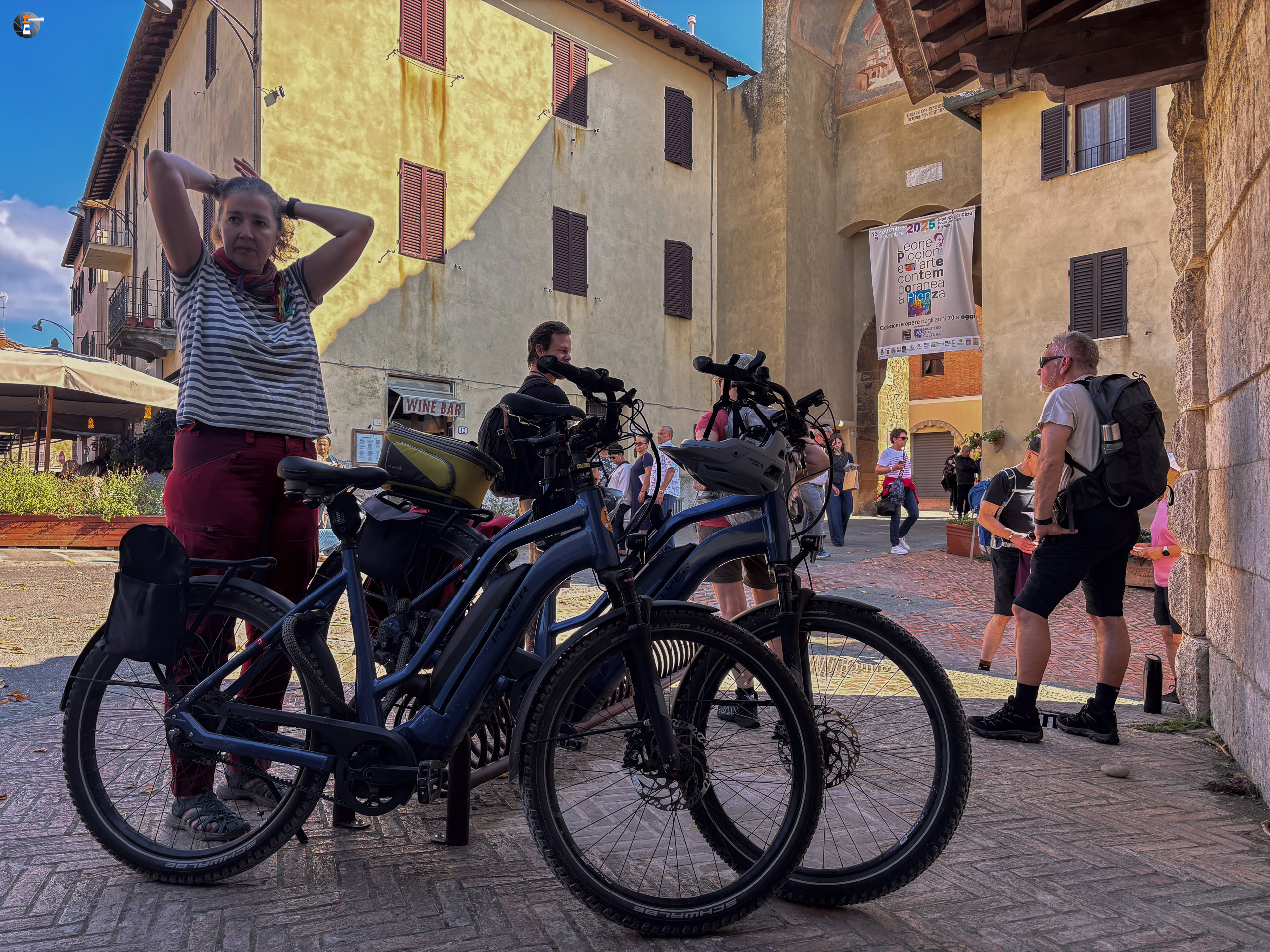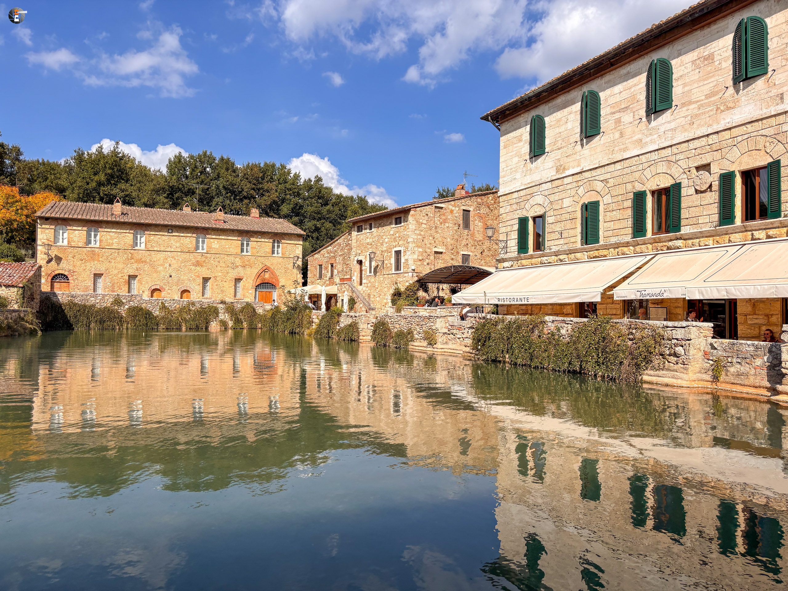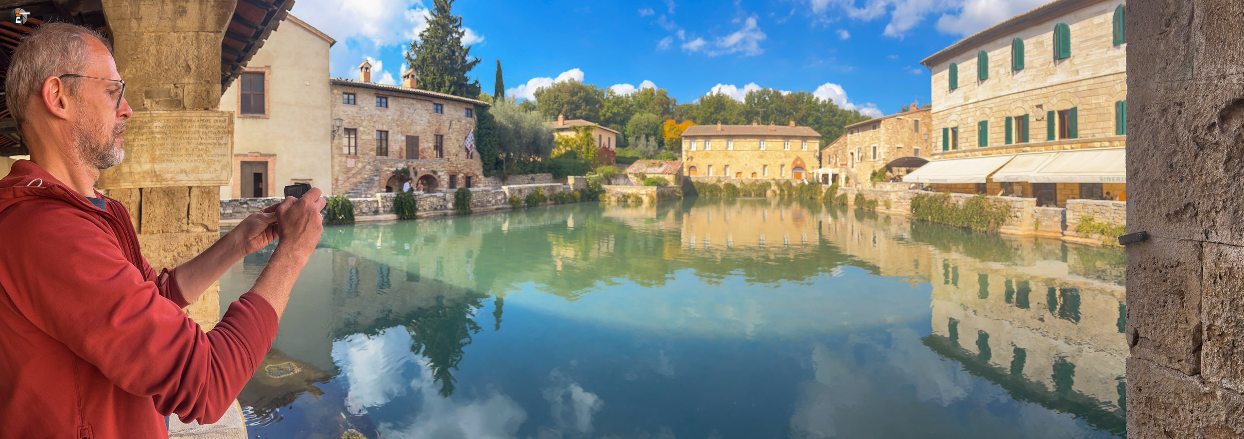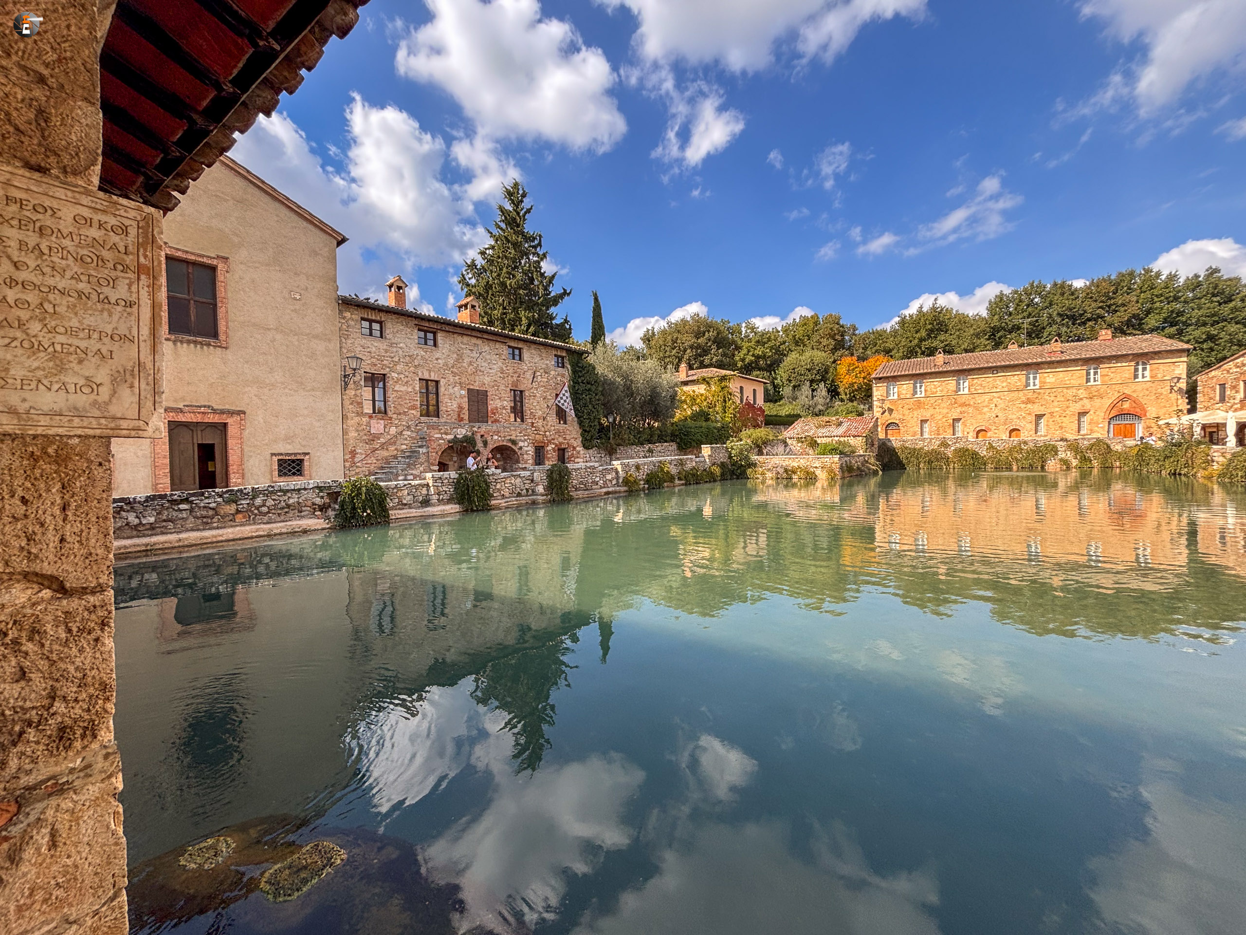 Wer mehr über Pienza wissen will, muss mal ein bisschen über Papst Pius II. lesen, dem die Stadt ihren Namen verdankt. Wir selbst wollten uns ja noch auf den Weg nach Bagno Vignoni machen und mittlerweile saß uns die Zeit ein bisschen im Nacken. 15:00 Uhr wartete nämlich auf dem Weingut eine Weinverkostung auf uns. Zugegebenermaßen eine blöde Zeit, wenn man in Ruhe eine Radtour machen will. In Bagno Vignoni selbst reichte es für uns zu einem Kaffee und einem Eis und wir schafften sogar noch eine Stippvisite an den Sinterbecken (wobei dort meine Freude am Radfahren mal wieder einen Schotterwegdämpfer erhielt).