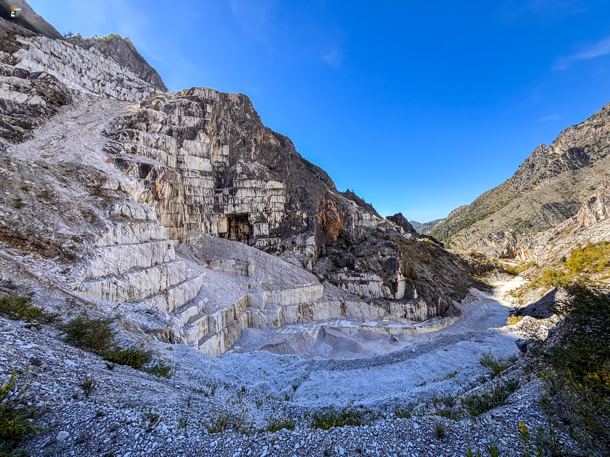 Genau diesen Steinbruch, wo Michelangelo schon arbeitete, wollen wir heute besuchen. Also eigentlich nicht diesen Steinbruch, der ist längst stillgelegt, sondern den seit den 1960er Jahren bestehenden Steinbruch im Berg. Bis heute wussten wir beide nicht, dass Marmor auch im Berg abgebaut wird. Jetzt haben wir es sogar besichtigt. Nur vier Männer arbeiten in der Marmormine Fantiscritti, um tonnenschwere Blöcke herauszuschneiden. Es ist ein Familienbetrieb, die Männer sind im wahrsten Sinne des Wortes steinreich.