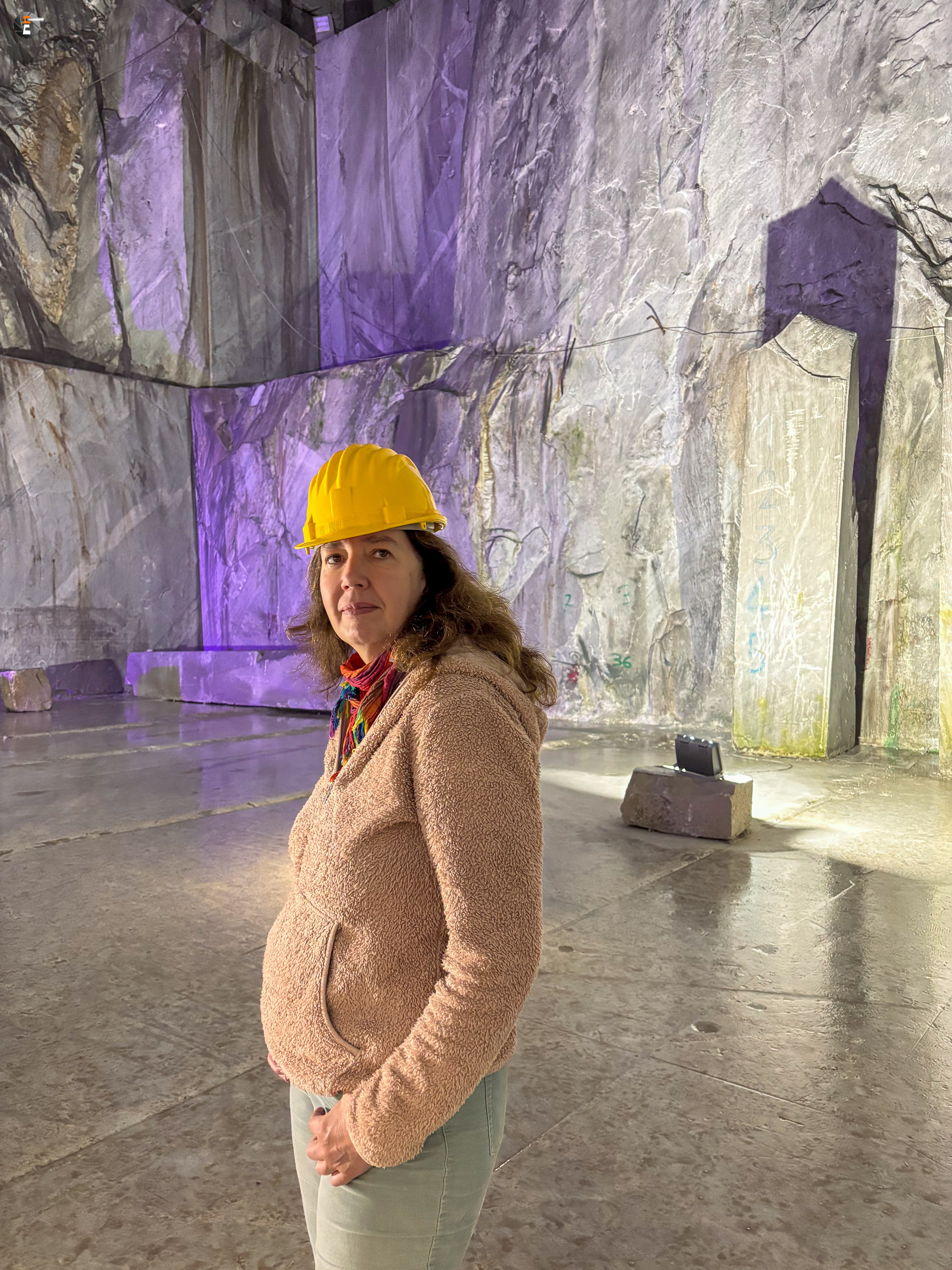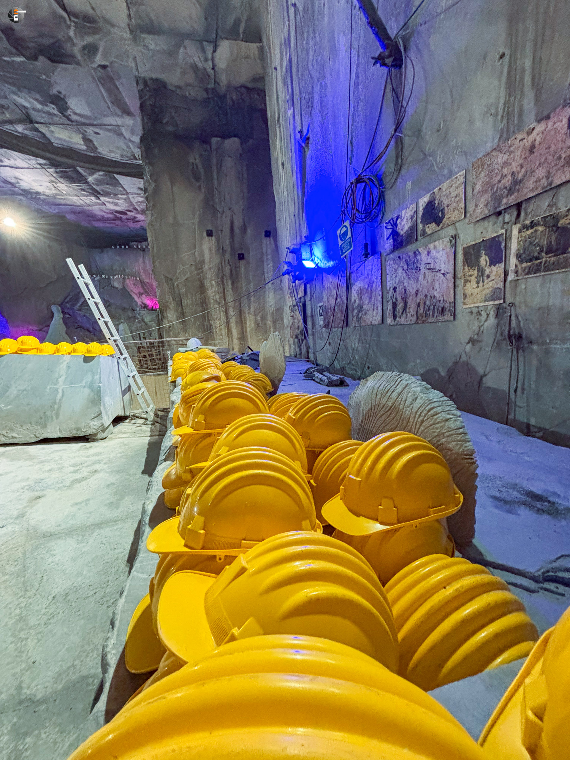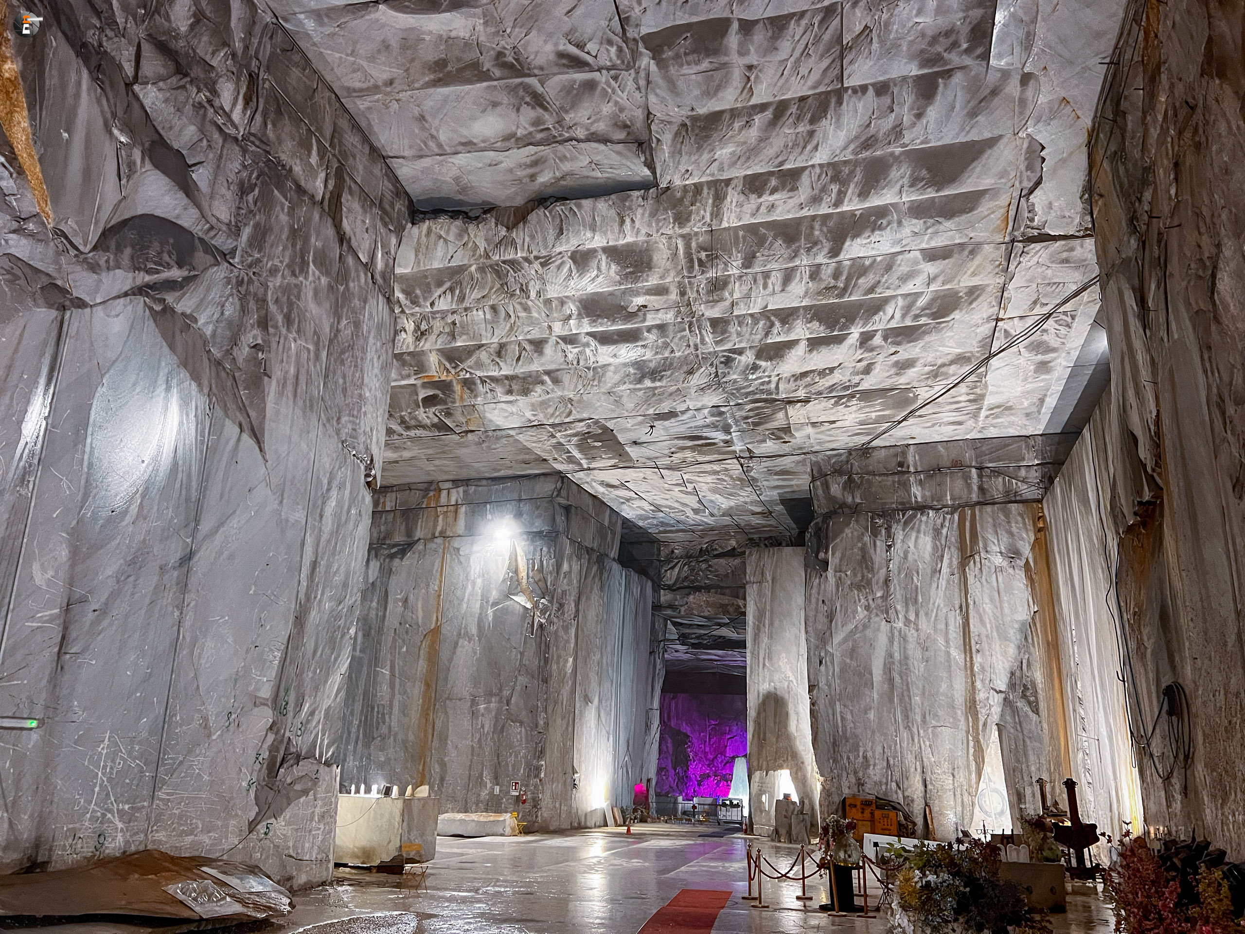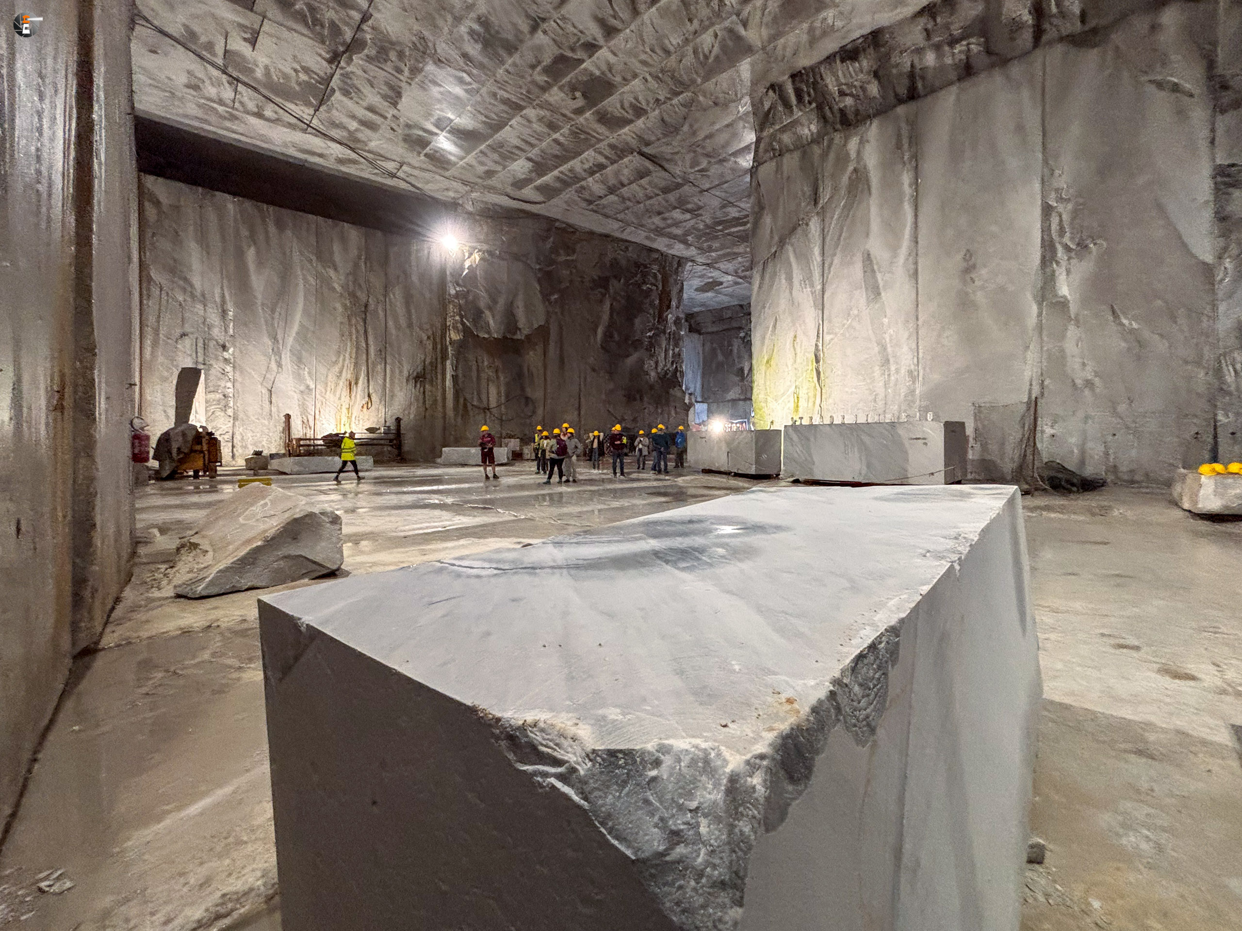 Unsere Führung dauert eine knappe Stunde. Wir wurden mit einem Kleinbus von Süden hereingefahren, von Norden hätte man mit dem eigenen Auto einfahren können. Wir standen sogar draußen vor dem Portal, hatten aber keine Möglichkeit uns anzumelden. Das ging nur via Whats App – was wir ablehnen. Das wird inzwischen manchmal echt schwierig. So fuhren wir um den Berg herum zum anderen Eingang und konnten bei einer leibhaftigen Menschin zwei Tickets lösen, wurden 15 Minuten später abgeholt und etwa 600 Meter weit in den Berg gebracht, genau bis in die Mitte, dorthin, wo das weiße Gold mit Diamanten aus dem Berg gesägt wird. Es ist immer nur Calciumcarbonat, trotzdem variiert der Preis pro Tonne zwischen 200 und 20.000€, je nach Farbe und Maserung. Das Farbspiel reicht von grau bis weiß. Je langweiliger (reines Weiß), desto teurer.