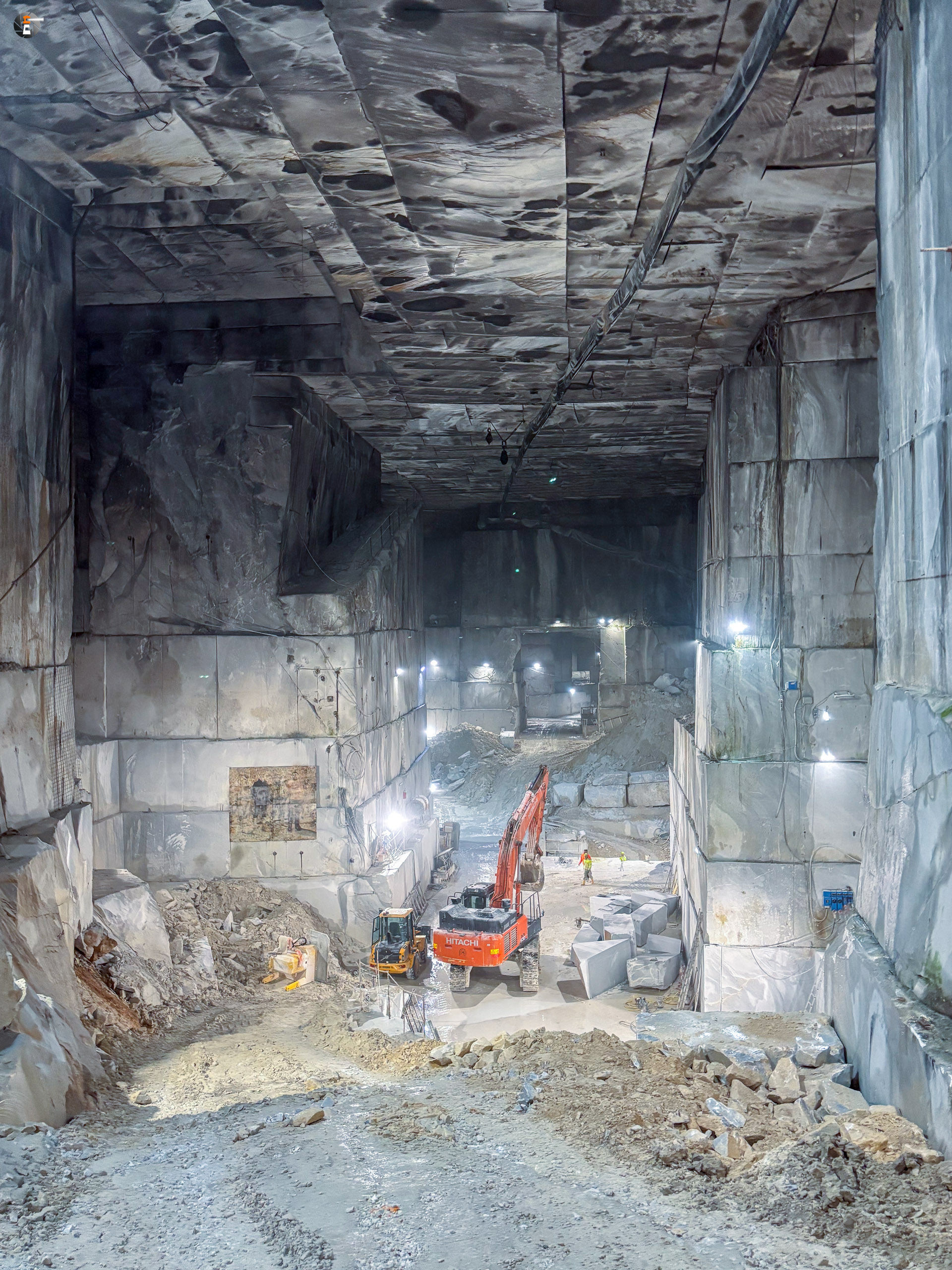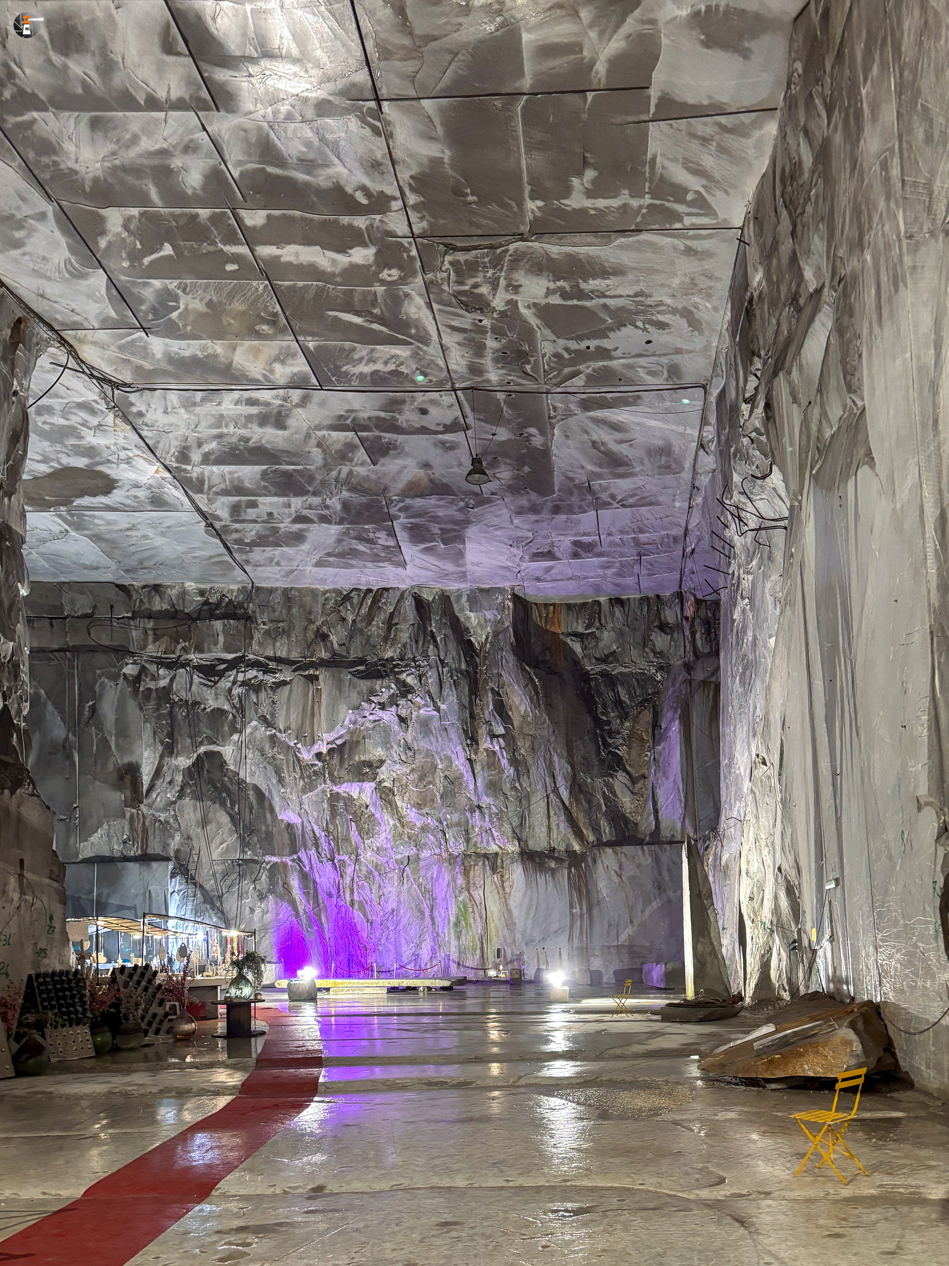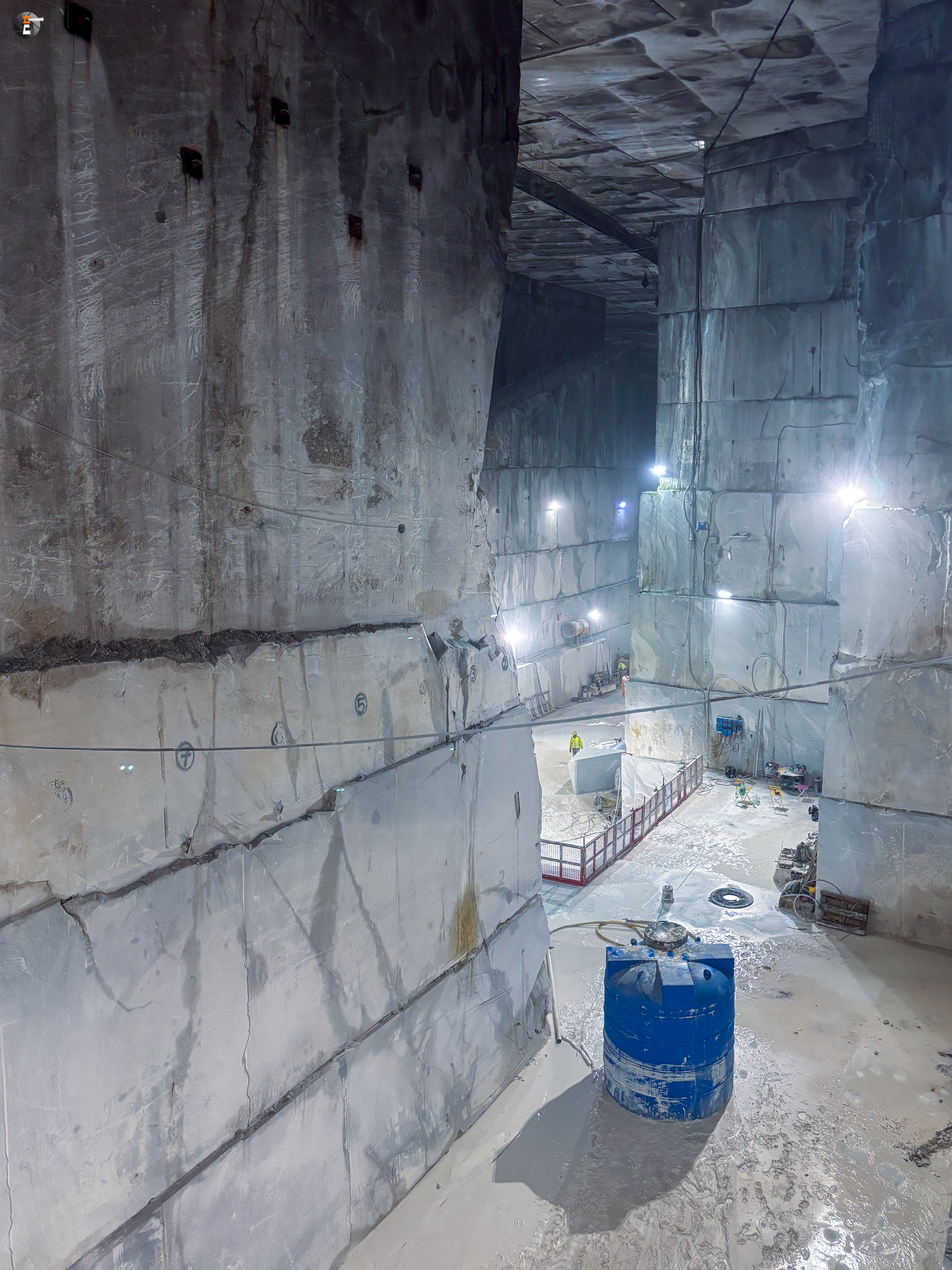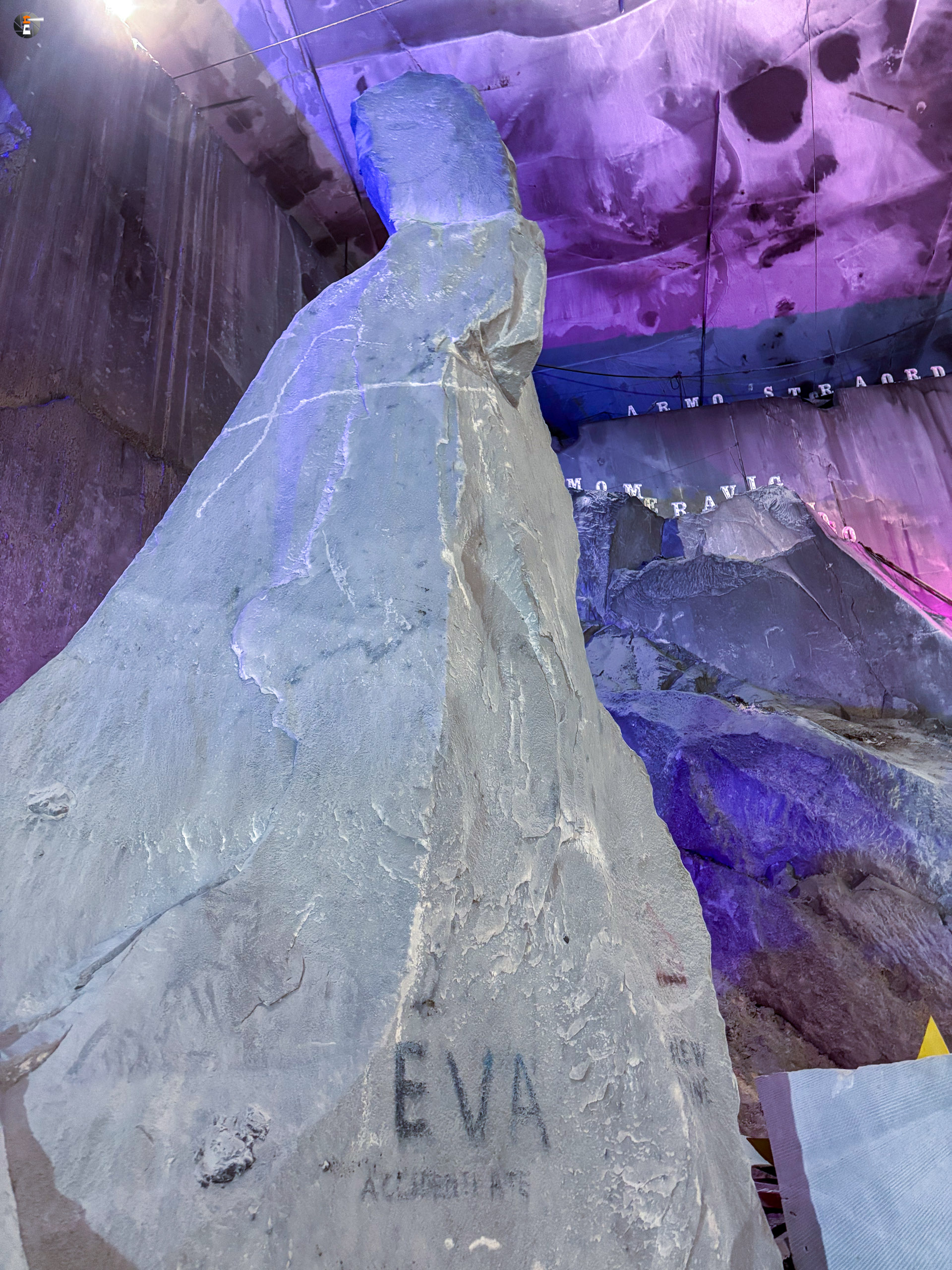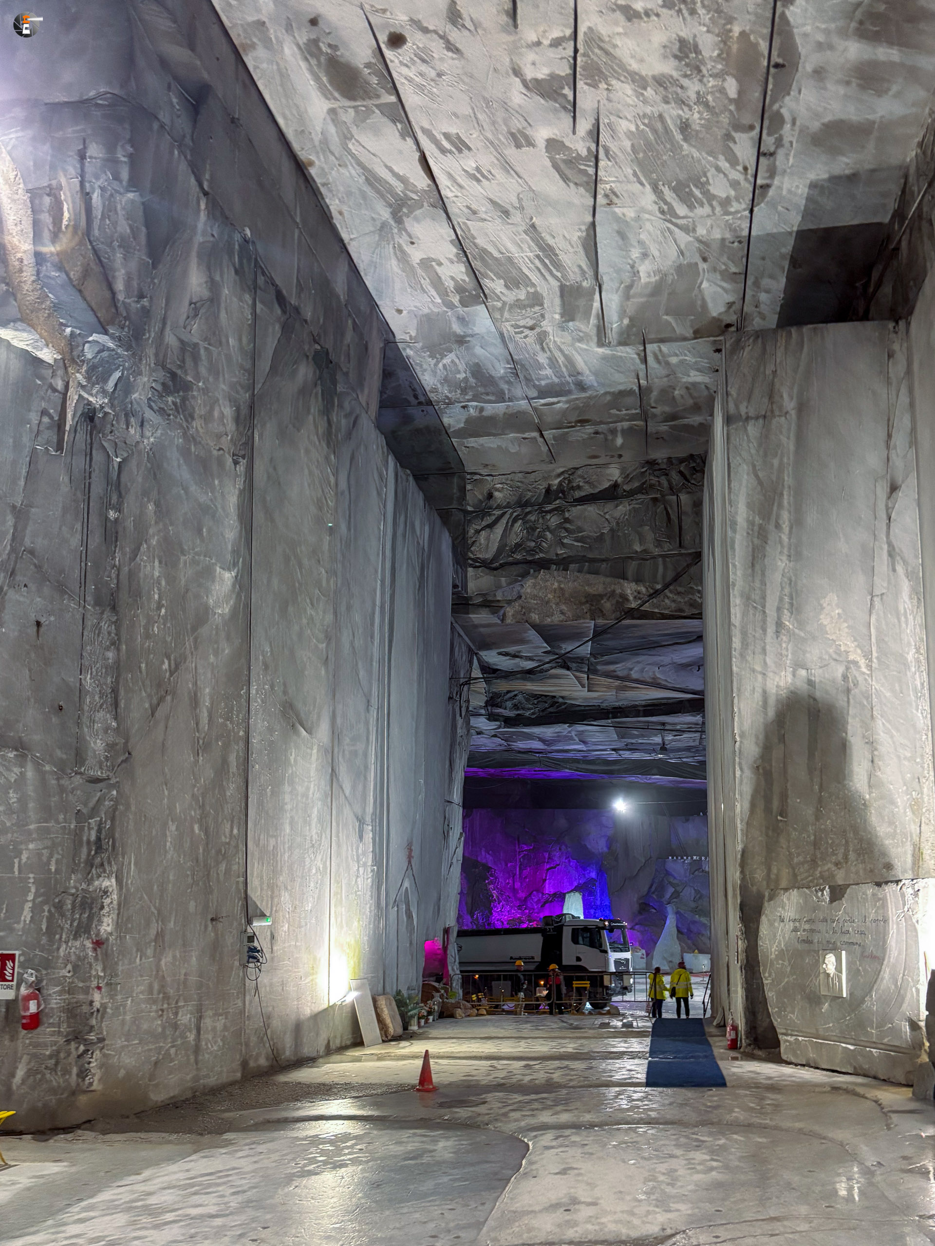 Unsere Führung dauert eine knappe Stunde. Wir wurden mit einem Kleinbus von Süden hereingefahren, von Norden hätte man mit dem eigenen Auto einfahren können. Wir standen sogar draußen vor dem Portal, hatten aber keine Möglichkeit uns anzumelden. Das ging nur via Whats App – was wir ablehnen. Das wird inzwischen manchmal echt schwierig. So fuhren wir um den Berg herum zum anderen Eingang und konnten bei einer leibhaftigen Menschin zwei Tickets lösen, wurden 15 Minuten später abgeholt und etwa 600 Meter weit in den Berg gebracht, genau bis in die Mitte, dorthin, wo das weiße Gold mit Diamanten aus dem Berg gesägt wird. Es ist immer nur Calciumcarbonat, trotzdem variiert der Preis pro Tonne zwischen 200 und 20.000€, je nach Farbe und Maserung. Das Farbspiel reicht von grau bis weiß. Je langweiliger (reines Weiß), desto teurer.