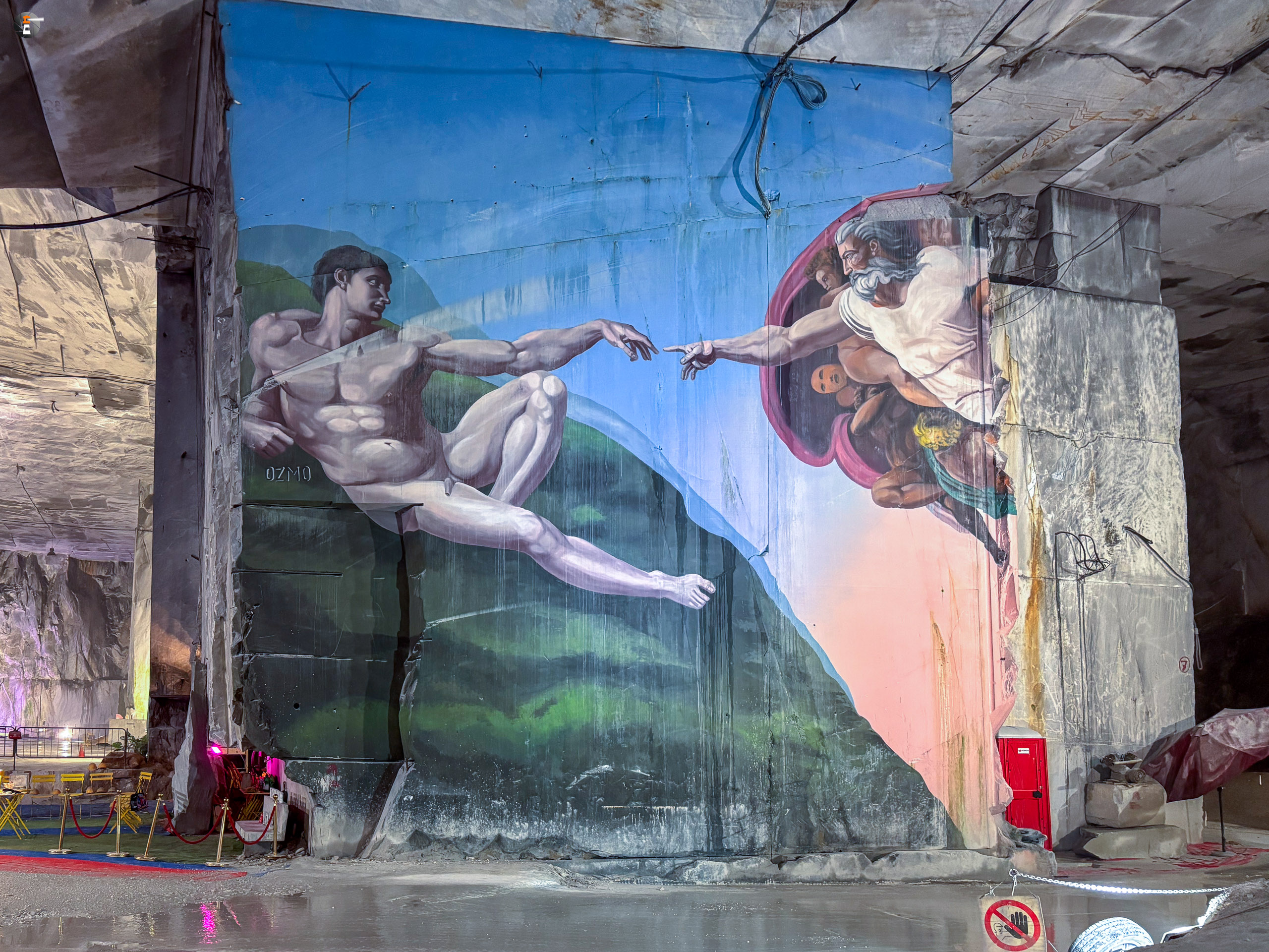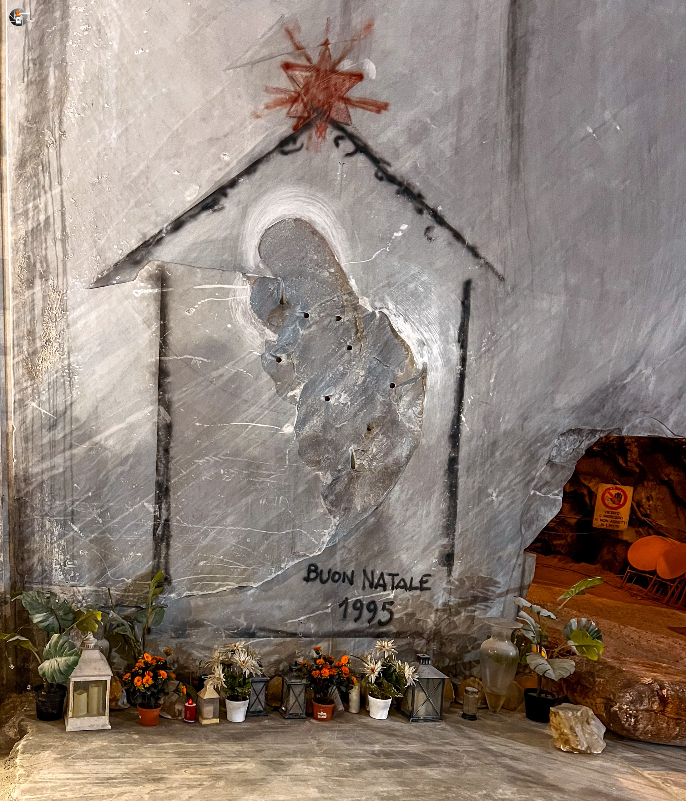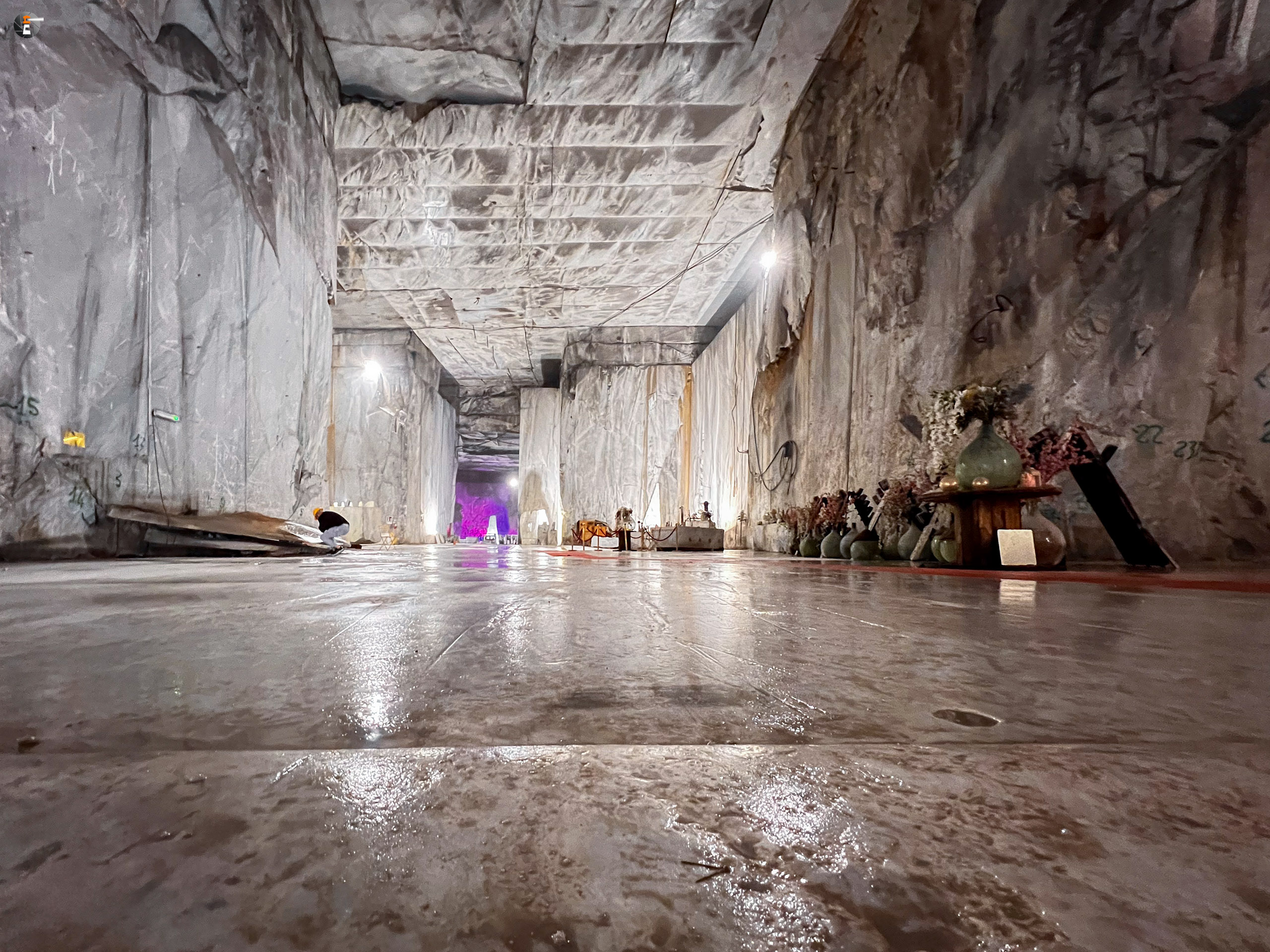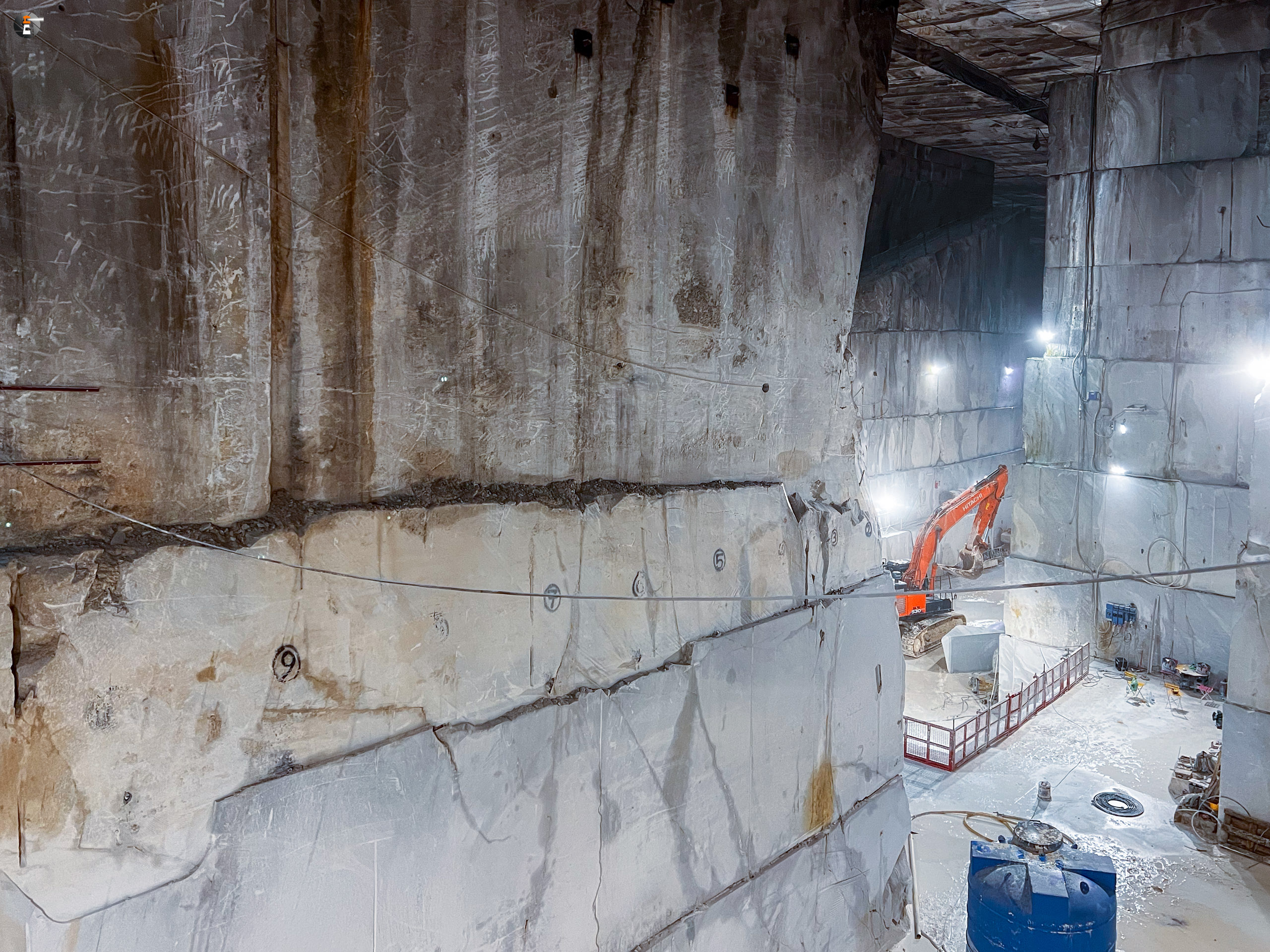 Unsere Führung dauert eine knappe Stunde. Wir wurden mit einem Kleinbus von Süden hereingefahren, von Norden hätte man mit dem eigenen Auto einfahren können. Wir standen sogar draußen vor dem Portal, hatten aber keine Möglichkeit uns anzumelden. Das ging nur via Whats App – was wir ablehnen. Das wird inzwischen manchmal echt schwierig. So fuhren wir um den Berg herum zum anderen Eingang und konnten bei einer leibhaftigen Menschin zwei Tickets lösen, wurden 15 Minuten später abgeholt und etwa 600 Meter weit in den Berg gebracht, genau bis in die Mitte, dorthin, wo das weiße Gold mit Diamanten aus dem Berg gesägt wird. Es ist immer nur Calciumcarbonat, trotzdem variiert der Preis pro Tonne zwischen 200 und 20.000€, je nach Farbe und Maserung. Das Farbspiel reicht von grau bis weiß. Je langweiliger (reines Weiß), desto teurer.