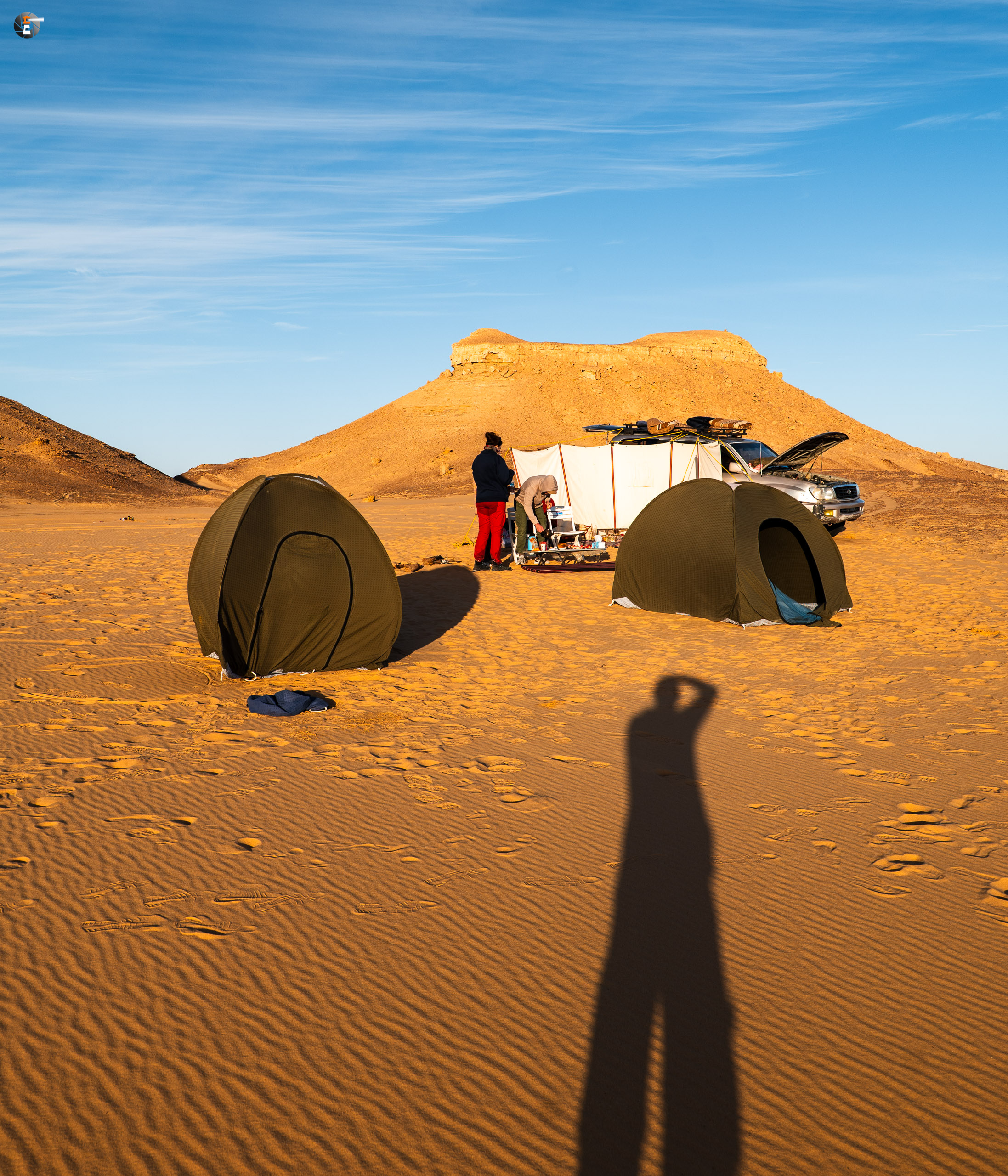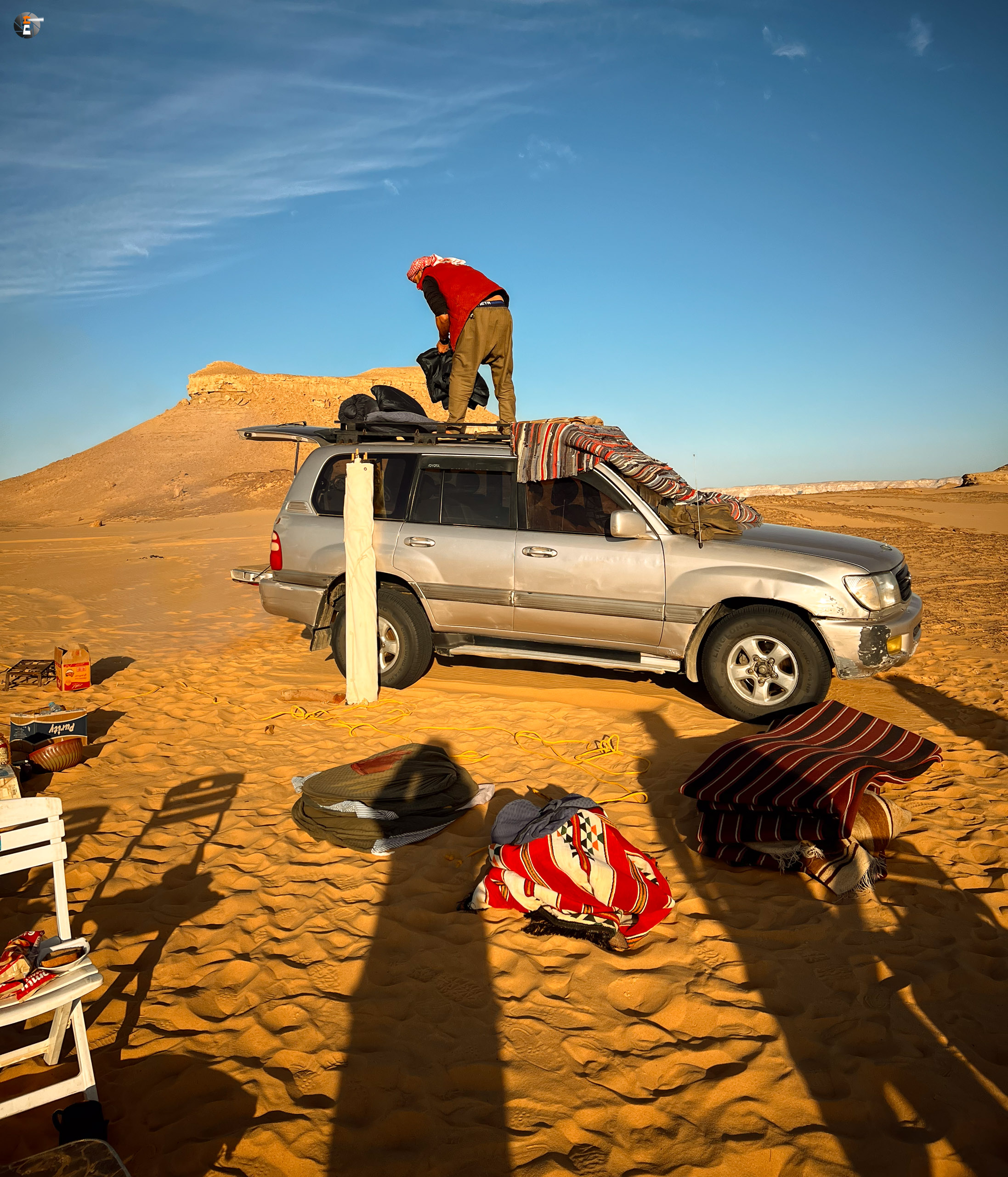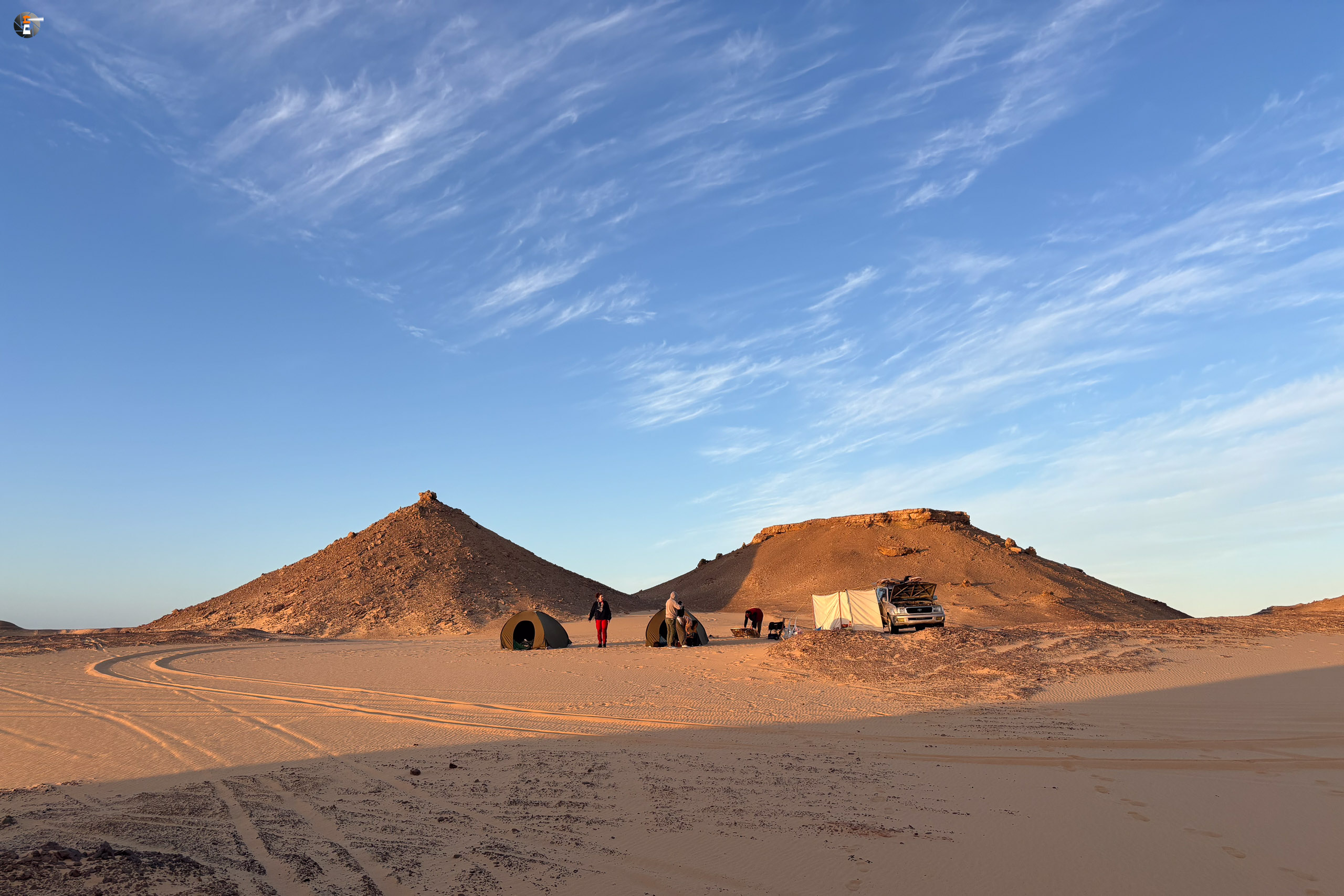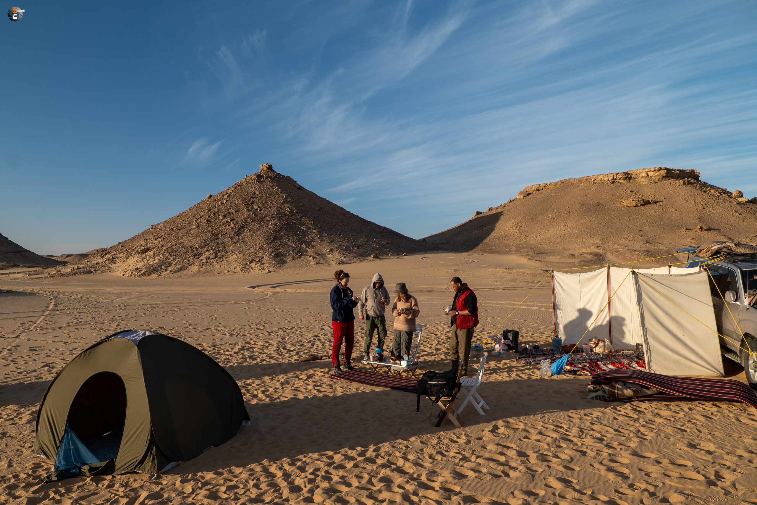 Nach Sonnenaufgang und Morgenhygiene (in der Wüste gar nicht so einfach) bekamen wir ein warmes Getränk und einen kleinen Snack. Unsere Idee war eigentlich, so zeitig wie möglich loszukommen, damit wir bei perfektem Licht in „The White Desert“ ankommen. Das traf schon am Vorabend auf mürrische Zustimmung, aber da wir ja schon rumwuselten, blieb Walid nichts anderes übrig, als das Auto zu beladen und loszufahren. Die Hand war ja wieder gesund und so mussten wir uns keine Sorgen machen, dass unser Fahrer nicht fahren kann.