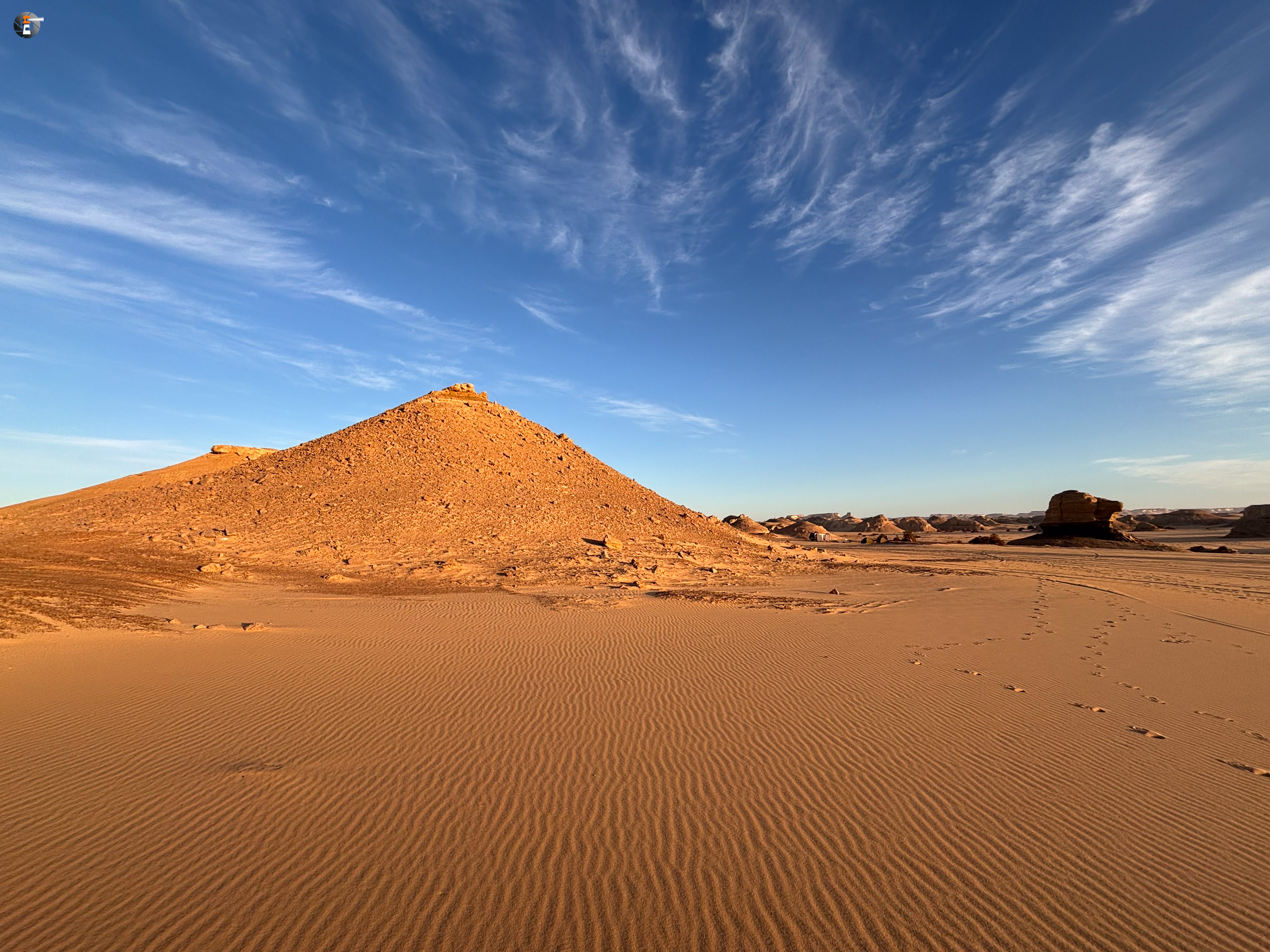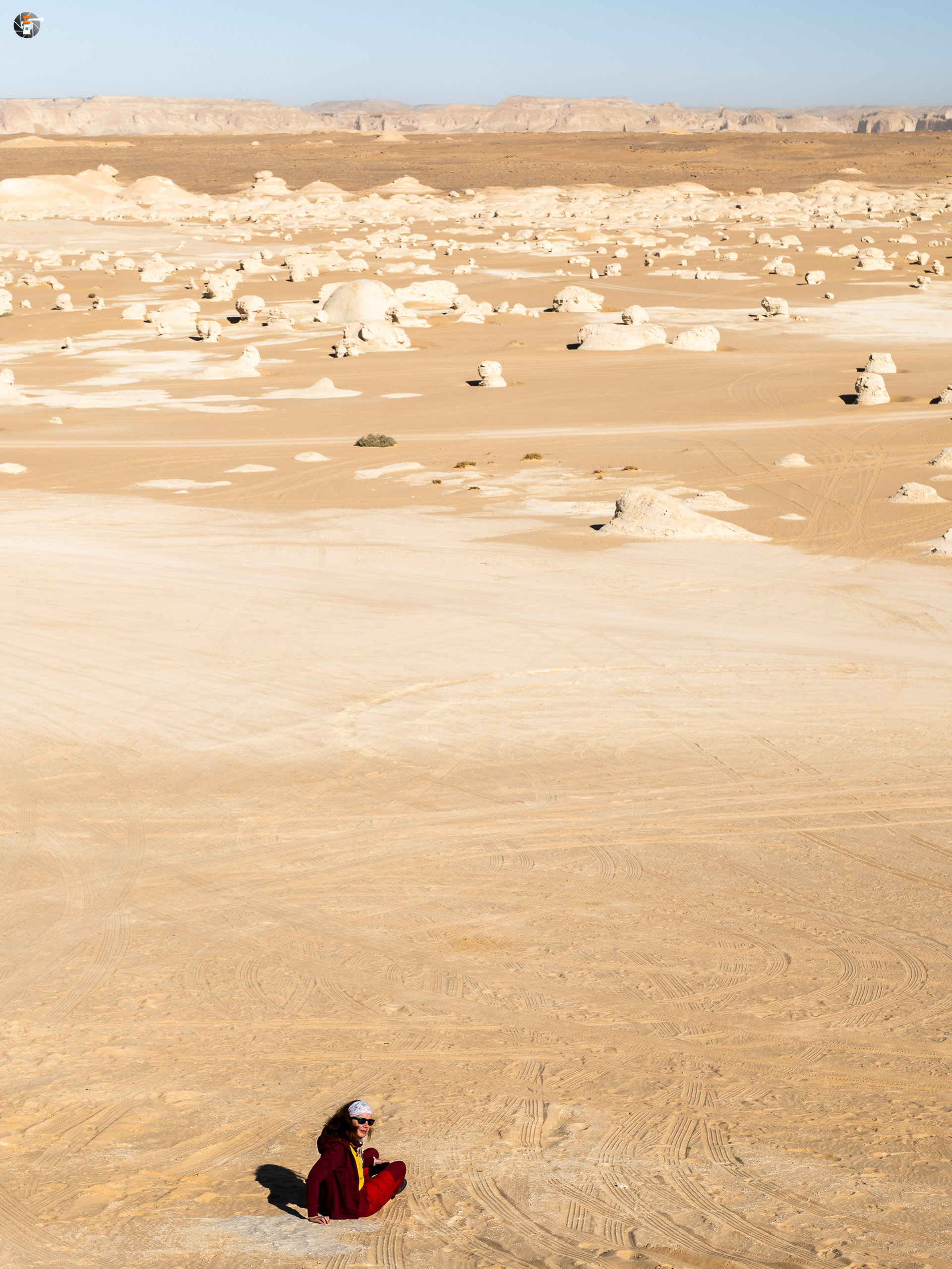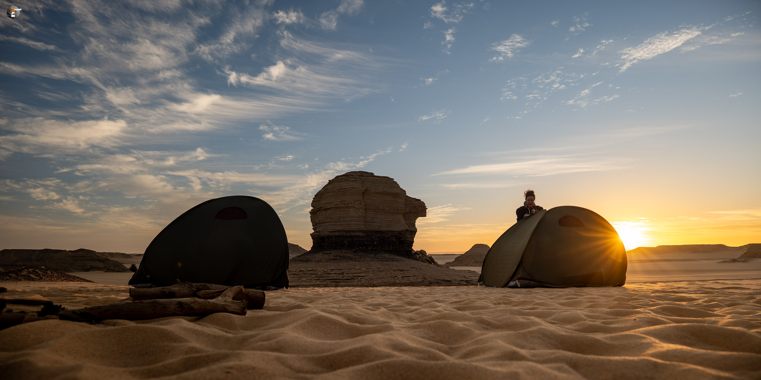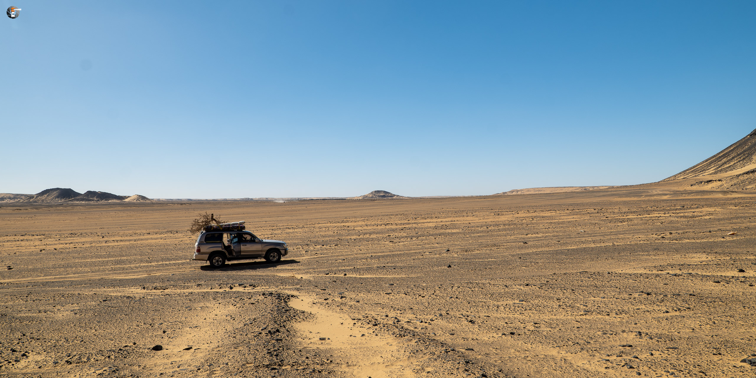 Nach Sonnenaufgang und Morgenhygiene (in der Wüste gar nicht so einfach) bekamen wir ein warmes Getränk und einen kleinen Snack. Unsere Idee war eigentlich, so zeitig wie möglich loszukommen, damit wir bei perfektem Licht in „The White Desert“ ankommen. Das traf schon am Vorabend auf mürrische Zustimmung, aber da wir ja schon rumwuselten, blieb Walid nichts anderes übrig, als das Auto zu beladen und loszufahren. Die Hand war ja wieder gesund und so mussten wir uns keine Sorgen machen, dass unser Fahrer nicht fahren kann.