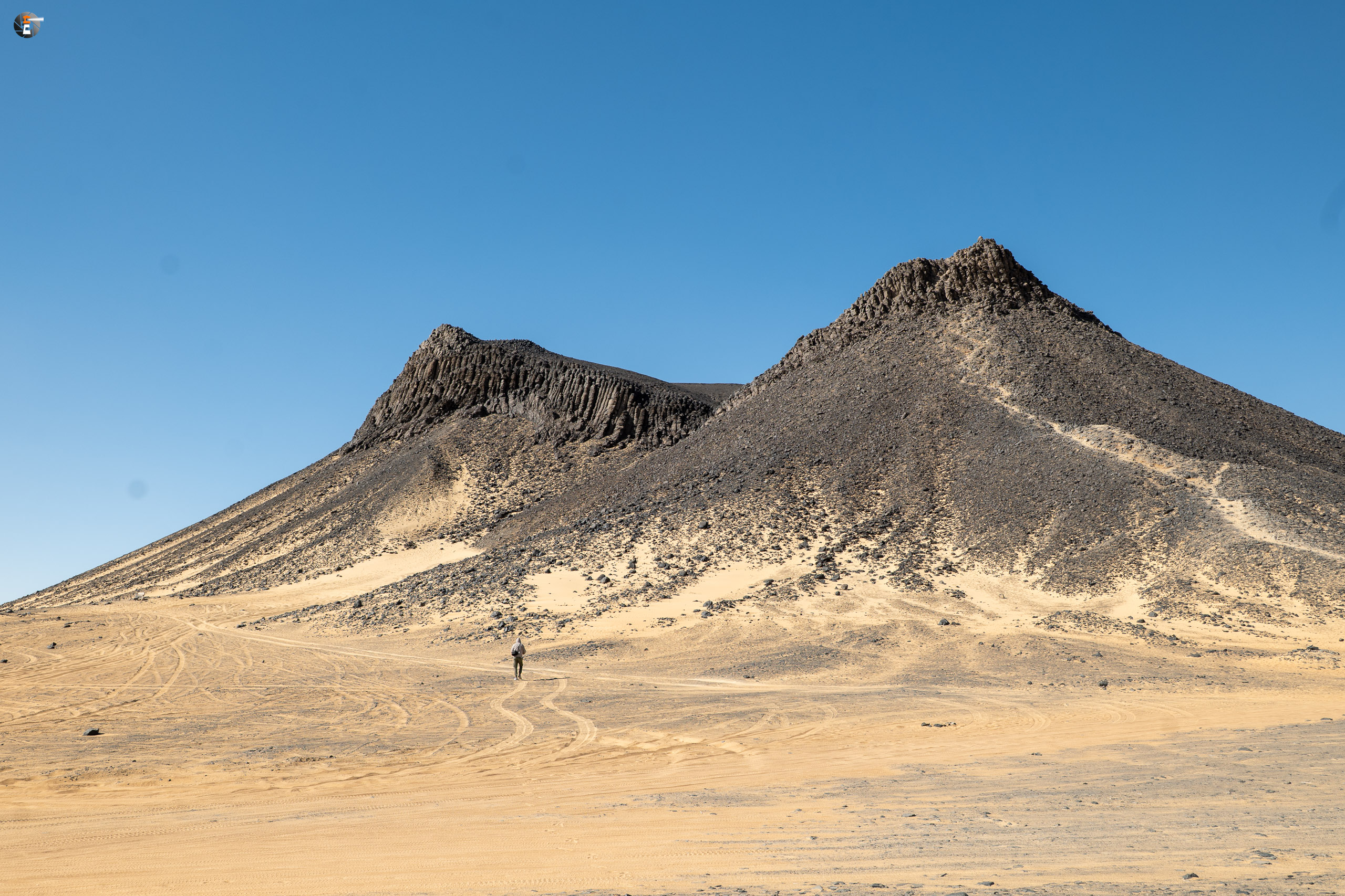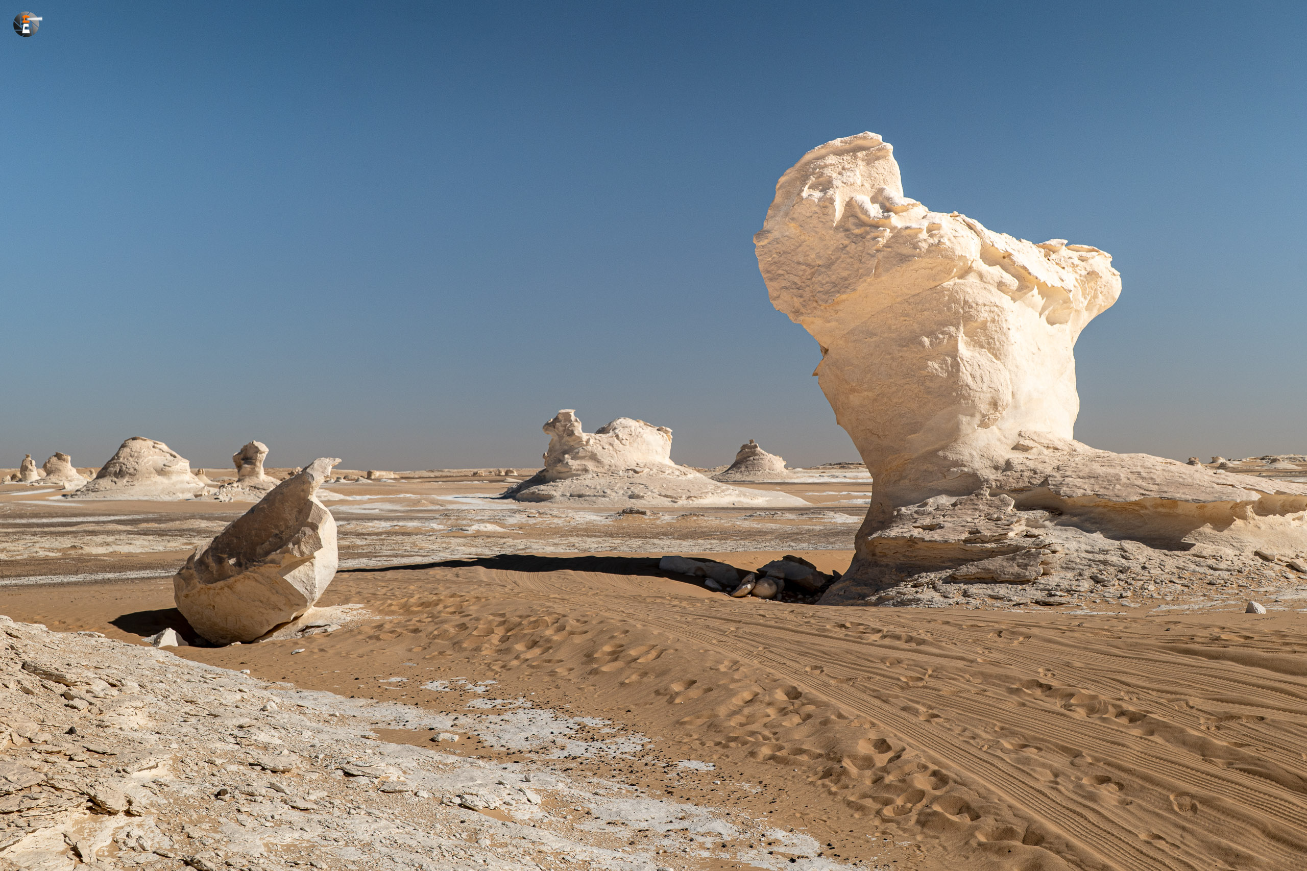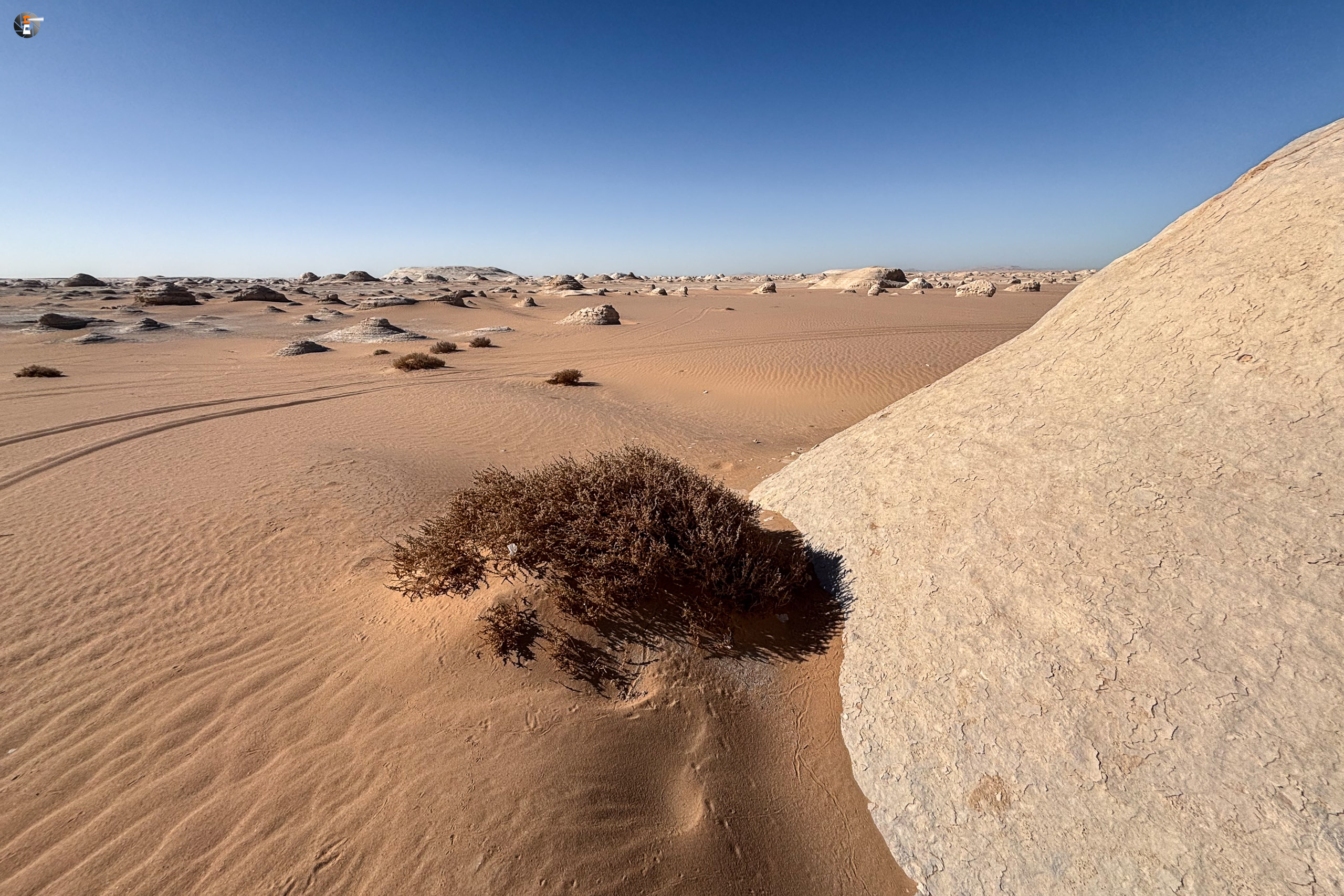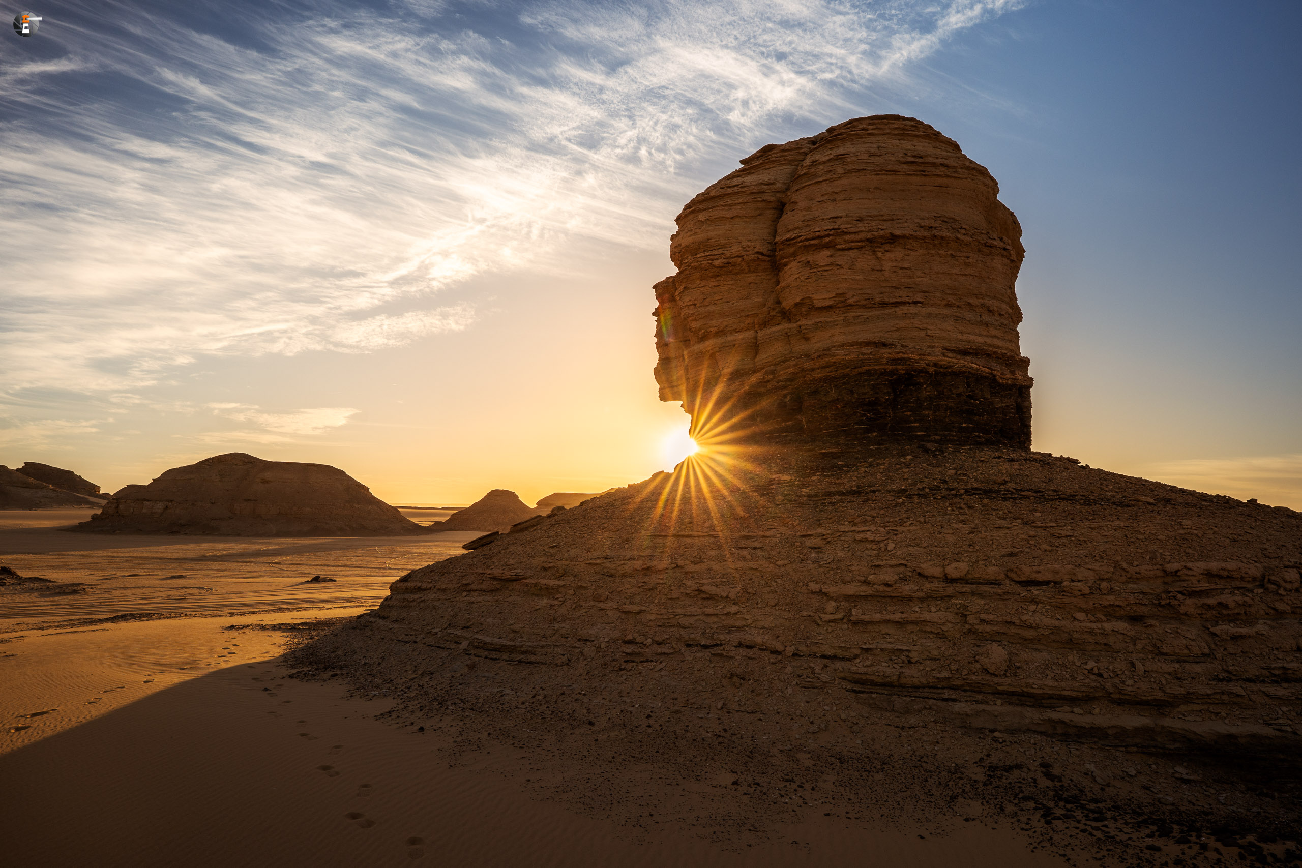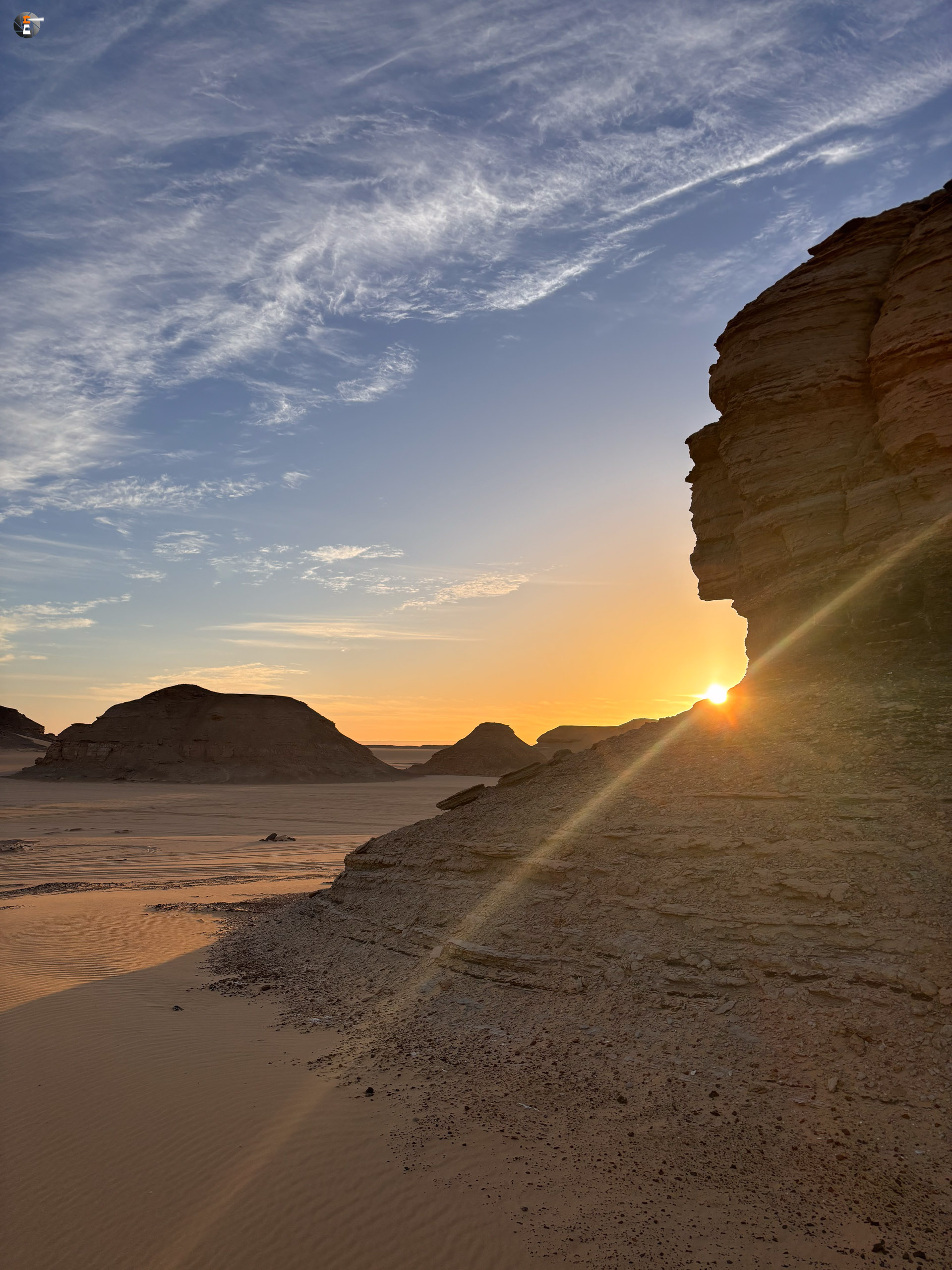 Nach Sonnenaufgang und Morgenhygiene (in der Wüste gar nicht so einfach) bekamen wir ein warmes Getränk und einen kleinen Snack. Unsere Idee war eigentlich, so zeitig wie möglich loszukommen, damit wir bei perfektem Licht in „The White Desert“ ankommen. Das traf schon am Vorabend auf mürrische Zustimmung, aber da wir ja schon rumwuselten, blieb Walid nichts anderes übrig, als das Auto zu beladen und loszufahren. Die Hand war ja wieder gesund und so mussten wir uns keine Sorgen machen, dass unser Fahrer nicht fahren kann.
