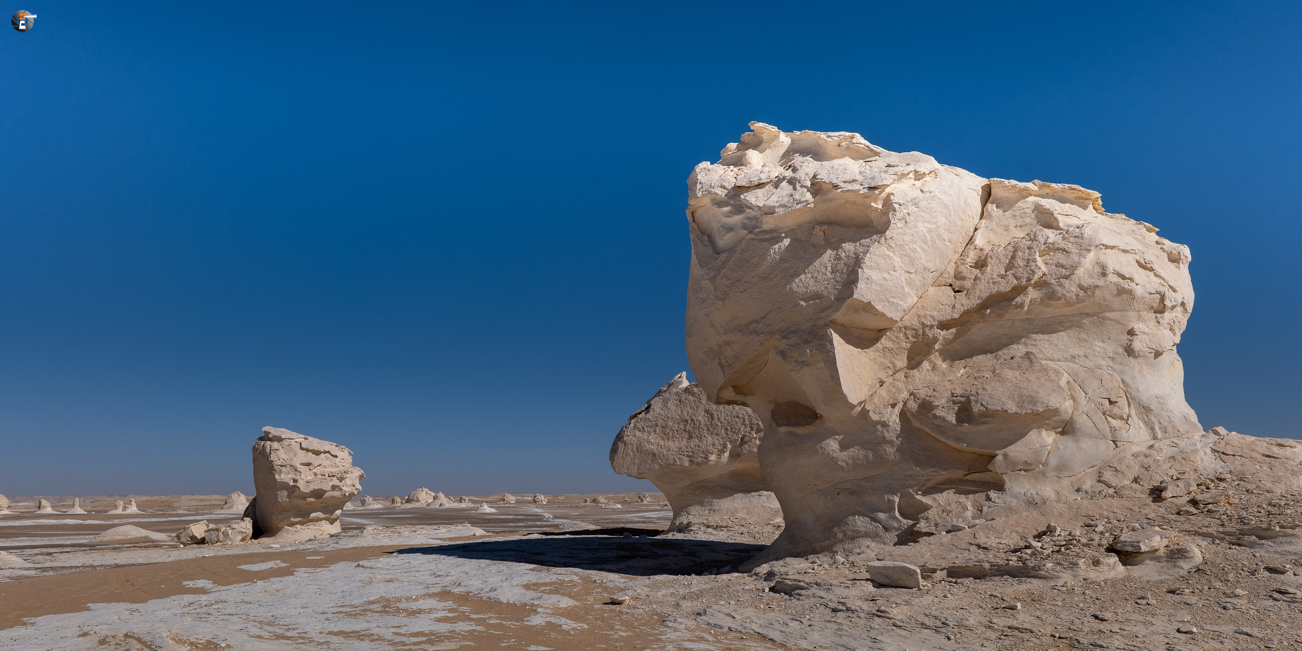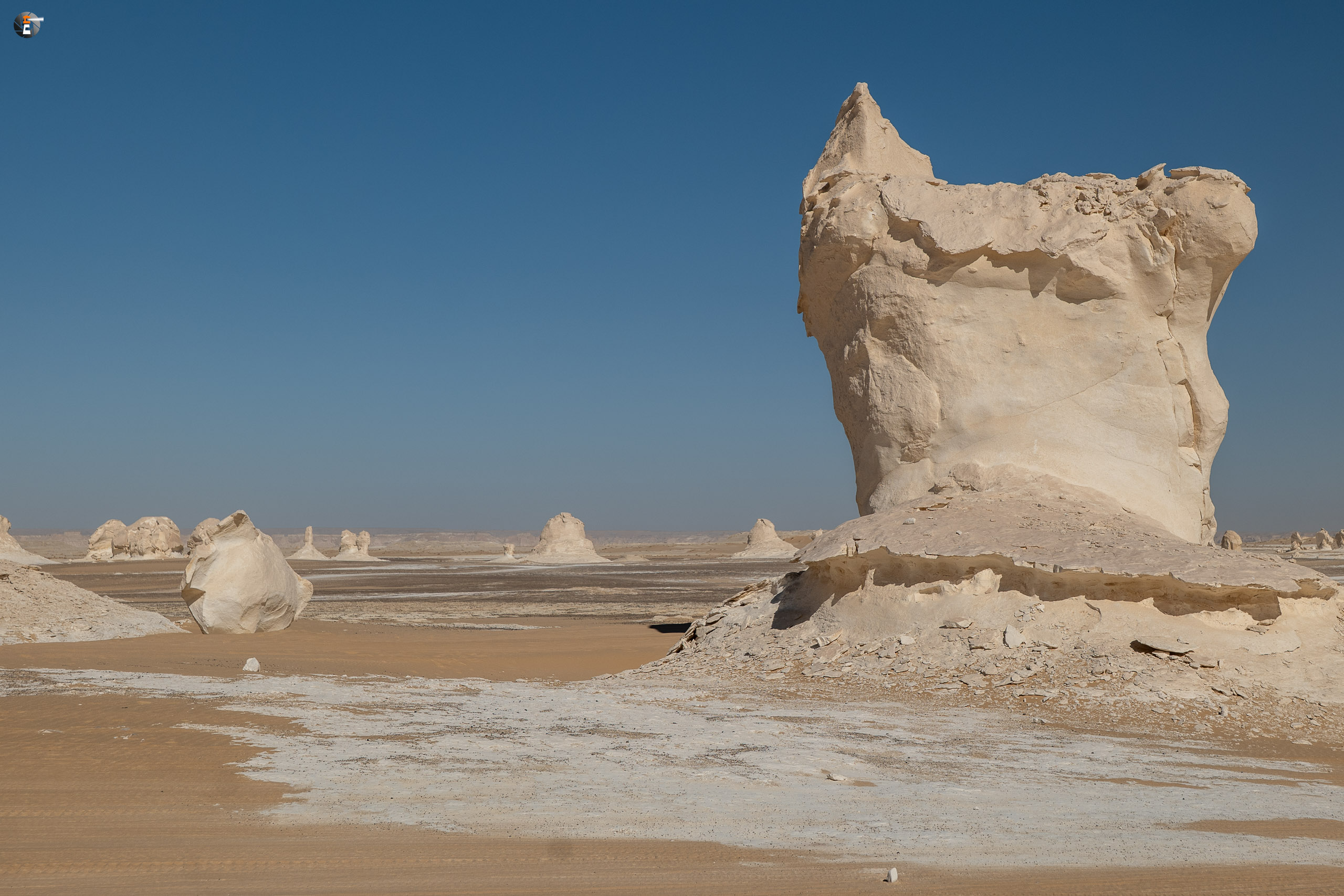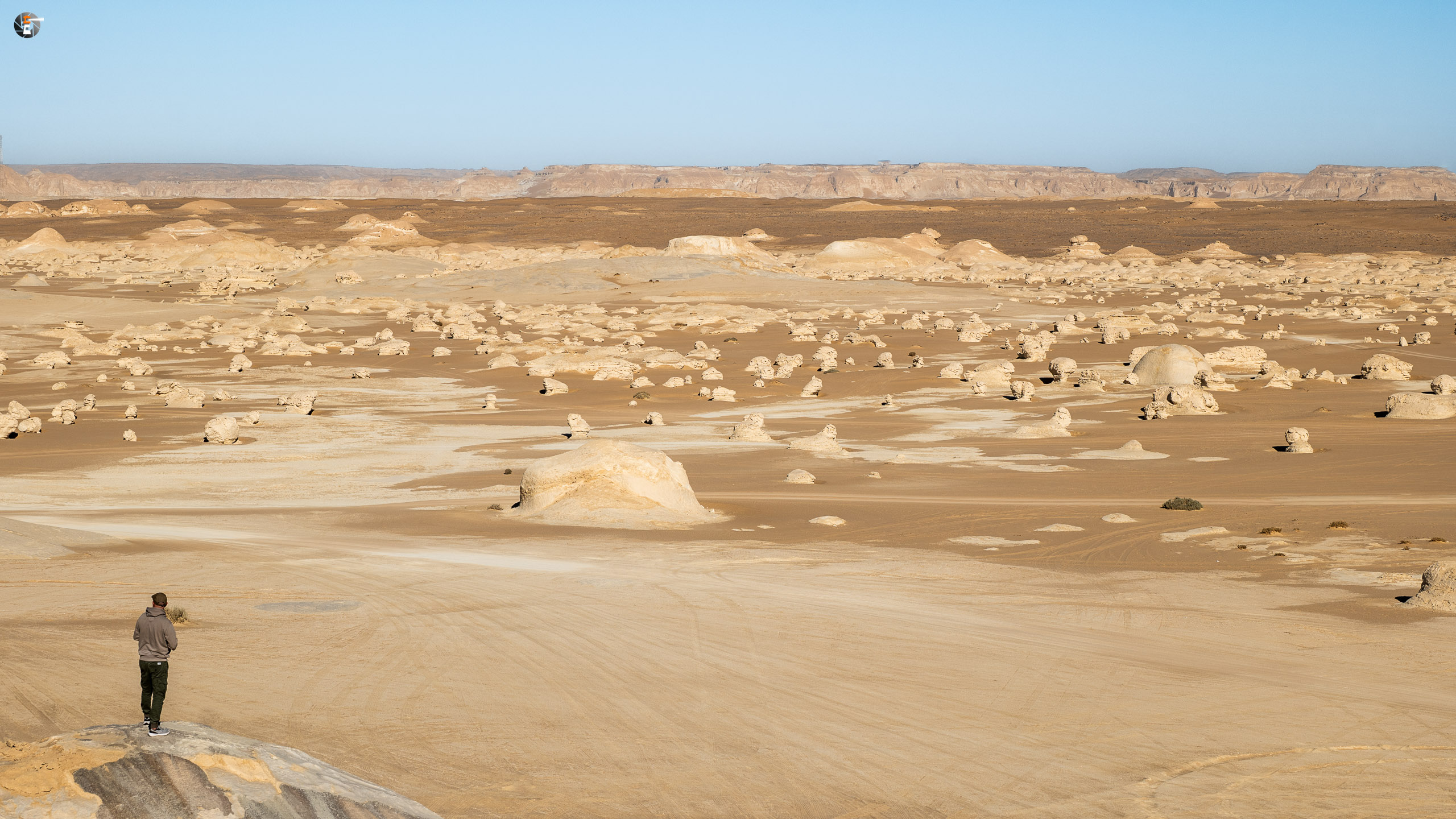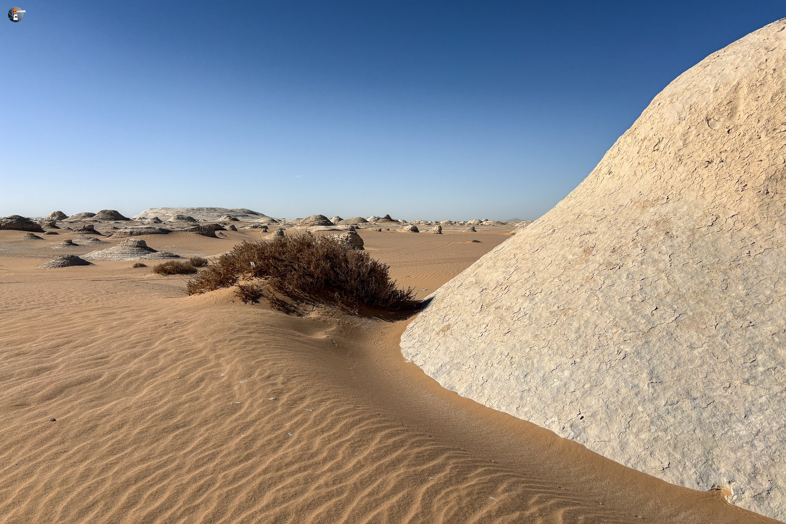 Nach Sonnenaufgang und Morgenhygiene (in der Wüste gar nicht so einfach) bekamen wir ein warmes Getränk und einen kleinen Snack. Unsere Idee war eigentlich, so zeitig wie möglich loszukommen, damit wir bei perfektem Licht in „The White Desert“ ankommen. Das traf schon am Vorabend auf mürrische Zustimmung, aber da wir ja schon rumwuselten, blieb Walid nichts anderes übrig, als das Auto zu beladen und loszufahren. Die Hand war ja wieder gesund und so mussten wir uns keine Sorgen machen, dass unser Fahrer nicht fahren kann.