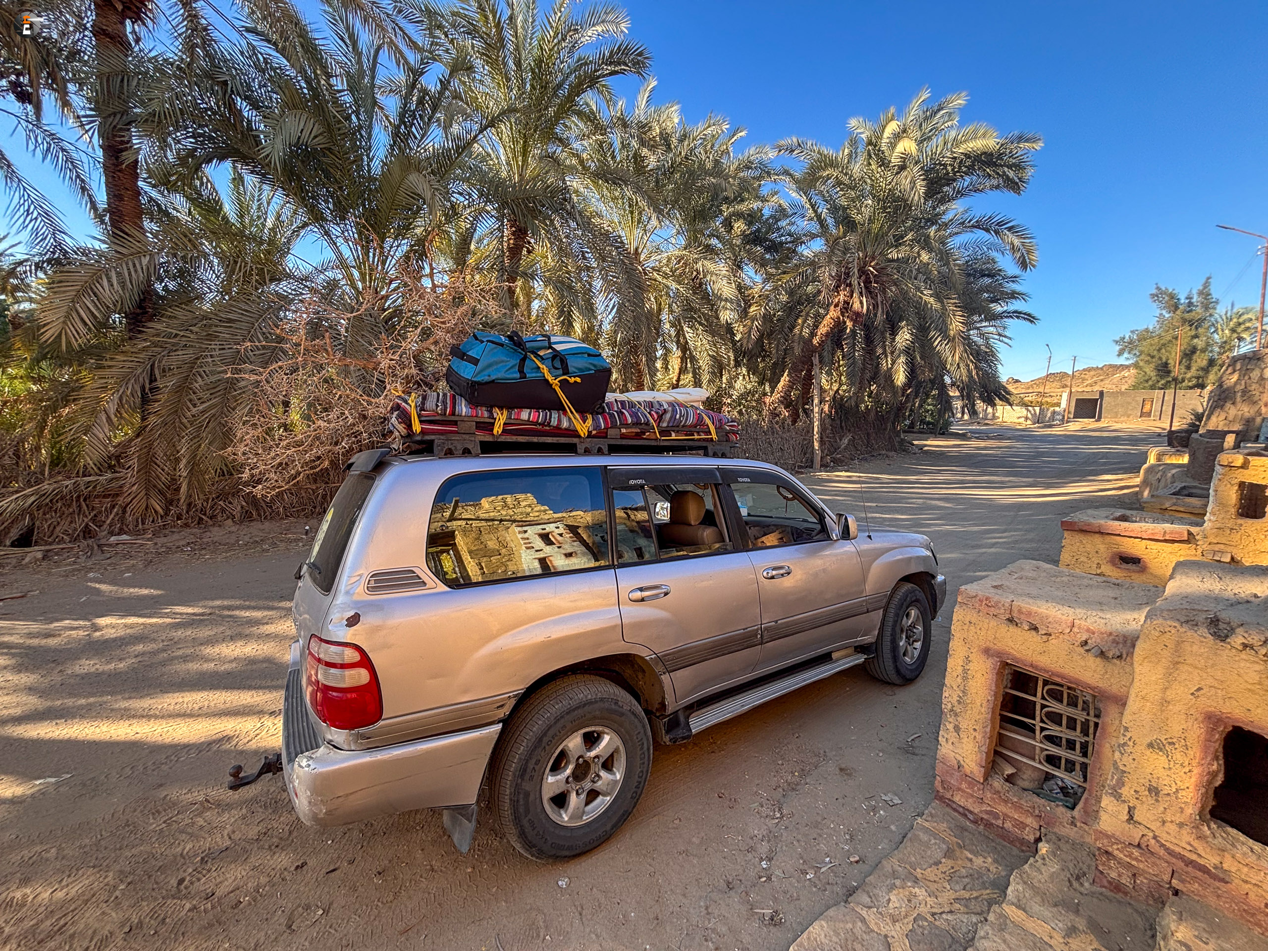 Im Ort angekommen fuhr er uns also zu einem ersten Hotel, in dem uns die Zimmer gezeigt wurden. Walid sagte uns mehrfach, das wir nicht sagen sollten, dass wir ein Zimmer bräuchten, aber die Gefahr bestand bei der Qualität der Zimmer auch nicht. Nach diesem letzten Versuch seinerseits bestanden wir darauf, in das Hotel zu fahren, das in unserem Angebot stand. Dazu mussten wir erst einmal zum ersten Hotel in der Oase, um unser Gepäck abzuholen. Da wir dort 4 große Gepäckstücke hatten, musste ein bisschen improvisiert werden, notfalls auch auf dem Dach.