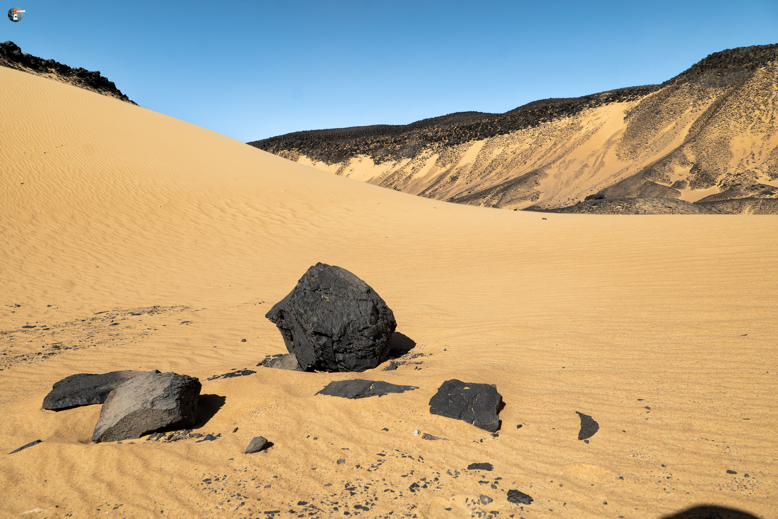 Nach einem sehr leckeren Lunch, der nicht mehr ganz sandfrei war – das ist dann so in der Wüste – ging es für uns weiter. Der Wunsch der Fotografen war, nochmal in der schwarzen Wüste zu halten, damit diese nochmal bei anderem Licht „abgelichtet“ werden könne. Walid hat diesen Wunsch ganz sicher nicht verstanden, aber ihn trotzdem erfüllt und es sind dann auch wirklich ein paar schöne Bilder rausgekommen.