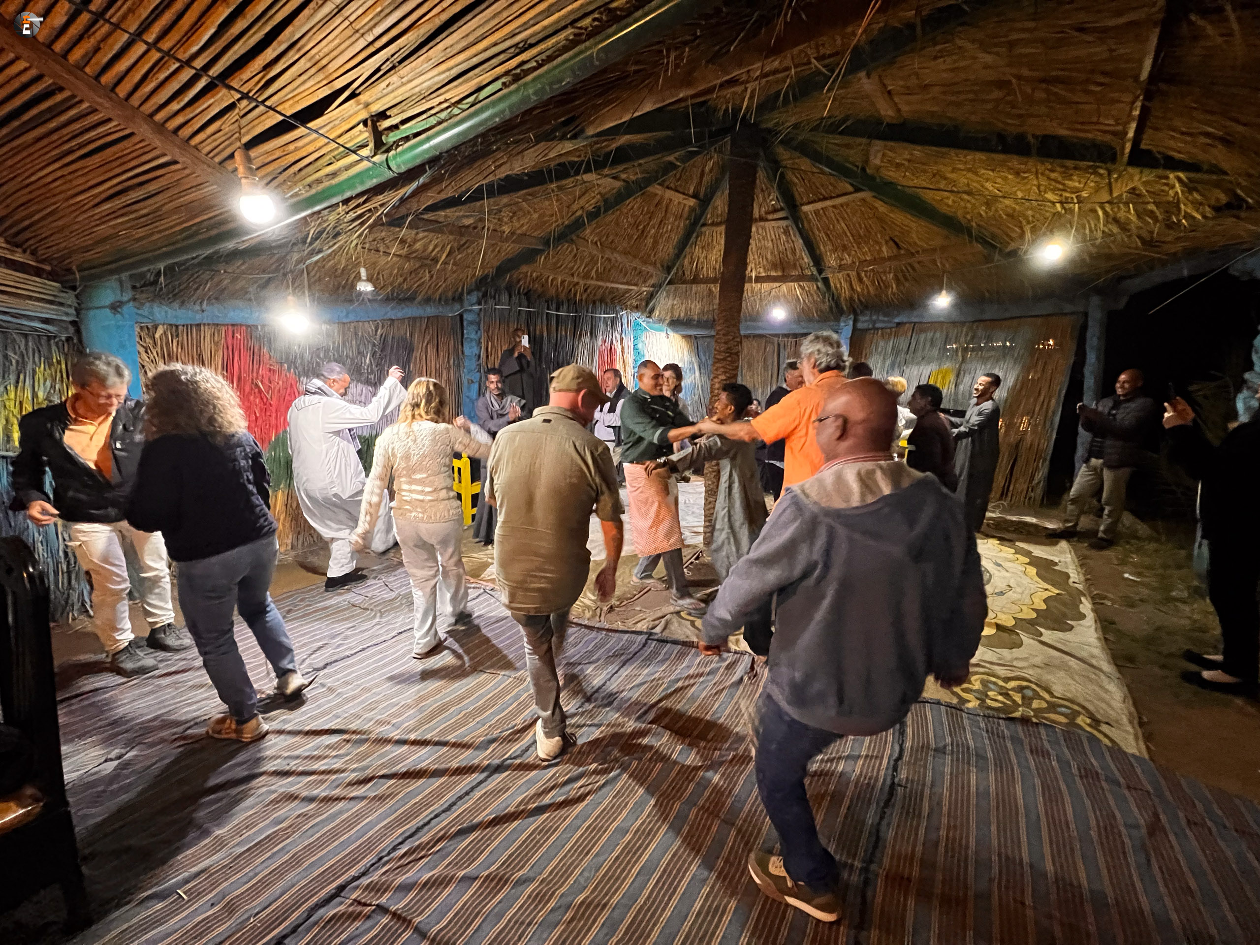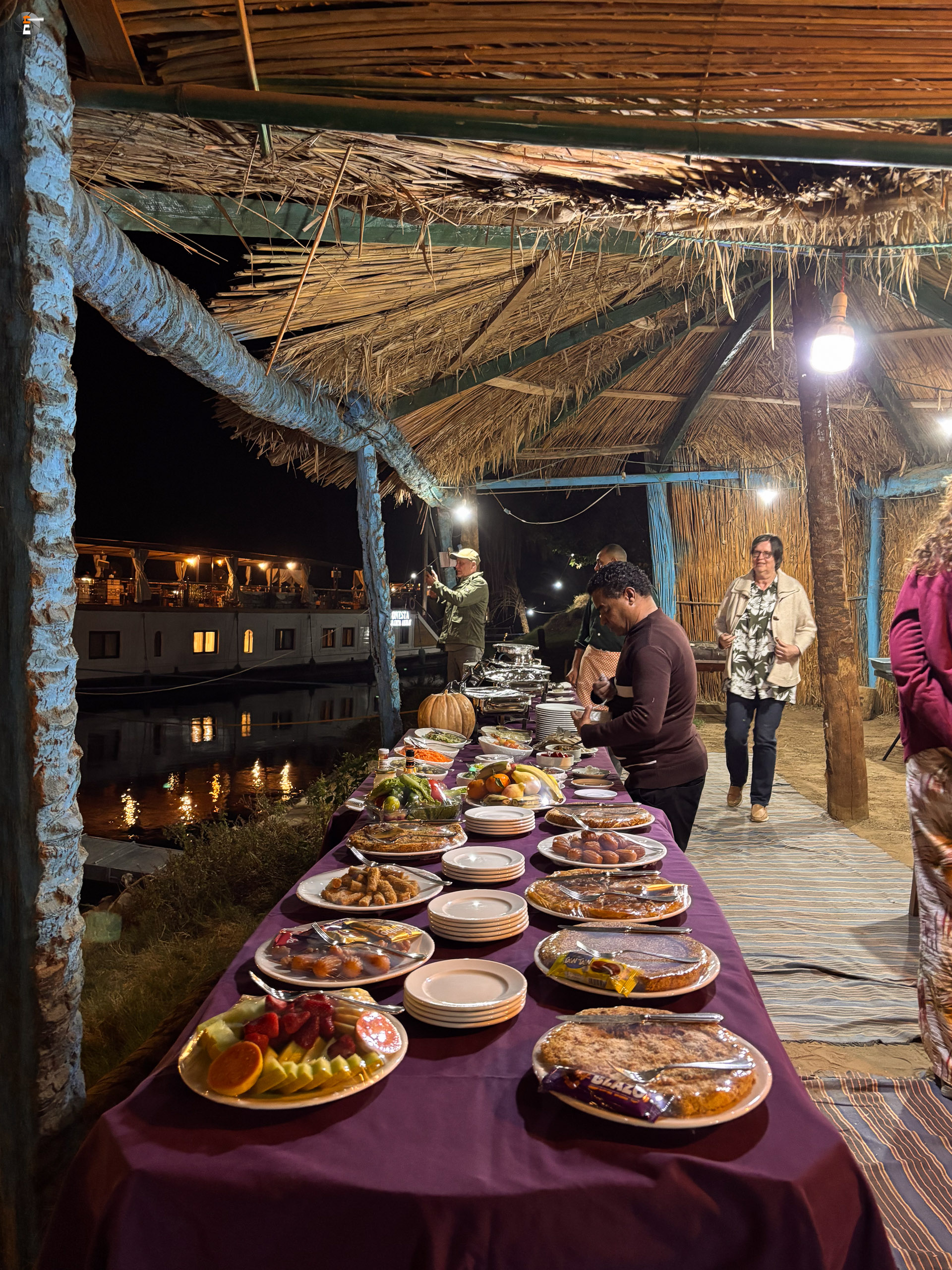 Unser Schiff wird inzwischen weiter flussaufwärts gezogen. Am Abend legen wir an einer Insel an. Gegessen wird heute an Land. Dazu gibt es Kulturprogramm in Form von Musik und Tanz. Unser mitreisender Schlagzeuger Stephan ist sehr schnell wieder in seinem Element und zum wiederholten Mal staunen die Einheimischen darüber, dass er die Darbouka spielen kann. Alle anderen werden von der Besatzung vereinnahmt und förmlich zum Tanzen gezwungen. Das ist eigentlich nicht unbedingt das, was wir im Urlaub wollen, macht aber trotzdem irgendwie Spaß, bei mir noch mit gewissen Einschränkungen. Einer unserer Mitreisenden feierte am vorausgegangenen Wochenende Geburtstag. Auch das weiß die Crew und erscheint mit einer Torte, verbunden mit einem Ständchen mit „Happy Birthday“ in arabisch, klingt irgendwie surreal.