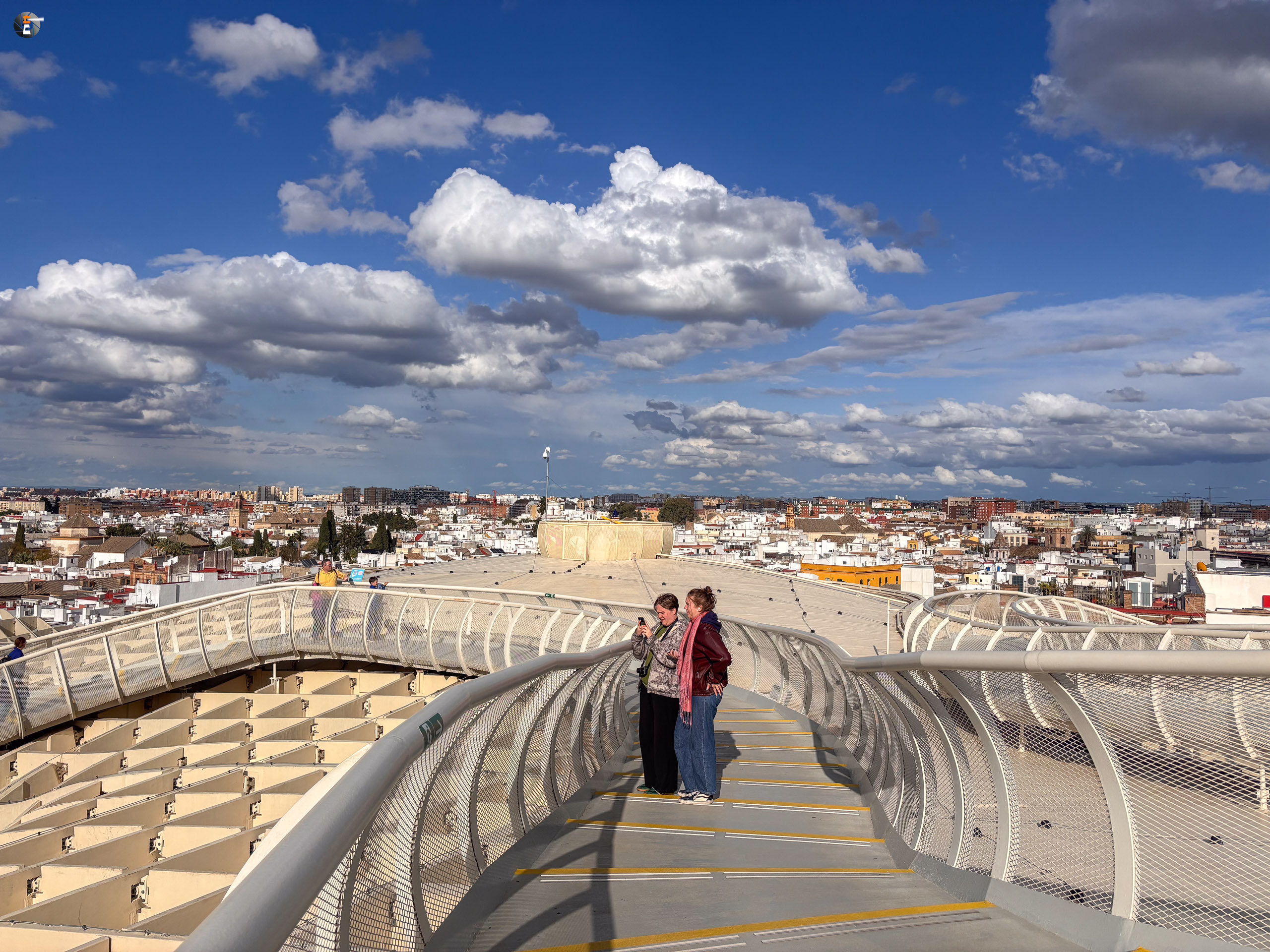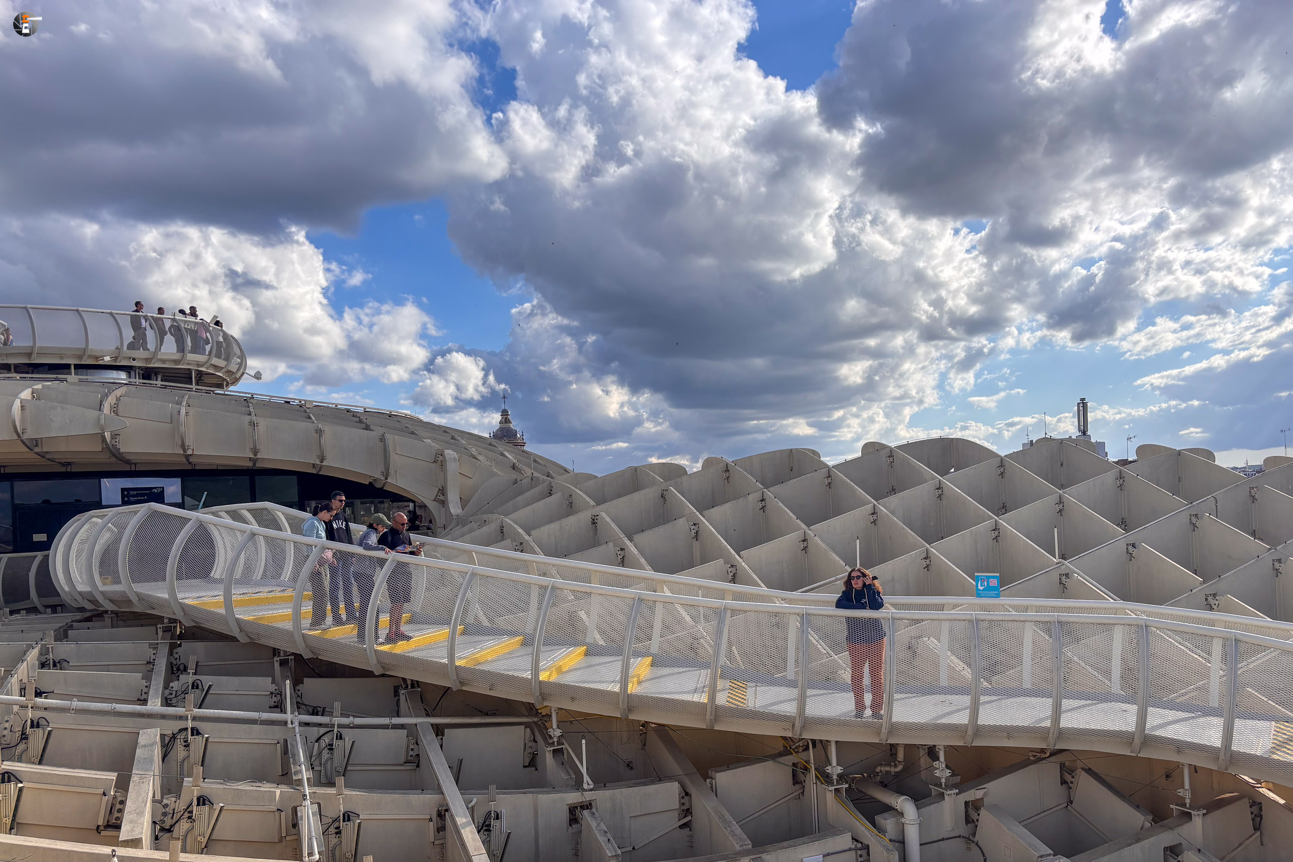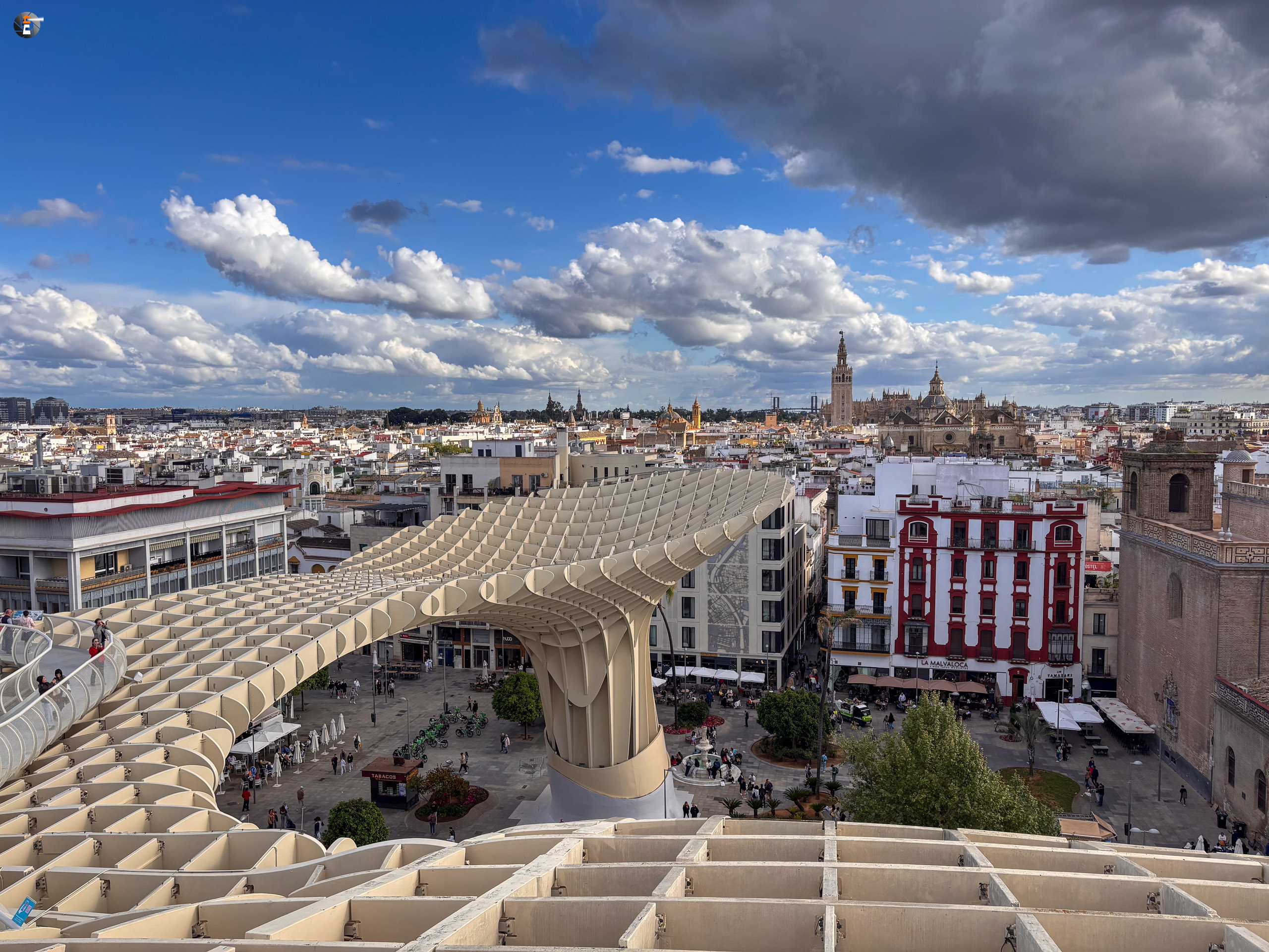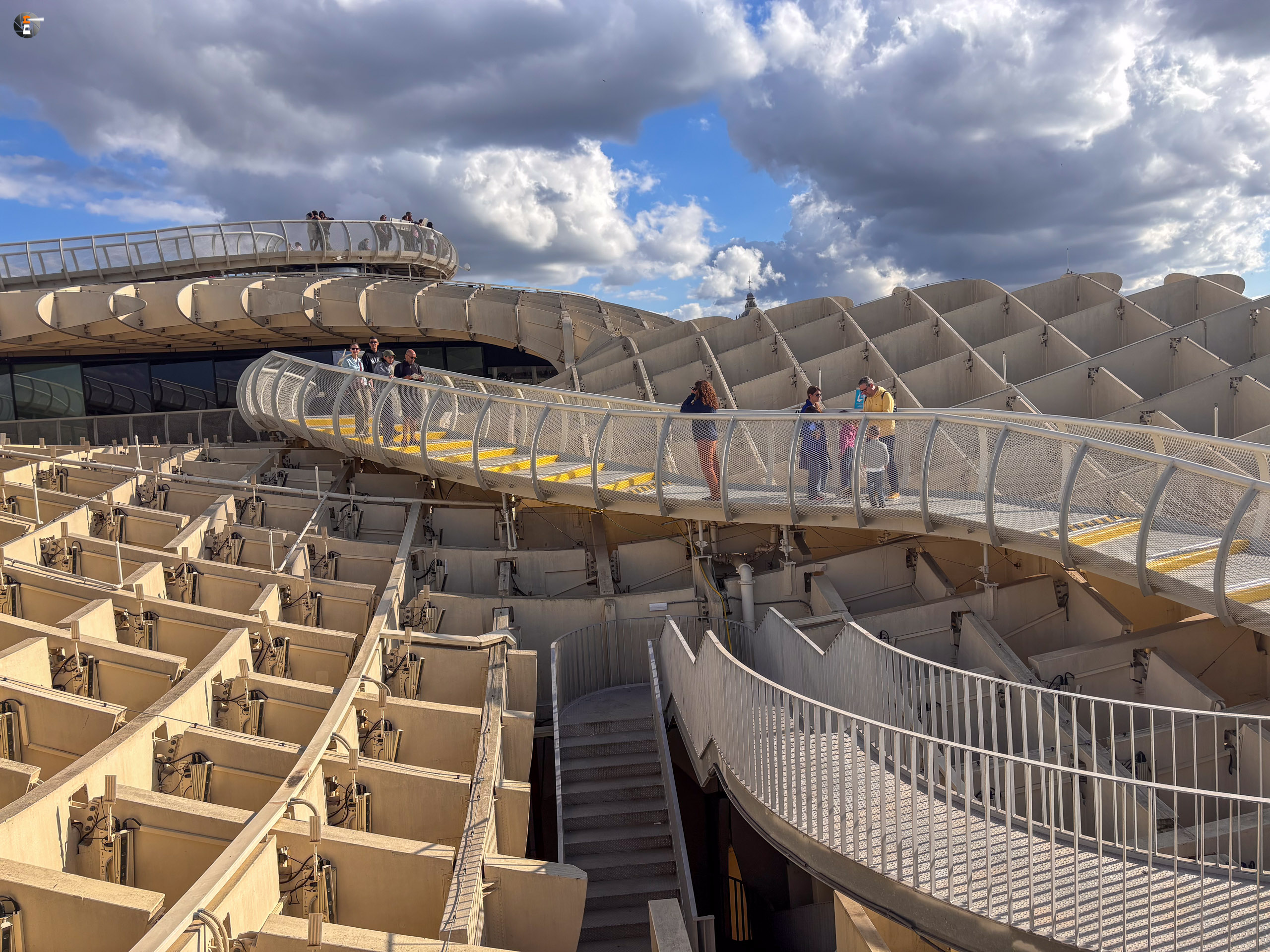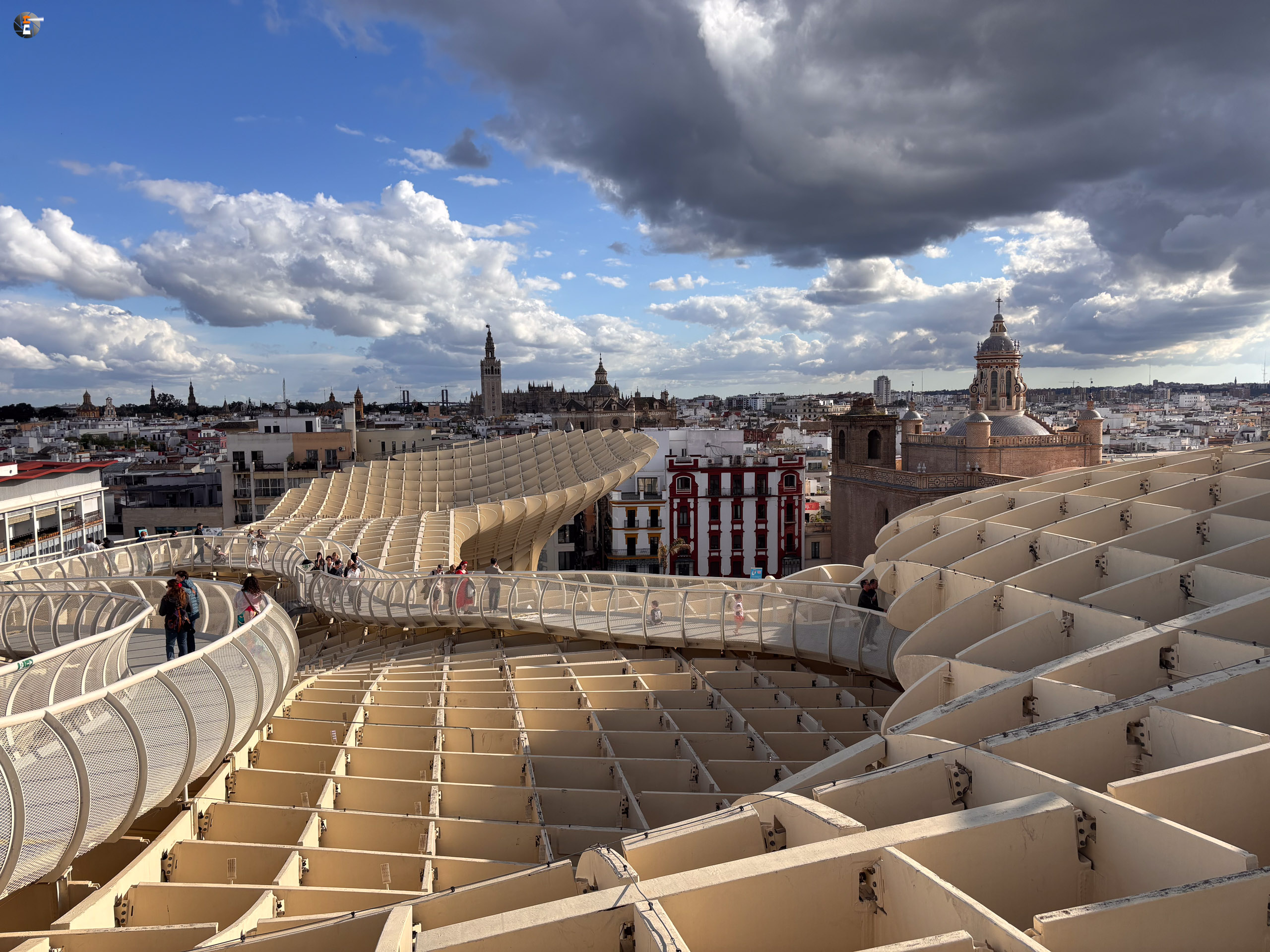 Unser Zettel für den Tag war aber noch nicht ganz abgearbeitet. Im Eilschritt machten wir uns auf den Weg zum Plaza de la Encarnación. Dort befinden sich die „Setas de Sevilla“, eine Hybridkonstruktion aus Holz, Beton und Stahl, welche an Pilze erinnert. Sie wurden von 2004 bis April 2011 gebaut und gelten als die größte Holzkonstruktion der Welt. Für 18:30 Uhr hatten wir noch Tickets ergattert und gerade pünktlich erreichten wir den Ort unseres Begehrens. Leonie kennt diese Konstruktion sogar aus ihrem Studium und wie wir nun wissen, kann sie die Pilze nun von ihrer Bucketlist streichen.