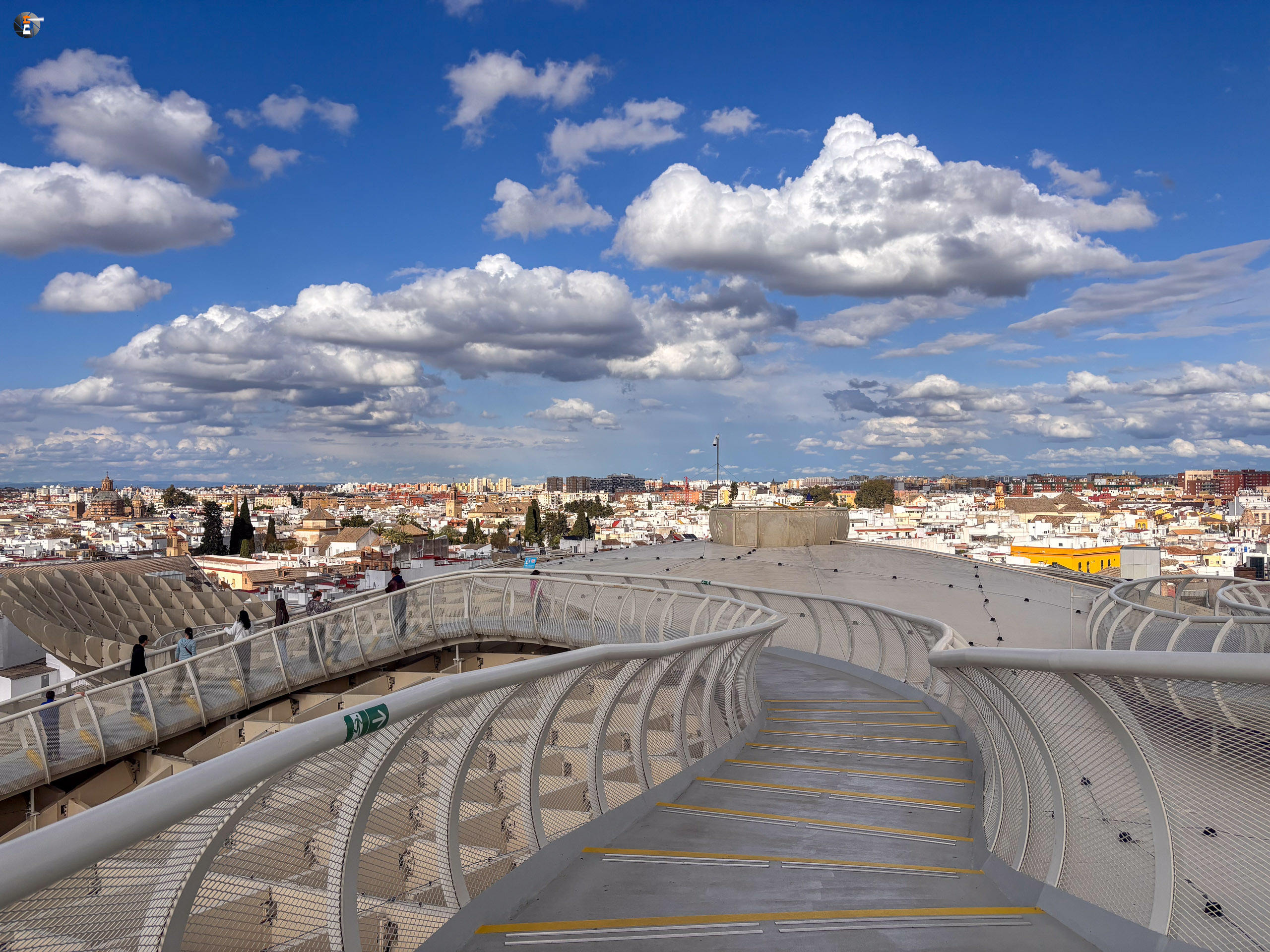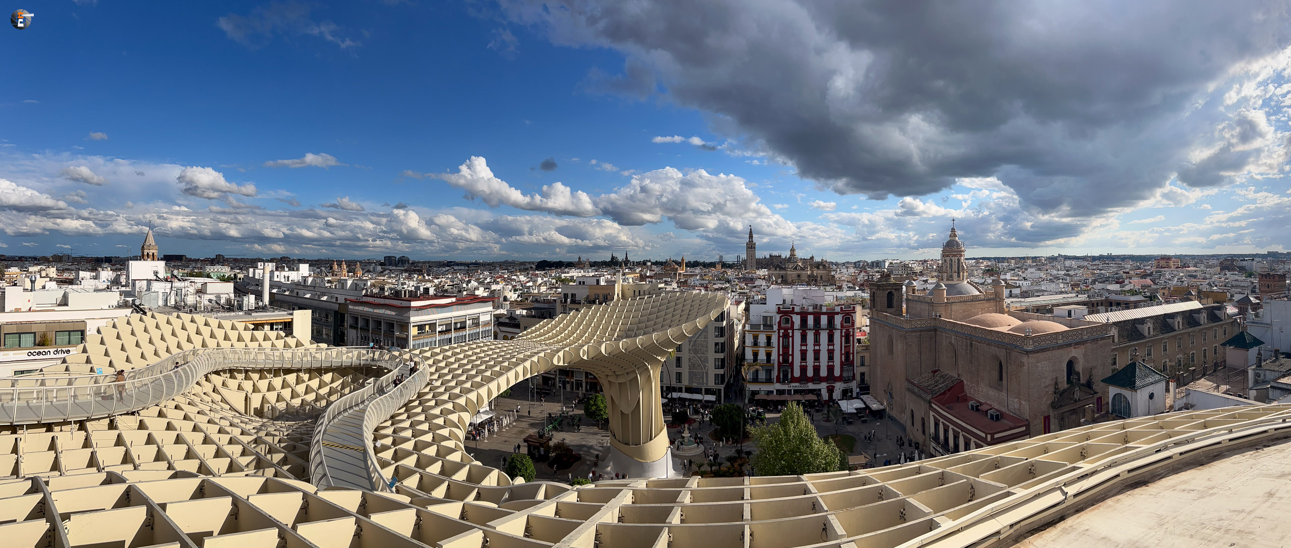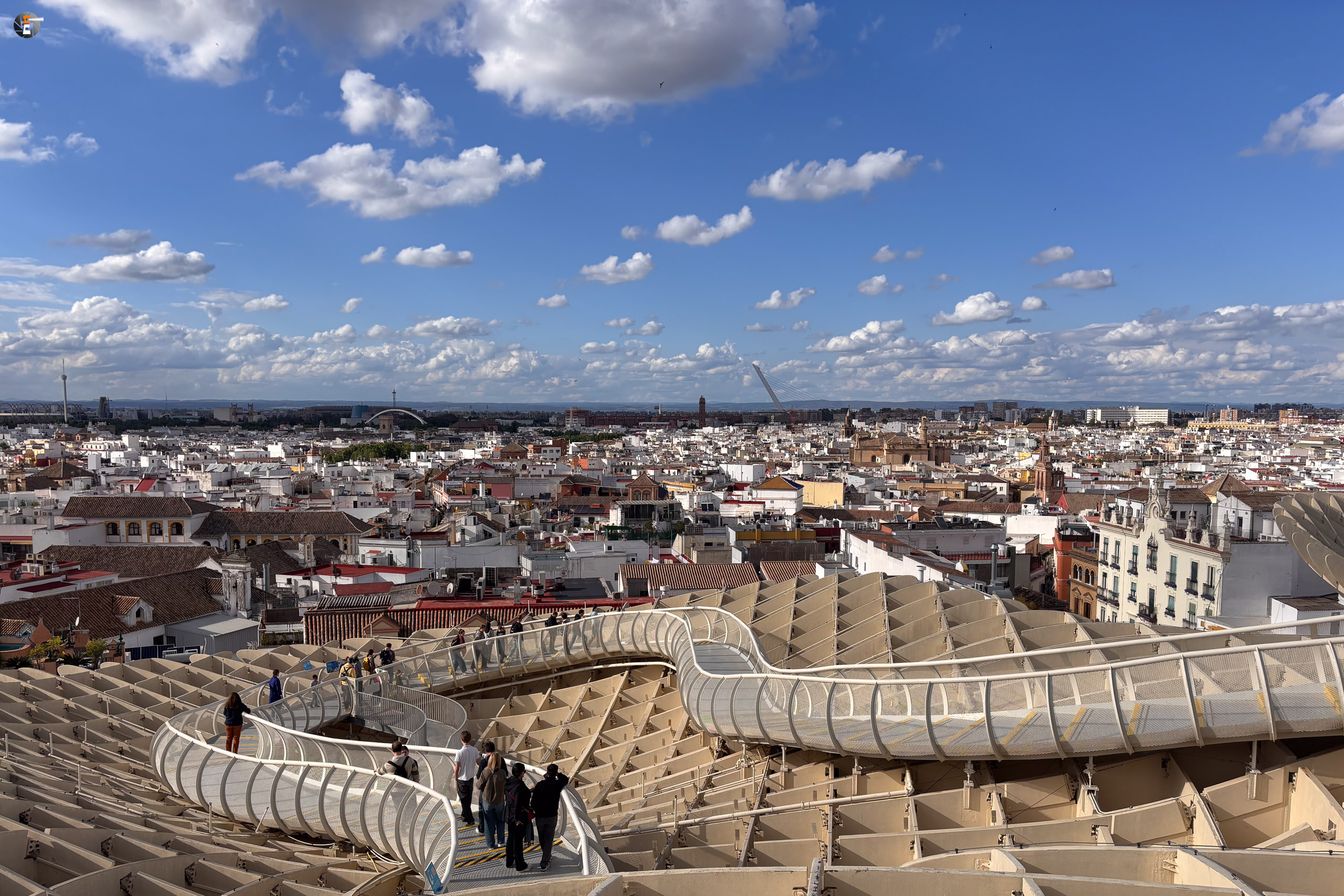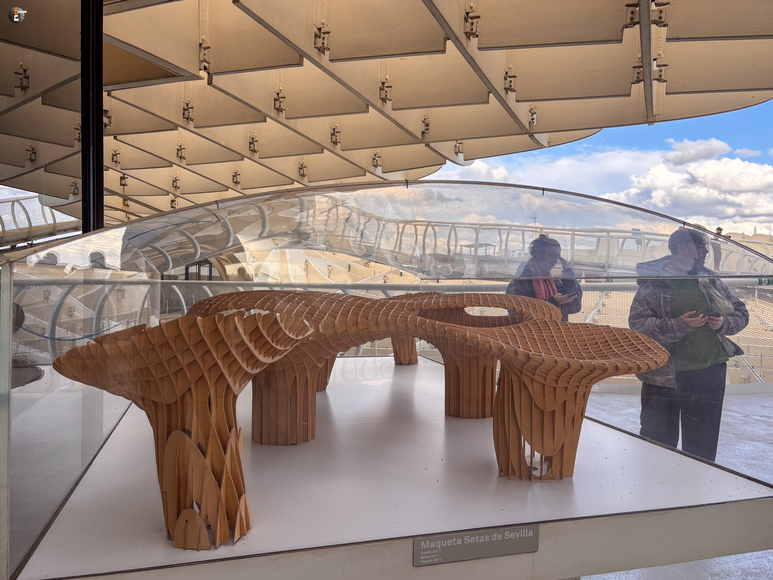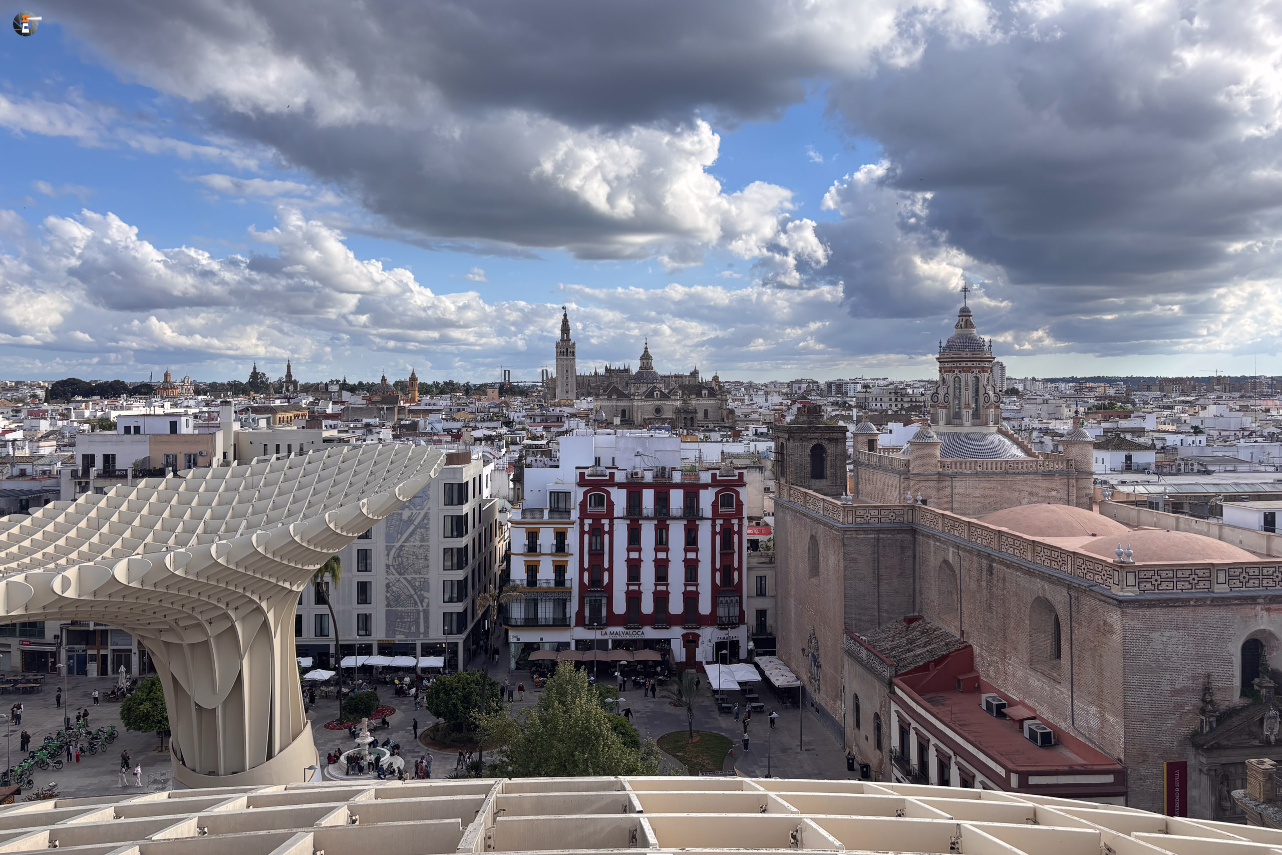 Unser Zettel für den Tag war aber noch nicht ganz abgearbeitet. Im Eilschritt machten wir uns auf den Weg zum Plaza de la Encarnación. Dort befinden sich die „Setas de Sevilla“, eine Hybridkonstruktion aus Holz, Beton und Stahl, welche an Pilze erinnert. Sie wurden von 2004 bis April 2011 gebaut und gelten als die größte Holzkonstruktion der Welt. Für 18:30 Uhr hatten wir noch Tickets ergattert und gerade pünktlich erreichten wir den Ort unseres Begehrens. Leonie kennt diese Konstruktion sogar aus ihrem Studium und wie wir nun wissen, kann sie die Pilze nun von ihrer Bucketlist streichen.