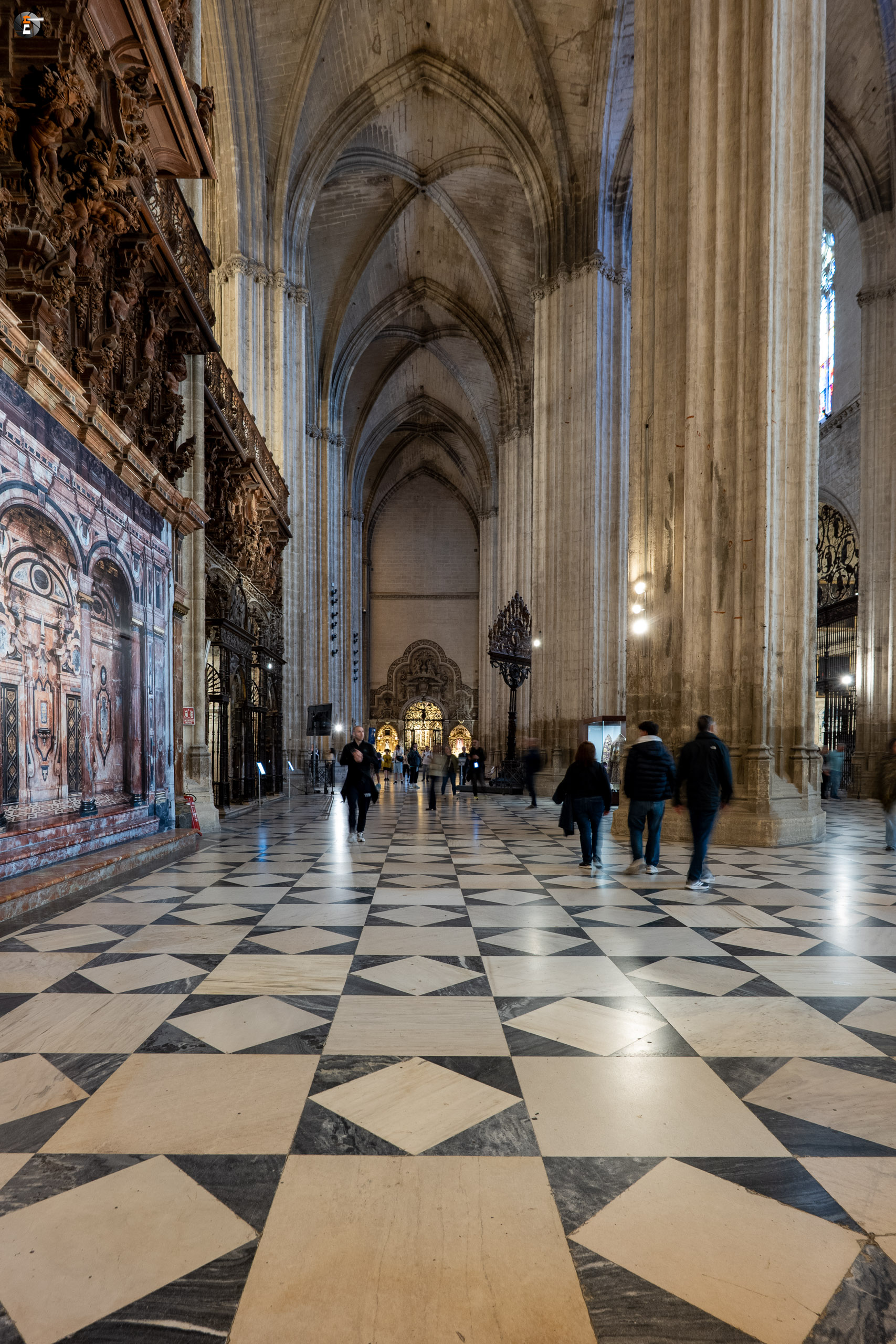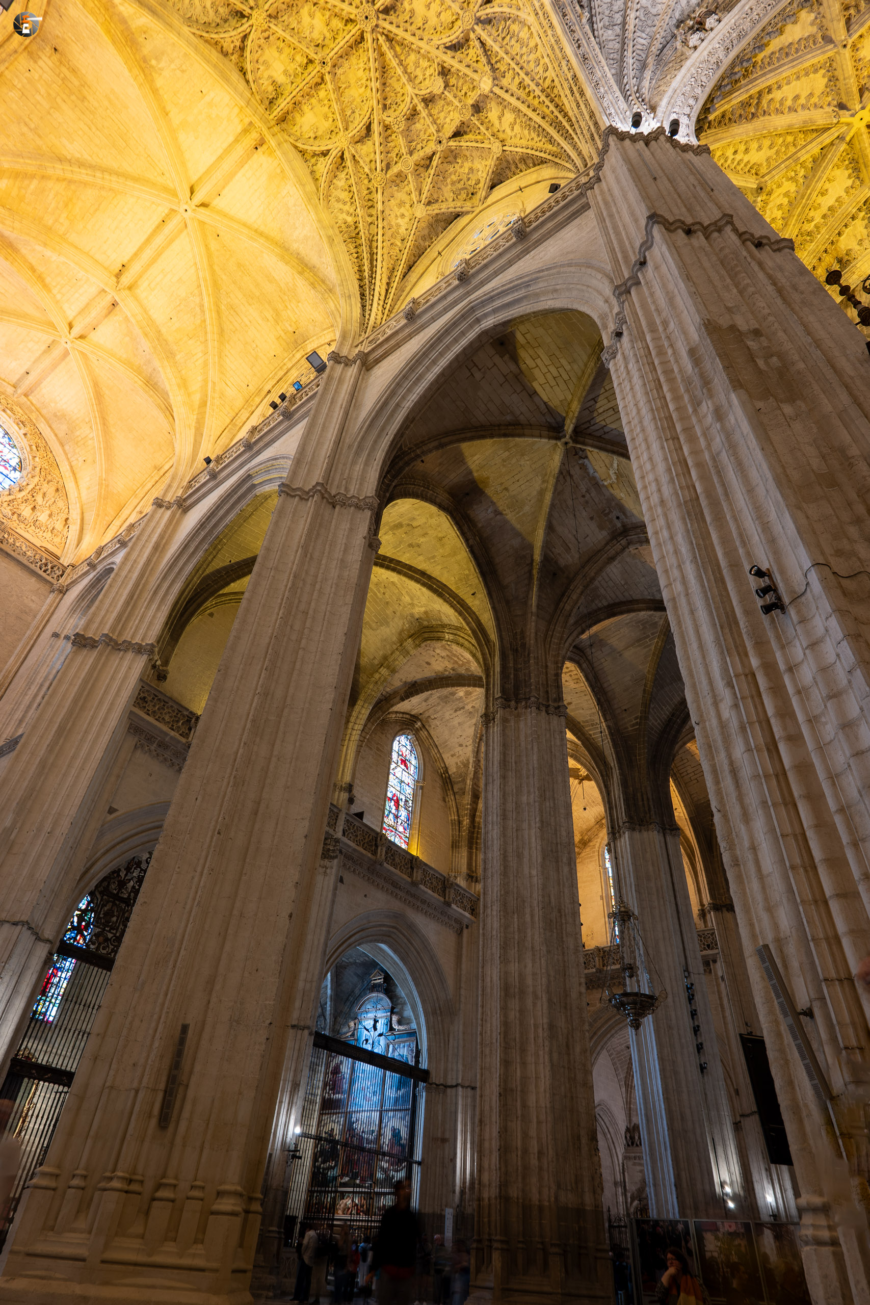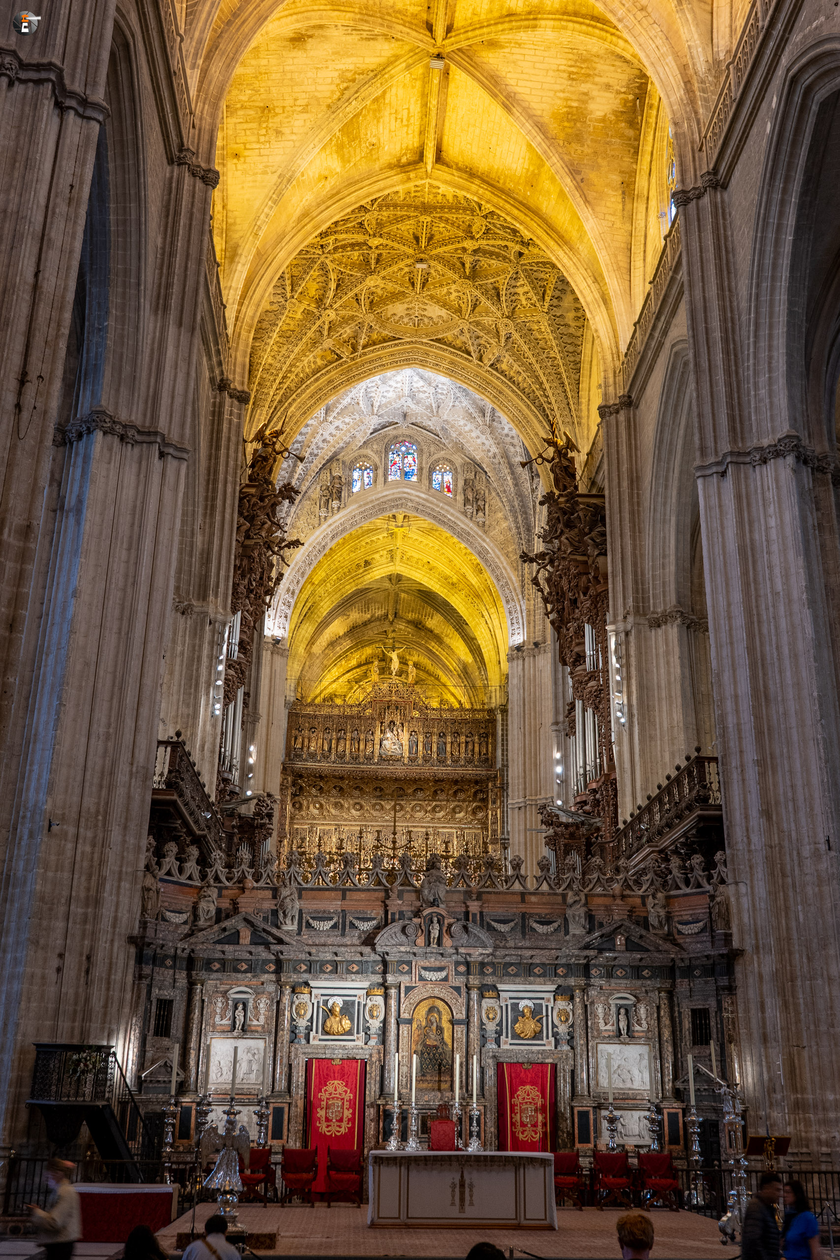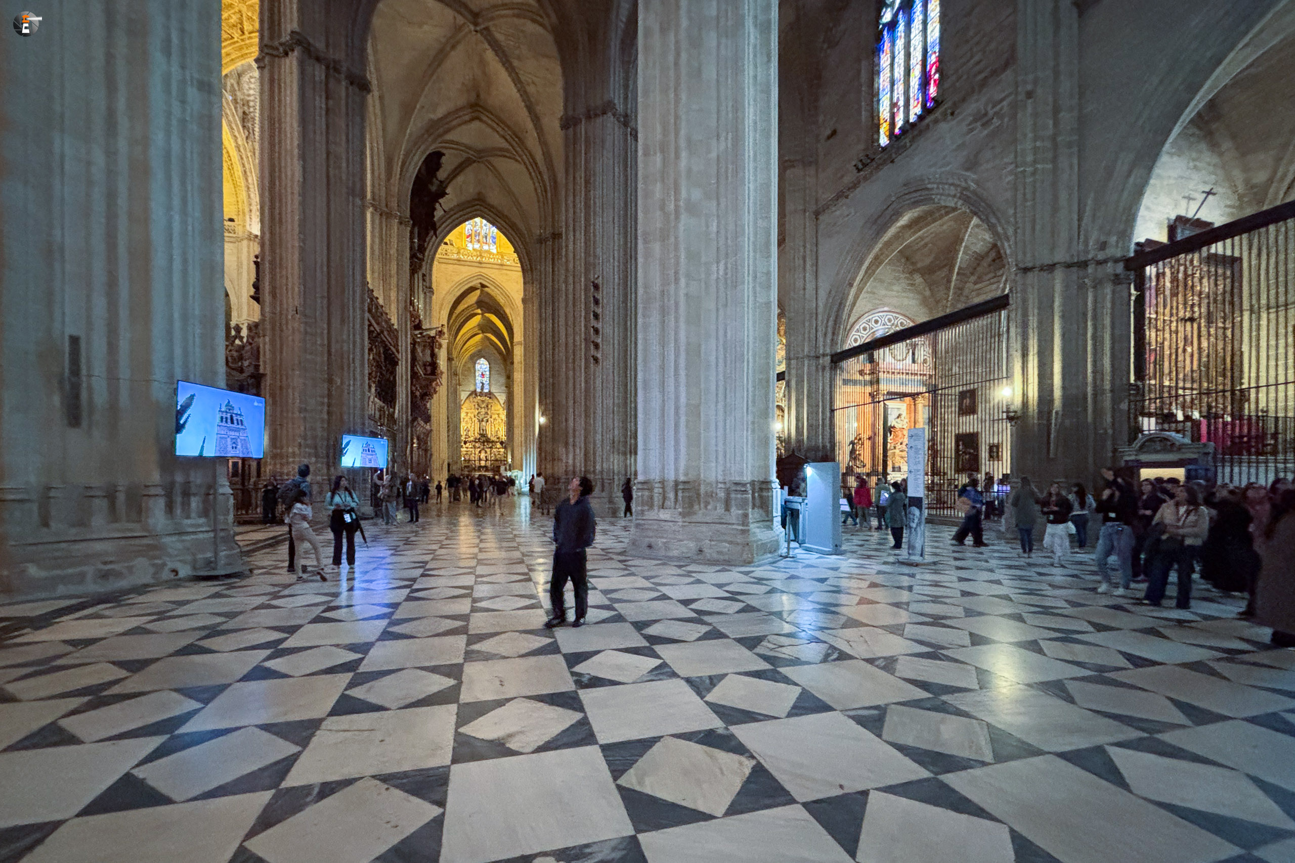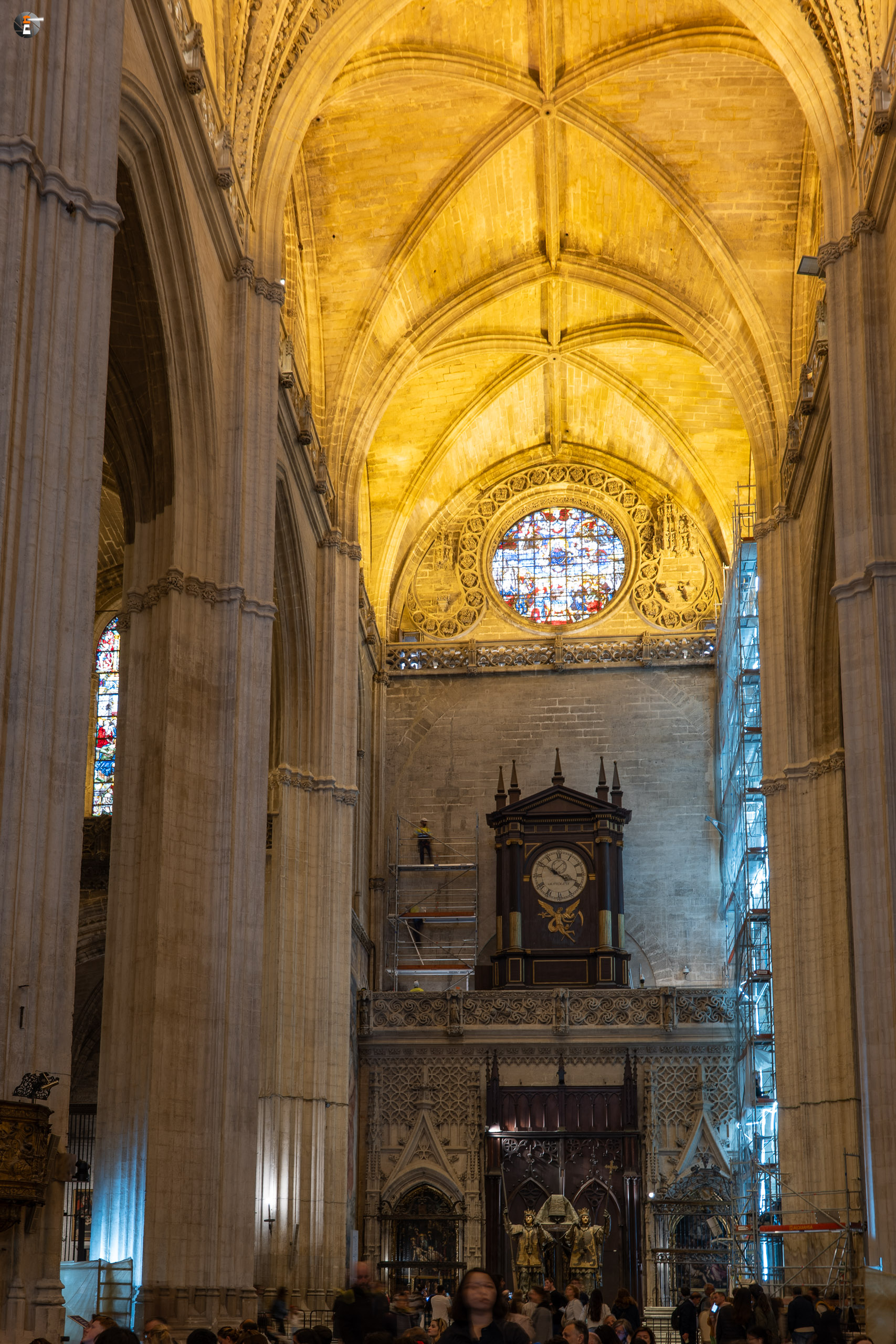 Halb drei treffen wir uns aber alle wieder, um zum Treffpunkt für unsere Kathedralbesichtigung aufzubrechen. Immerhin soll sich das viele Geld, das wir einer Agentur in den Rachen geschmissen haben, auch lohnen. Von einem Guide mit Schirm werden wir an allen Schlangen vorbei zum Fuße der Giralda gelotst. Ab dann sind wir freie Menschen mit einem Audioguide. So frei, wie man ist, wenn man in einer Schlange anderer Menschen auf einen hohen Turm läuft. Aber am Ende lohnt es sich immer. Mit ein ganz klein wenig warten ist es uns min allen Himmelsrichtungen gelungen, einen Blick auf Sevilla zu erhaschen. Die Stadt ist echt schön und auf jeden Fall immer wieder eine Reise wert. Wir waren ja schon einige Male hier. Zurück in der Kathedrale schaut sich ein jeder von uns das an, worauf er gerade Lust hat, dem Audioguide sei Dank! Keinesfalls zu übersehen ist für alle dabei das Grab des Kolumbus, der hier, wie es sein Wunsch war, nicht in spanischer Erde ruht.