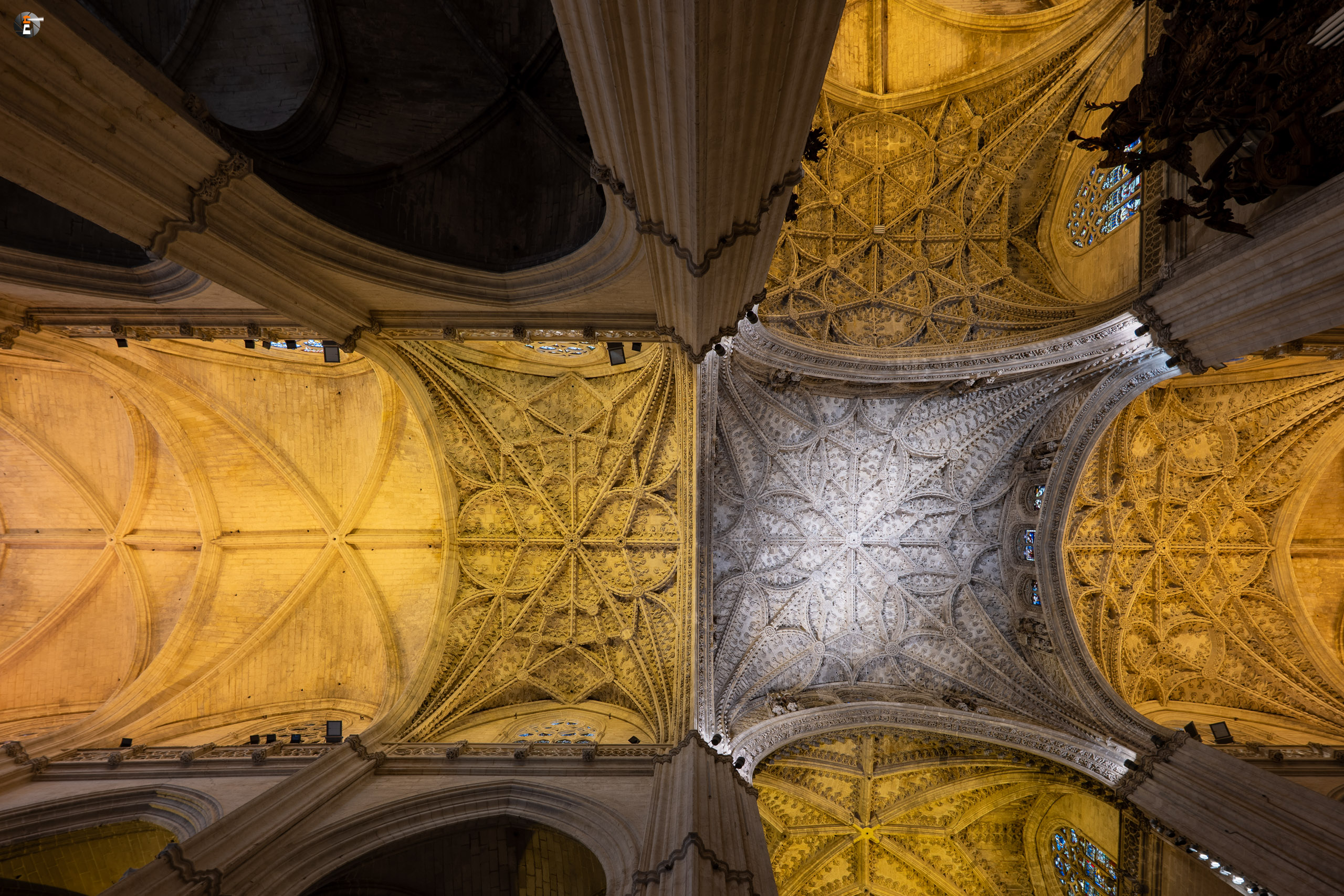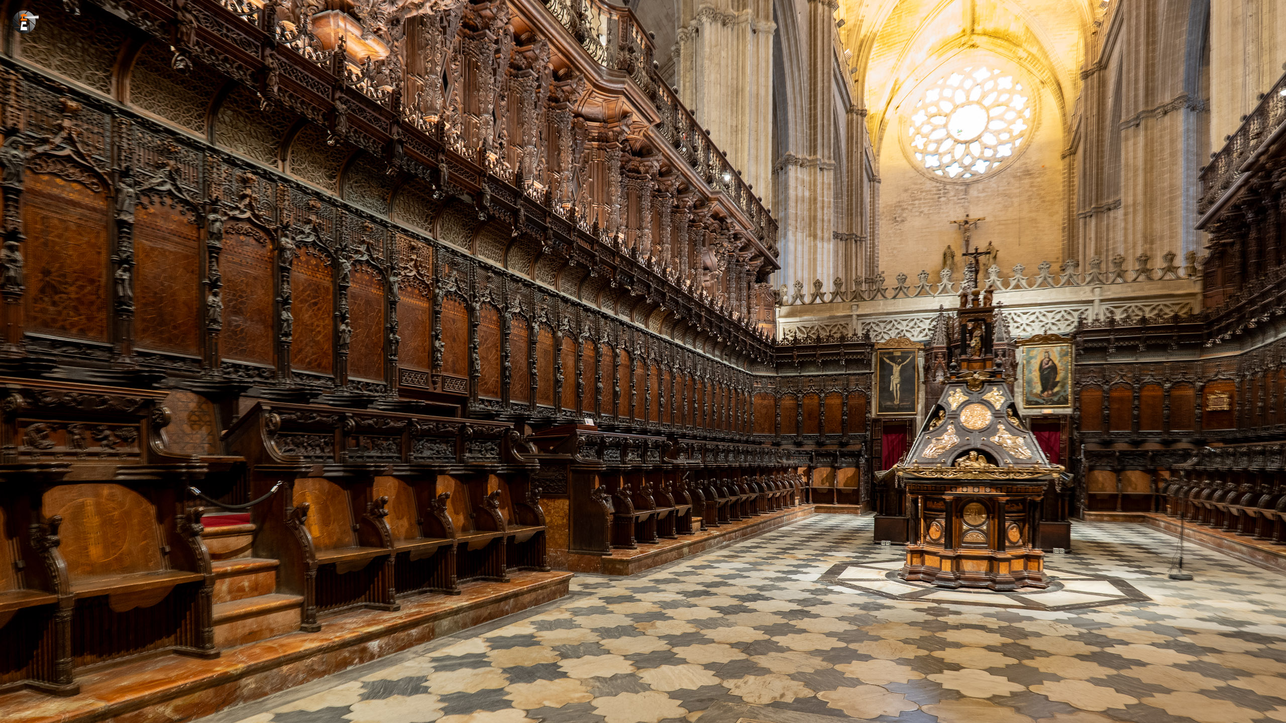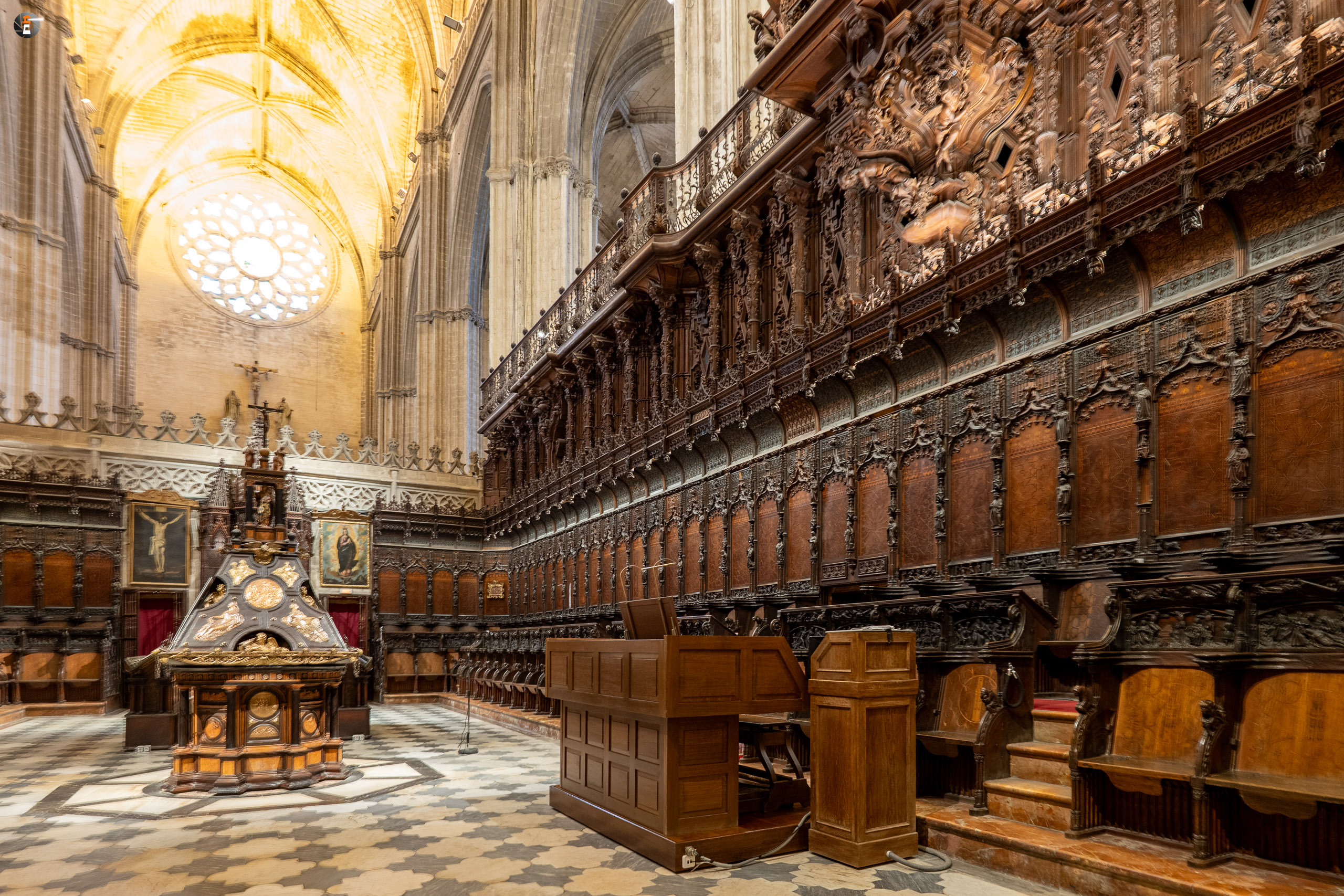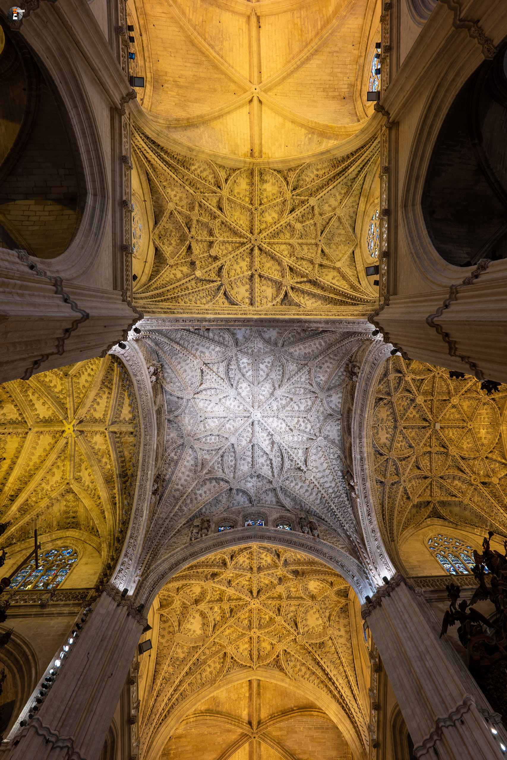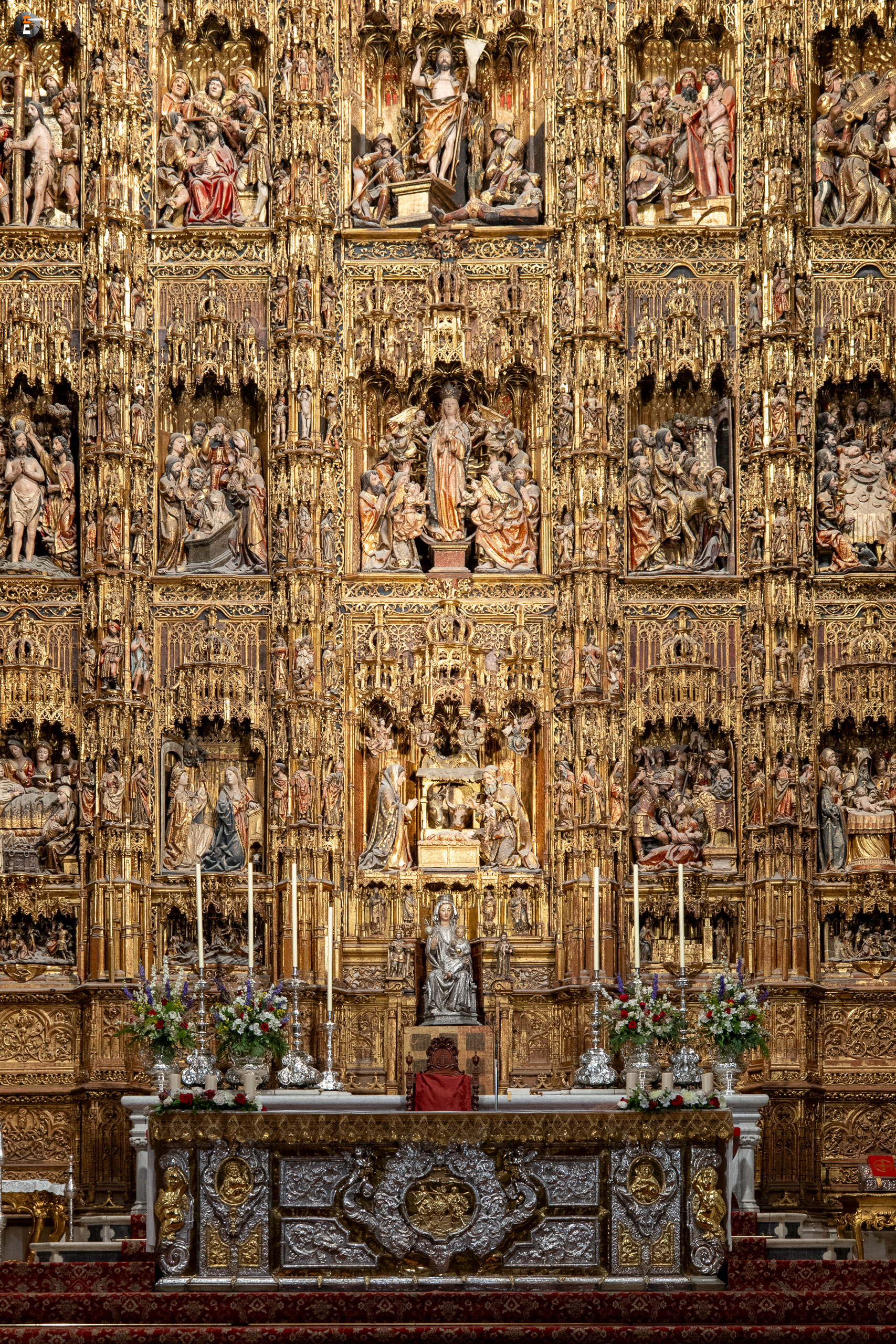 Halb drei treffen wir uns aber alle wieder, um zum Treffpunkt für unsere Kathedralbesichtigung aufzubrechen. Immerhin soll sich das viele Geld, das wir einer Agentur in den Rachen geschmissen haben, auch lohnen. Von einem Guide mit Schirm werden wir an allen Schlangen vorbei zum Fuße der Giralda gelotst. Ab dann sind wir freie Menschen mit einem Audioguide. So frei, wie man ist, wenn man in einer Schlange anderer Menschen auf einen hohen Turm läuft. Aber am Ende lohnt es sich immer. Mit ein ganz klein wenig warten ist es uns min allen Himmelsrichtungen gelungen, einen Blick auf Sevilla zu erhaschen. Die Stadt ist echt schön und auf jeden Fall immer wieder eine Reise wert. Wir waren ja schon einige Male hier. Zurück in der Kathedrale schaut sich ein jeder von uns das an, worauf er gerade Lust hat, dem Audioguide sei Dank! Keinesfalls zu übersehen ist für alle dabei das Grab des Kolumbus, der hier, wie es sein Wunsch war, nicht in spanischer Erde ruht.